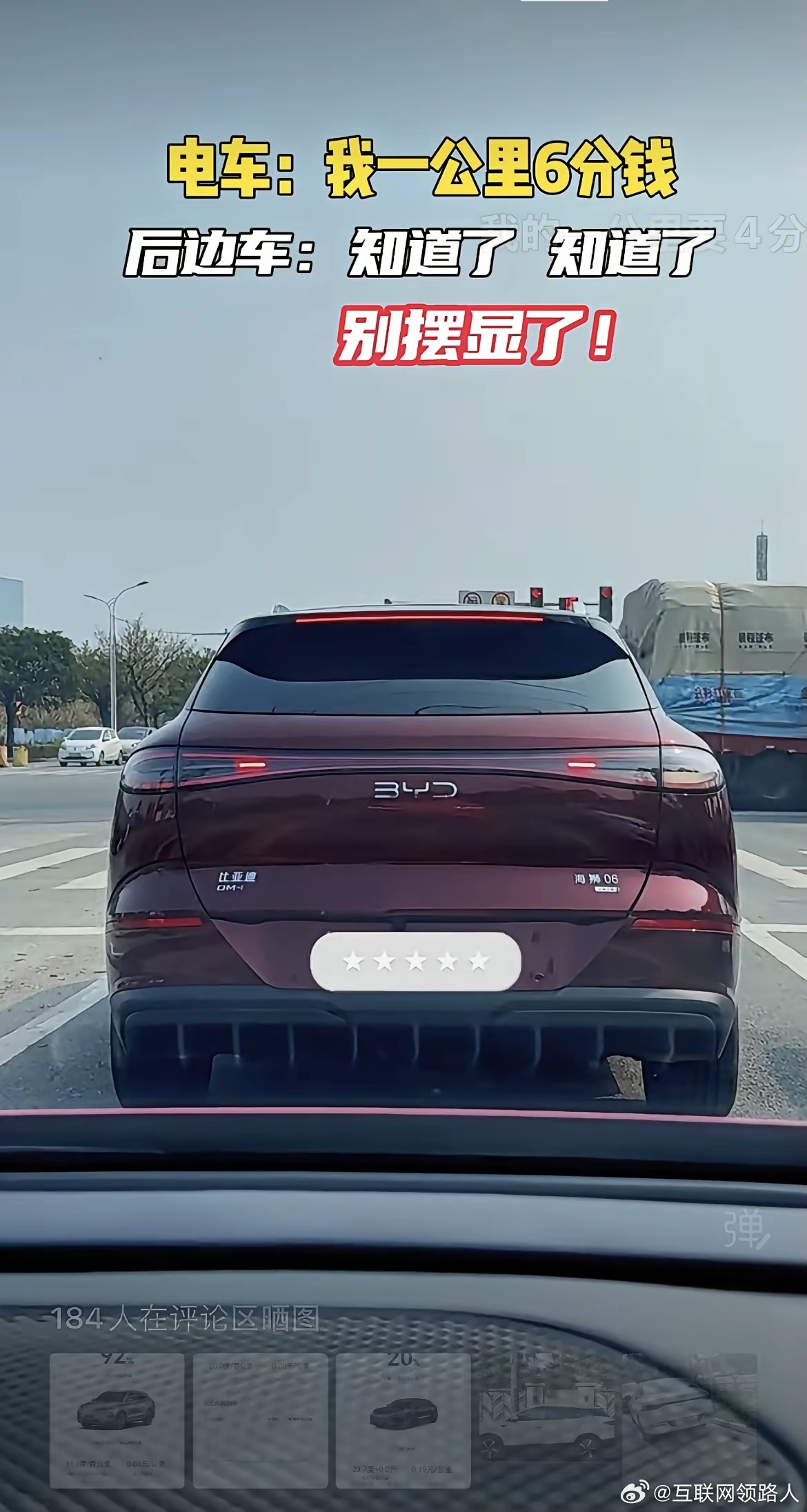 比亚迪电车打开后备箱:我这车一公里才6分钱。后边车:晓得了,晓得了,别显摆啦!大