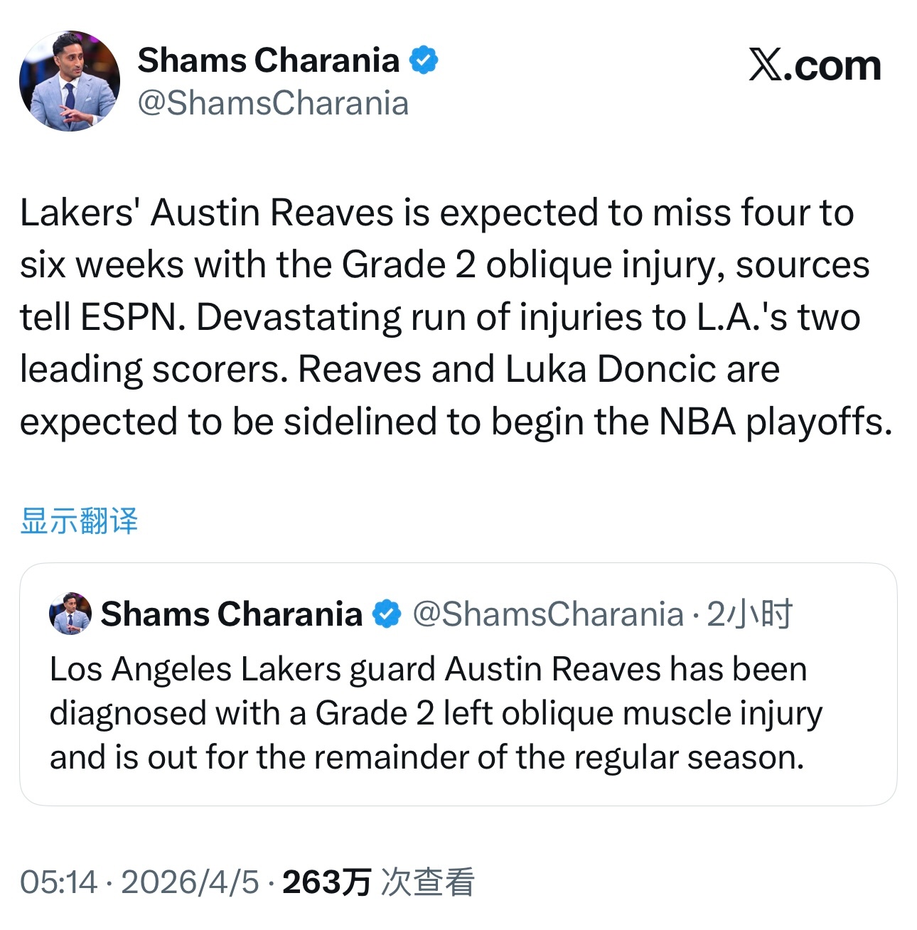 里夫斯也伤了!左侧腹斜肌二级拉伤!!缺席4-6周!!!
