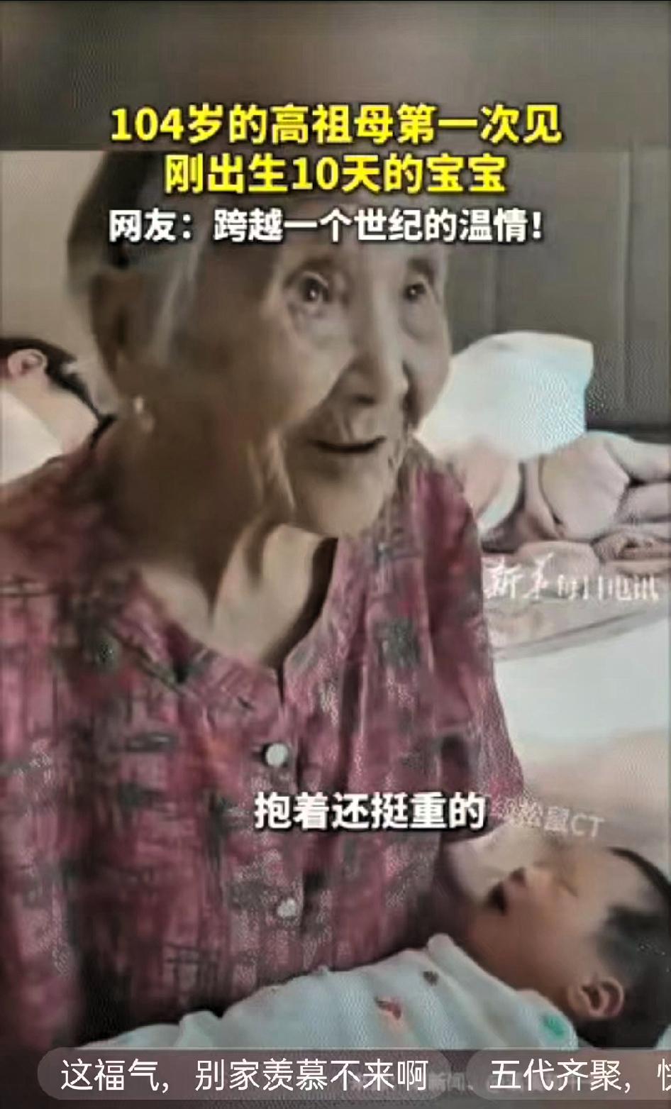 破防了!104岁高祖母第一次见刚出生10天的五世同堂宝宝,却藏着最动人的人间温情,也道出了中国人最朴素的幸福。 104岁的老人,历经百年岁月,步履依旧安稳,面对家中第五代新生命,她没有过多激动的言语,只是双手稳稳地托住襁褓,动作轻柔又谨慎。她缓缓凑近,静静打量着怀里的小宝宝,眼神平和又慈爱,嘴里轻声说着孩子很健康、抱着很踏实,满是岁月沉淀下来的温柔。 襁褓中的婴儿,带着初生的柔软,安然躺在老人怀里,一个是走过百年人生、看尽人间烟火的长者,一个是刚开启人生旅程、满是生机的新生命,百岁的时光差距,在血脉相连的这一刻,变得格外温情。没有惊天动地的情节,只是家人间最自然的相处,却格外治愈人心。 常说家有一老如有一宝,五世同堂更是难得的缘分。我们总在追寻所谓的幸福,其实最珍贵的幸福,从来都不是物质的富足,而是长辈身体健康,家族血脉得以延续,一家人平平安安、相互牵挂。 这份代代相传的亲情,是刻在中国人骨子里的执念,没有轰轰烈烈,却在平淡的日常里,撑起了整个家的温暖。生命的传承,从来都不是轰轰烈烈的宣言,而是这样一代又一代,平淡相守、爱意绵延。 简单的相遇,纯粹的温情,这样的家庭瞬间,是不是也让你觉得格外珍贵?