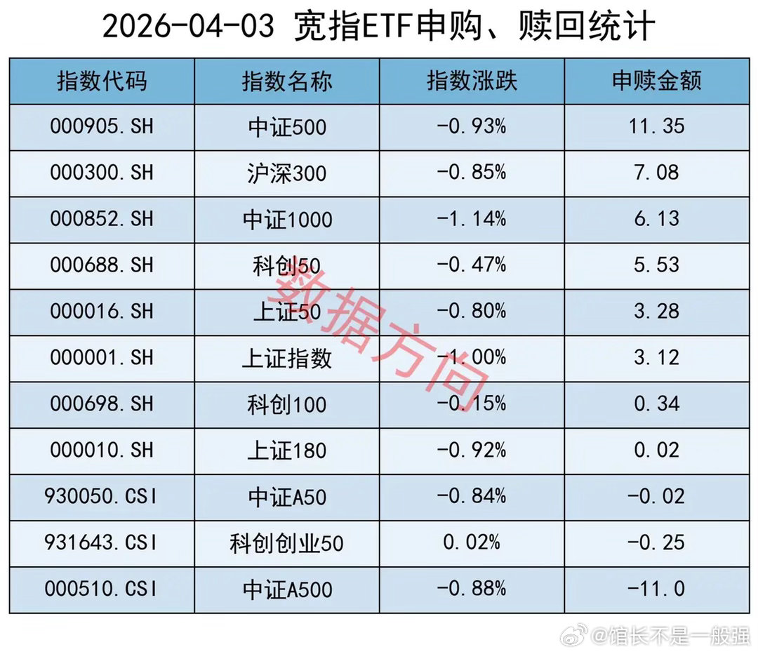 上证50指数(3.28亿)、上证指数(3.12亿)、科创100指数(0.34亿)、上证180指数(0.02亿),分别获小幅净申购。