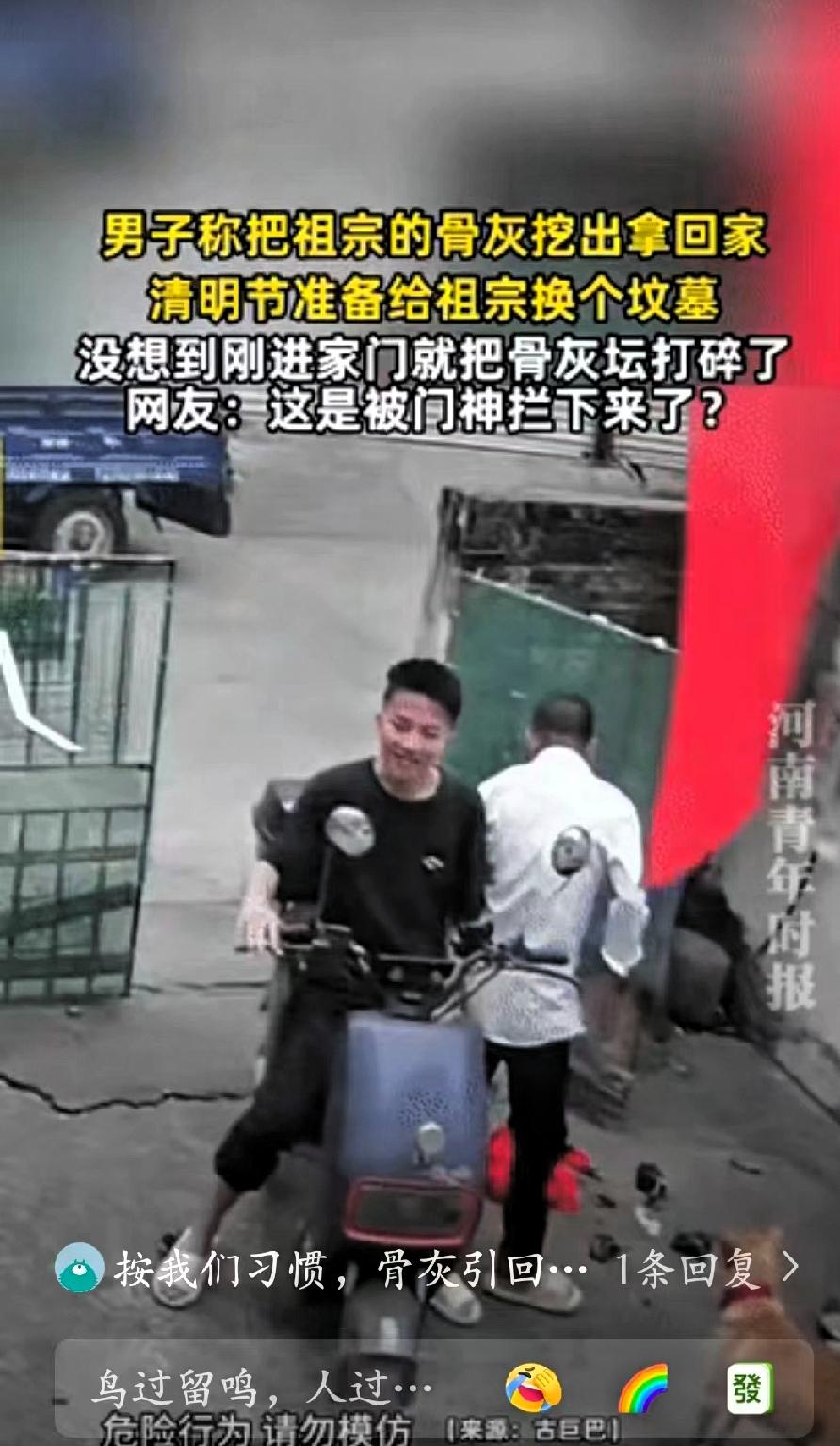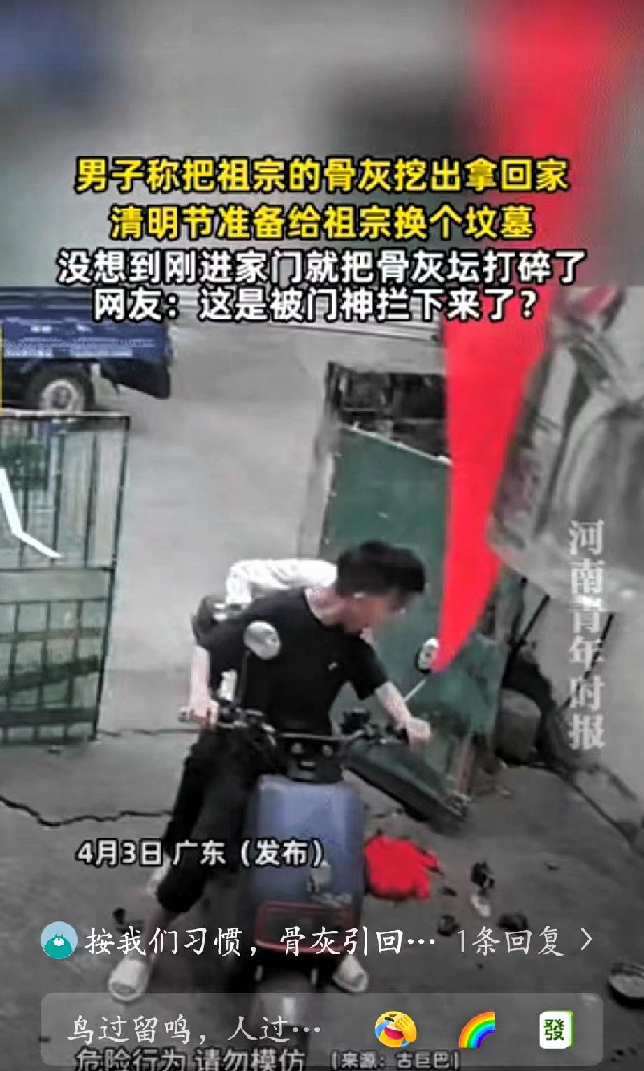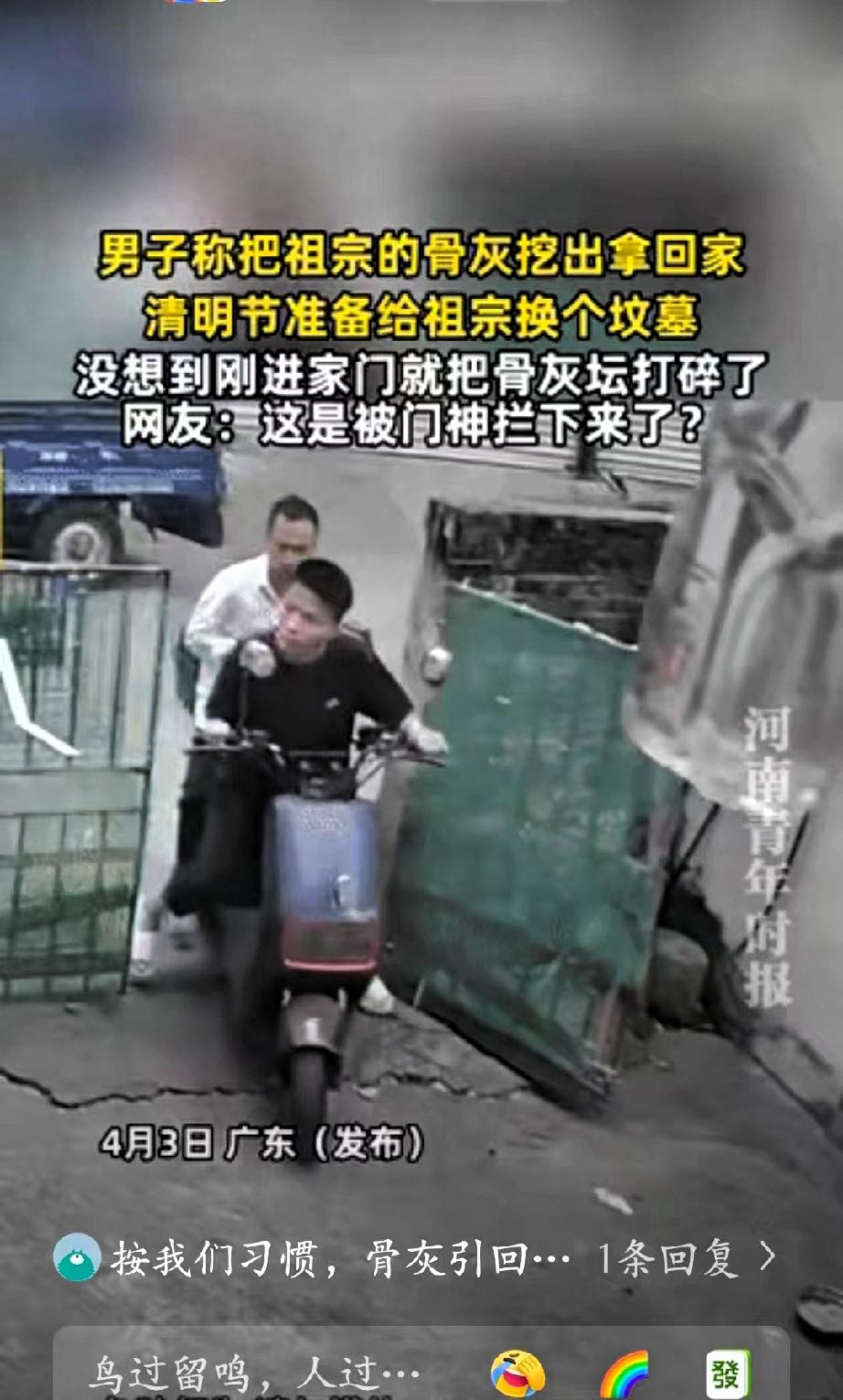 闯大祸了!广东,一男子把祖宗的骨灰挖出来,准备在清明节给祖宗换个坟墓让先祖得到安稳安息。他将骨灰取出后一路护送回家,本以为事情进展顺利,却在进门时发生意外,骨灰坛落地碎裂,骨灰也散落在地。 事发后,男子一时不知所措,情绪十分自责。本是尽孝的一件事,却在最后环节出现疏忽,难免让人心里不安。 网友对此看法不一,有人以宽慰的语气调侃,也有不少人建议及时咨询长辈,按照当地习俗妥善处理,尽量弥补。 清明祭祖、迁坟安葬都是较为严肃的事情,既体现后人的心意,也包含对传统的尊重。这类事情本身流程繁琐,需要格外细心,稍有不慎就容易出现状况。 孝心值得肯定,但行事谨慎同样重要。越是庄重的事,越要稳当处理,才能减少不必要的遗憾。事情已经发生,过度焦虑没有意义,关键是用合适的方式妥善安置,让先人得以安息。 这也提醒大家,在处理祭祖相关事宜时,多一份细致,就少一份疏漏。
