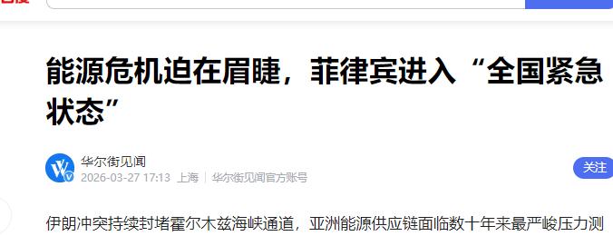菲律宾干了件全世界没一个国家干过的事。他们直接宣布,国家进入紧急状态。不是因为战争,也不是因为天灾,而是因为整个国家的油箱,马上就要见底了。总统马科斯签下那份行政令的时候,整个国家的石油储备,只剩下40天。   很多人都在问,40天之后怎么办?难道整个菲律宾,都要靠推车出行吗?   看看这物价,薄荷岛的柴油直接从50比索涨到了155,翻了整整三倍。当地蹬三轮的车夫,加一升油就要花掉全天收入的四分之一。普通人的日子,难到了极点。   菲律宾这日子,确实过得太不容易了。98%的油靠进口,其中九成还得跨过半个地球运回来。把自己的能源命门,交到别人手里,这样的供应线,根本经不住任何风浪。 现在,许多加油站甚至打出标语,劝大家骑自行车出门。这就足以说明,他们的能源调控已经彻底失灵,普通人的正常生活,相当于被按下了停止键。 屋漏偏逢连夜雨,油荒还没完,粮仓又亮红灯。菲律宾四成化肥靠中国,现在缺口高达82万吨。肚子都快填不饱了,那些硬邦邦的外交辞令显得无比苍白。   前几年,马尼拉把精力全花在海上摩擦和博弈上了。光顾着搞对抗,却忘了修油库、搞储备。这种重安全轻民生的做法,让国家在国际油价波动面前毫无还手之力,国内一下子全乱了套。   眼看要崩,马尼拉赶紧向华盛顿求救,想要买点便宜油。结果呢?美国人只是象征性地放行了两船俄油,区区10万吨,对全国消耗来说塞牙缝都不够。关键时刻,美国的援助确实有点“杯水车薪”。   实在是没辙了,3月27日,菲律宾外交官出现在福建泉州,重启了断了三年的磋商。这回他们态度很务实,急需成品油和化肥。他们主动提出把争议和经贸分开,想在谈判桌上寻一线生机。   马科斯不仅公开感谢中国的化肥,甚至暗示想重新开启南海油气勘探。生存压力面前,面子终究得给里子让路。这说明,能填饱肚子、能开动机器的资源,才是最真实的政治。   但让人纳闷的是,菲律宾现在表现得很矛盾。一边伸手跟邻居要援助,一边又在海面上搞危险动作。这种反复无常,正在透支他们的国家信誉。   马尼拉该认清现实了,虚幻的盟友承诺,远不如务实的邻里关系好使。毕竟,油桶里的储备,永远比演习里的炮弹更能决定一个国家的命运。   信息来源:《能源危机迫在眉睫,菲律宾进入“全国紧急状态”》,华尔街见闻,2026年3月27日。