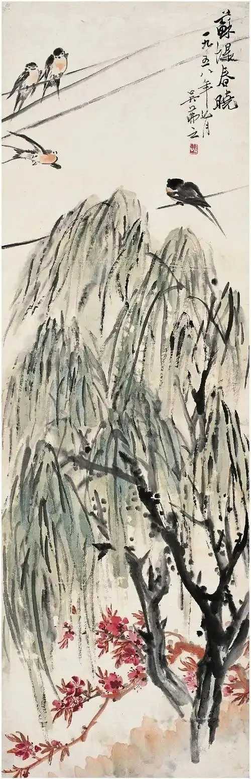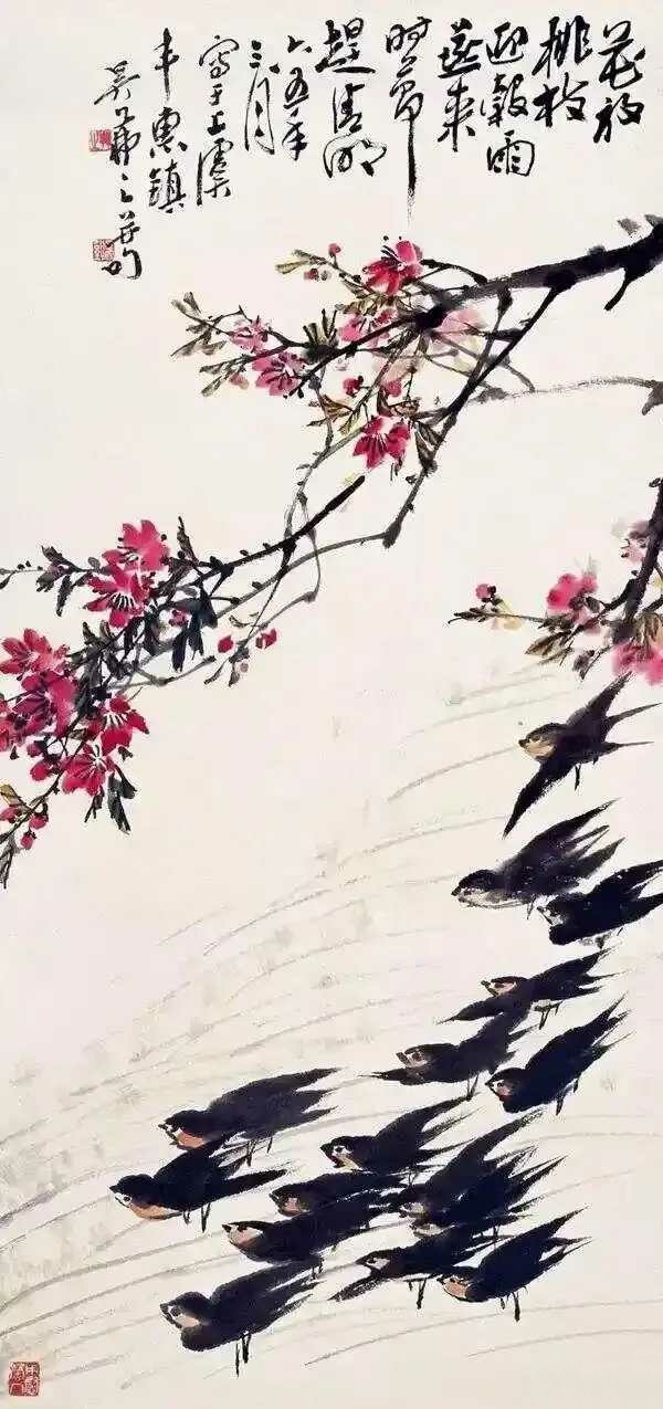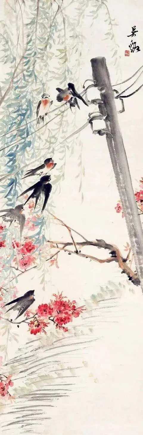 吴茀之绘春燕,婀娜多姿。吴茀之(1900—1977),浙江省浦江县前吴乡前吴村人,初名士绥,改名溪,字茀之,号溪子,别署广明畸士,又号逸道人。以字行。中国花鸟画大师,现代浙派中国画首领人物。