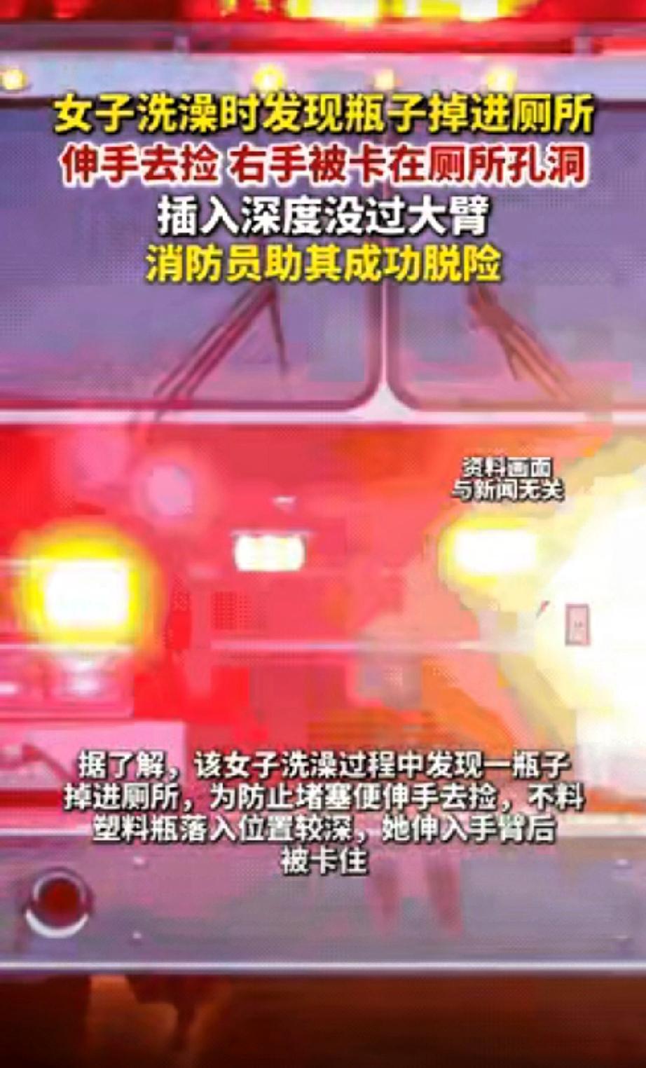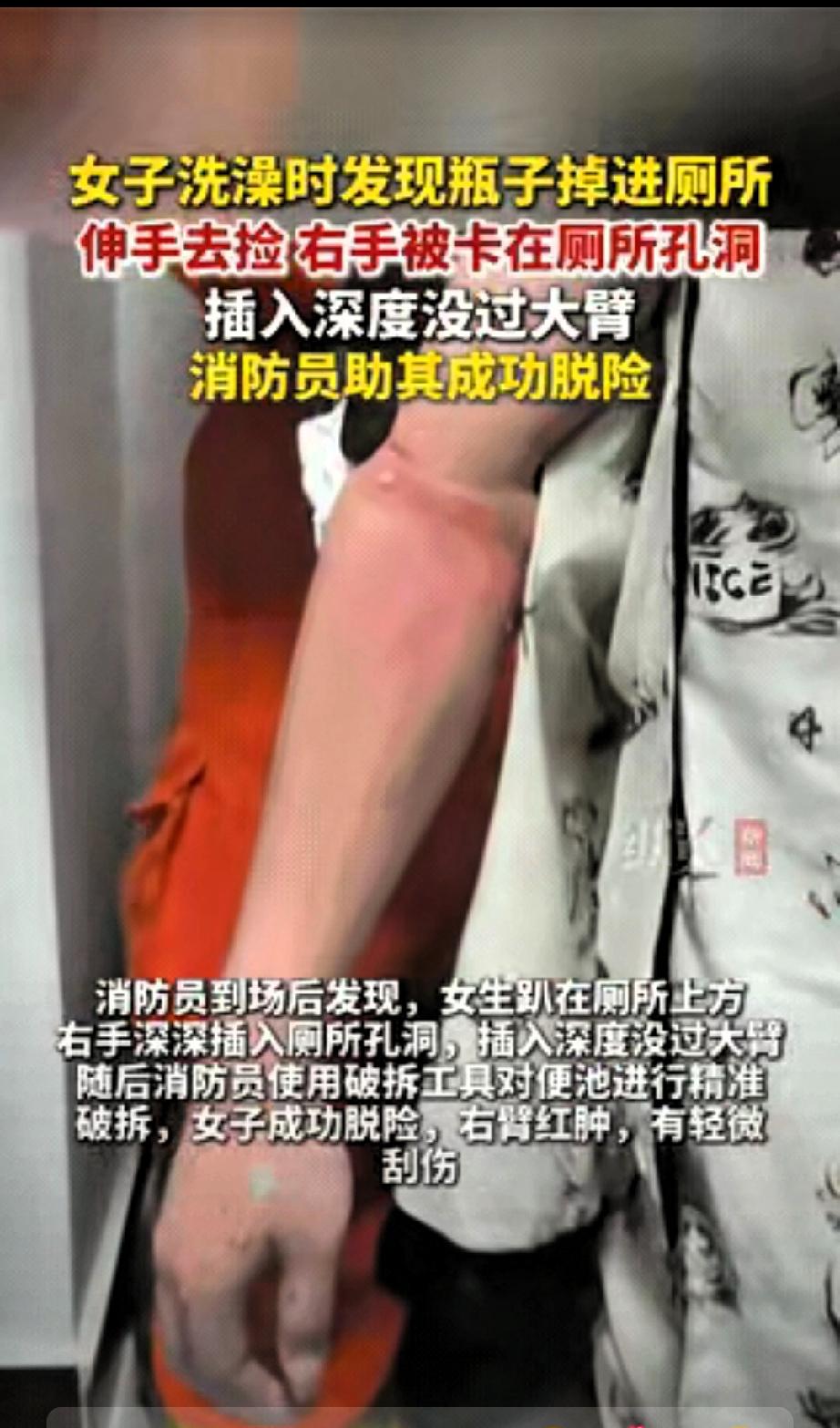 这也太危险了!3月31日晚,广州花都区i狮岭镇一公寓内,一名女子洗澡时,只因塑料瓶不小心掉入厕所,为避免管道堵塞,便伸手去捡拾,不料右手被牢牢卡住,无法脱身。 女子尝试自行拔出手臂,可越是挣扎,被卡得越紧,手臂插入深度已没过大臂,处境十分不便。无奈之下,她只能向消防救援人员求助。消防员抵达现场后,仔细查看现场情况,发现便池空间狭窄,手臂被卡较深,贸然拉扯易造成伤害。 随后,消防员使用专业工具,小心地对便池进行破拆,全程动作轻柔,经过紧张作业,成功将女子手臂救出。经查看,女子手臂仅有红肿和轻微刮伤,并无严重伤情。 这一事件引发不少网友关注,大家纷纷表示,此类小事看似平常,却暗藏安全风险,切勿随意处置。也有网友为消防员的及时救援点赞,感谢他们每次都能快速化解险情。 生活中,物品掉落厕所、下水道是常有的事,很多人会习惯性伸手去掏,却忽略了潜在危险。厕所便池及下水道结构特殊,内部空间狭小,肢体伸入后,容易因负压或结构问题被卡住,盲目行动只会让自己陷入困境。 遇到此类情况,不必急于自行处理,盲目动手反而容易引发意外。最稳妥的方式,是联系专业维修人员,或是向消防部门求助,依靠专业工具和方法解决问题。 日常起居里,很多意外都源于一时的疏忽,无论做什么事,都要多留意自身安全,不抱有侥幸心理,远离可避免的危险,平平安安才是最重要的
