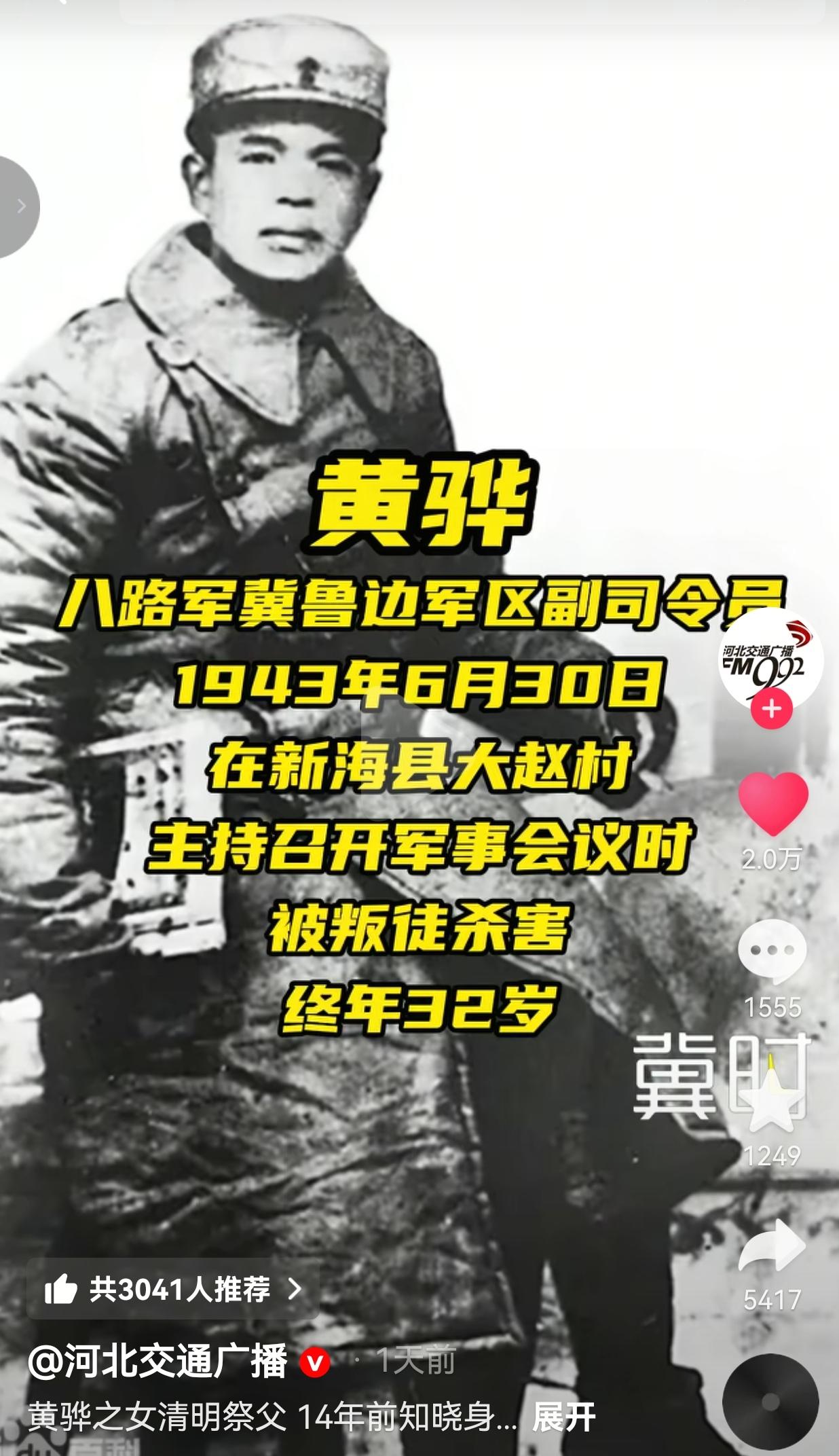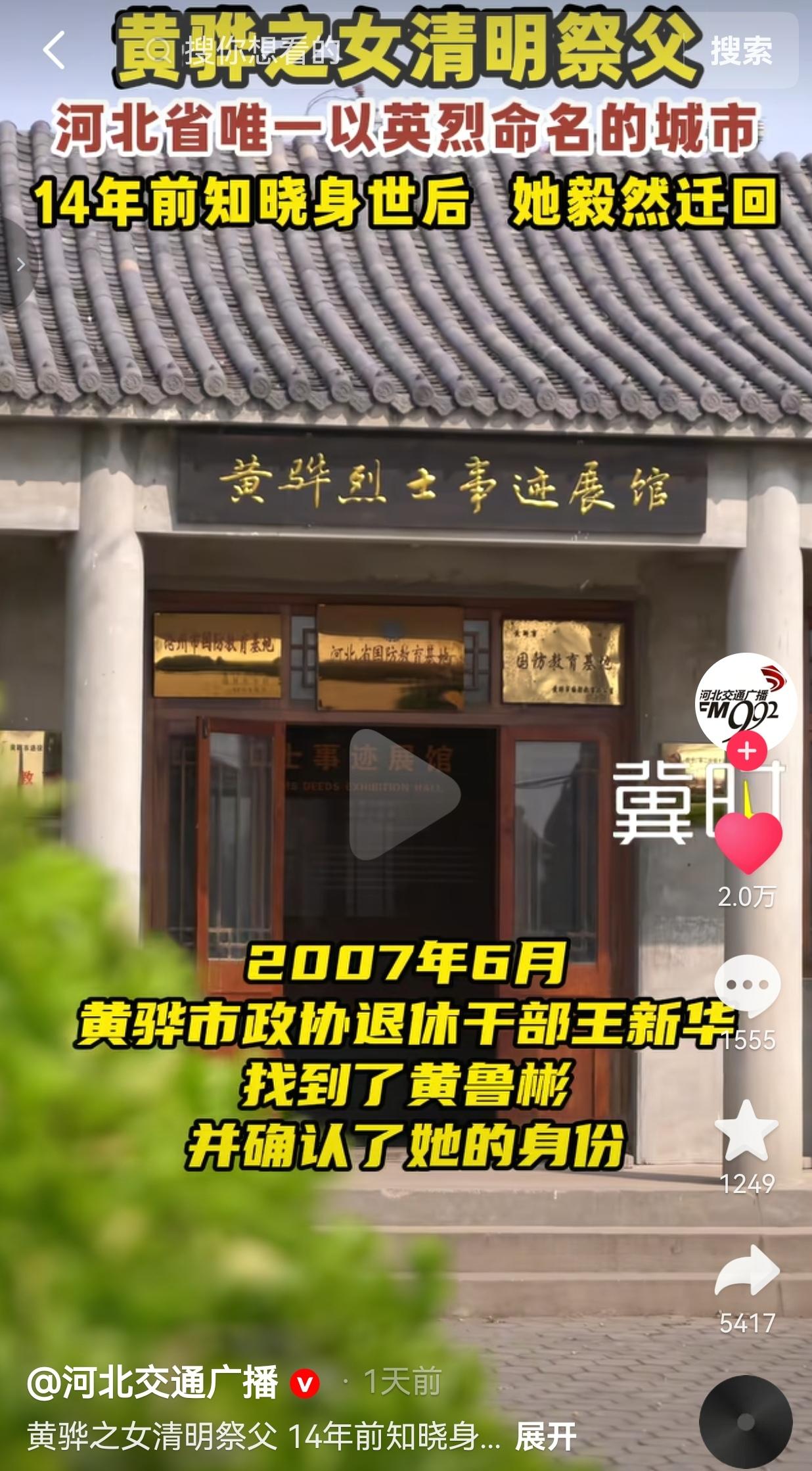 看哭了!河北黄骅,这座河北省唯一以英烈命名的城市,清明这天迎来了最让人泪目的一幕:黄骅烈士的女儿黄鲁彬,时隔70多年,终于回到了父亲用生命守护的土地,在父亲的雕像前,完成了一场迟到了一辈子的父女团圆。 故事要从1943年说起。当时,黄骅是八路军冀鲁边军区副司令员,是让日寇闻风丧胆的抗日英雄。 可就在1943年6月30日,他在新海县大赵村主持军事会议时,被叛徒残忍杀害,年仅32岁。而此时,他的女儿黄鲁彬,才刚刚出生1个月,还没来得及叫一声爸爸,就永远失去了父亲。 黄鲁彬的母亲顾兰青,带着襁褓中的女儿一路转移,历经千辛万苦,解放后到了浙江杭州工作生活。 为了不让女儿活在仇恨里,母亲一直没告诉她身世,直到1977年母亲临终前,才拉着女儿的手说出真相:“你是黄骅的女儿。” 那一刻,黄鲁彬才知道,自己的父亲,是那个用名字命名了一座城的英雄。 可她对父亲的印象,只有一张模糊的老照片,她总说:“我生下来的时候他还没牺牲,他肯定抱过我,可我一点都记不得了。” 2007年,黄骅市政协退休干部王新华找到了黄鲁彬,确认了她的身份。 同年6月27日,黄鲁彬第一次回到黄骅,参加父亲牺牲地大赵村惨案遗址纪念馆的修复落成仪式。 站在父亲的雕像前,看着父亲的照片,这个年近古稀的老人,哭得像个没家的孩子。 为了能离父亲更近一点,2012年,已经退休的黄鲁彬,毅然带着丈夫举家从杭州迁回黄骅定居。她说:“我希望有生之年,多为大家服务,让更多人了解我父亲,了解那段历史。” 今年清明,80多岁的黄鲁彬,再次来到大赵村惨案遗址,给父亲献上鲜花。她坐在轮椅上,看着父亲的雕像,眼神里全是思念,那是跨越了70多年的父女情,是一个女儿对英雄父亲最深情的告白。 网友看到后评论说:黄骅市,每一个字都是英雄的鲜血!黄鲁彬奶奶,您终于回家了! 也有的网友说:出生一个月就没了爸爸,一辈子都在找爸爸,最后举家迁回爸爸的城市,这是什么样的家国情怀!破防了! 还有的网友说:看完直接泪崩!我们今天的安稳日子,都是黄骅这样的英雄用命换来的!向英雄致敬,向英雄家属致敬! 也有的网友说:黄骅是我们沧州的骄傲!黄鲁彬奶奶,欢迎回家! 说实话,看哭了!黄骅烈士,32岁牺牲,用生命换来了我们今天的太平盛世,用名字永远留在了这片他守护的土地上。而他的女儿黄鲁彬,一辈子都在寻找父亲的痕迹,从杭州到黄骅,跨越千里,只为离父亲更近一点。 这是什么?这就是刻在中国人骨子里的家国情怀!父亲为国捐躯,女儿用一生追随父亲的脚步,把父亲的精神传承下去,让更多人记住英雄,记住那段不能忘的历史。 我们总说,哪有什么岁月静好,不过是有人替你负重前行。黄骅烈士,就是那个替我们负重前行的人。而黄鲁彬奶奶,就是那个替我们记住英雄的人。 很多人活了一辈子,都不知道自己的根在哪里。可黄鲁彬奶奶知道,她的根,在黄骅,在父亲用生命守护的这片土地上。她举家迁回,不是为了名利,只是为了能离父亲更近一点,只是为了让更多人记住父亲,记住英雄。 这才是真正的传承!这才是我们中国人的脊梁! 英雄从未远去,精神永远传承。黄骅烈士用生命守护了我们的家园,黄鲁彬奶奶用一生传承了英雄的精神。 我们永远不能忘记,今天的太平盛世,是无数像黄骅一样的英雄用命换来的;我们永远不能忘记,那些为了国家、为了民族,抛头颅、洒热血的英雄们。 最后我想说的是:一座城,一个名,一辈子,一份情!英雄从未远去,精神永垂不朽!