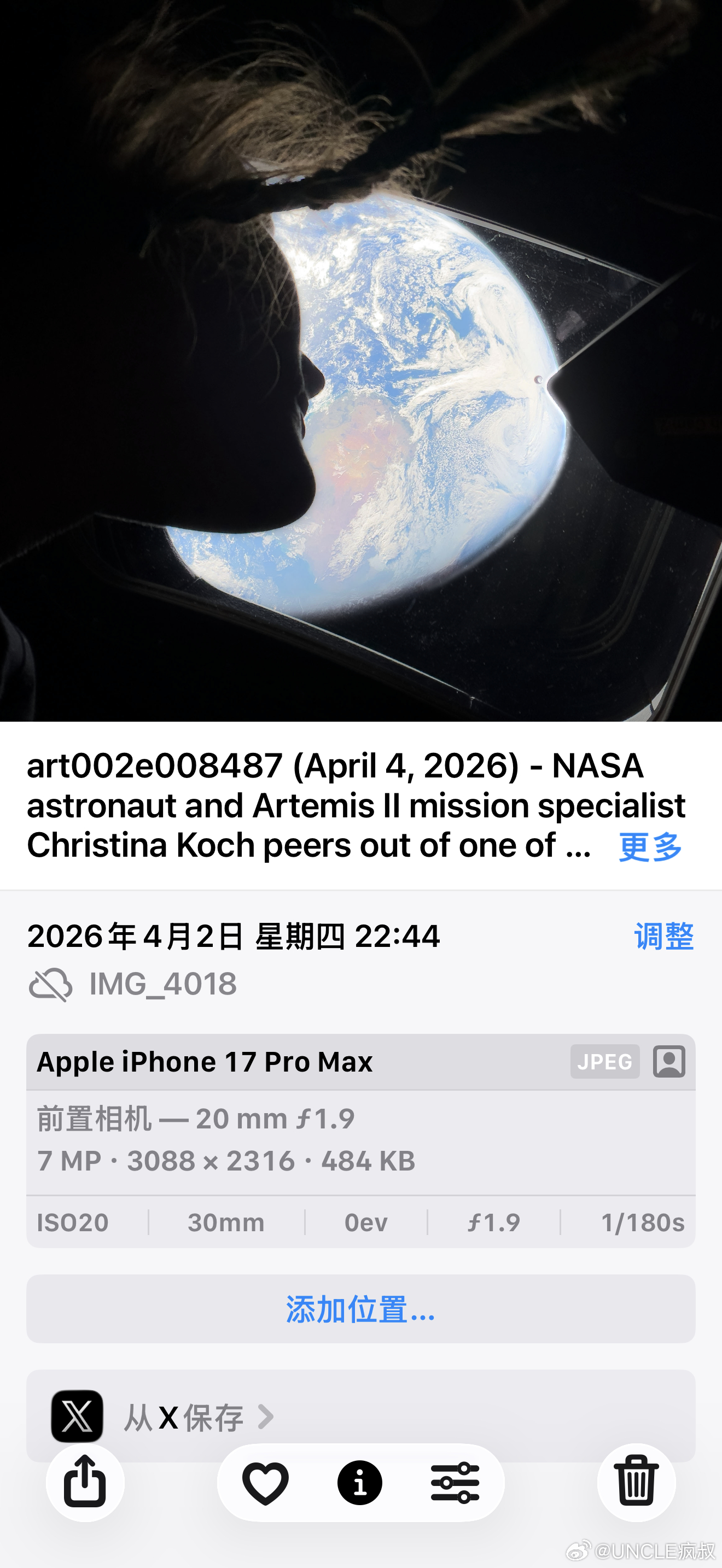 NASA公布了阿尔忒弥斯2号宇航员使用iPhone 17 Pro Max拍摄的近月弦窗照,如果你是保存的原图,还能看到由iPhone记录下来的详细拍摄信息。