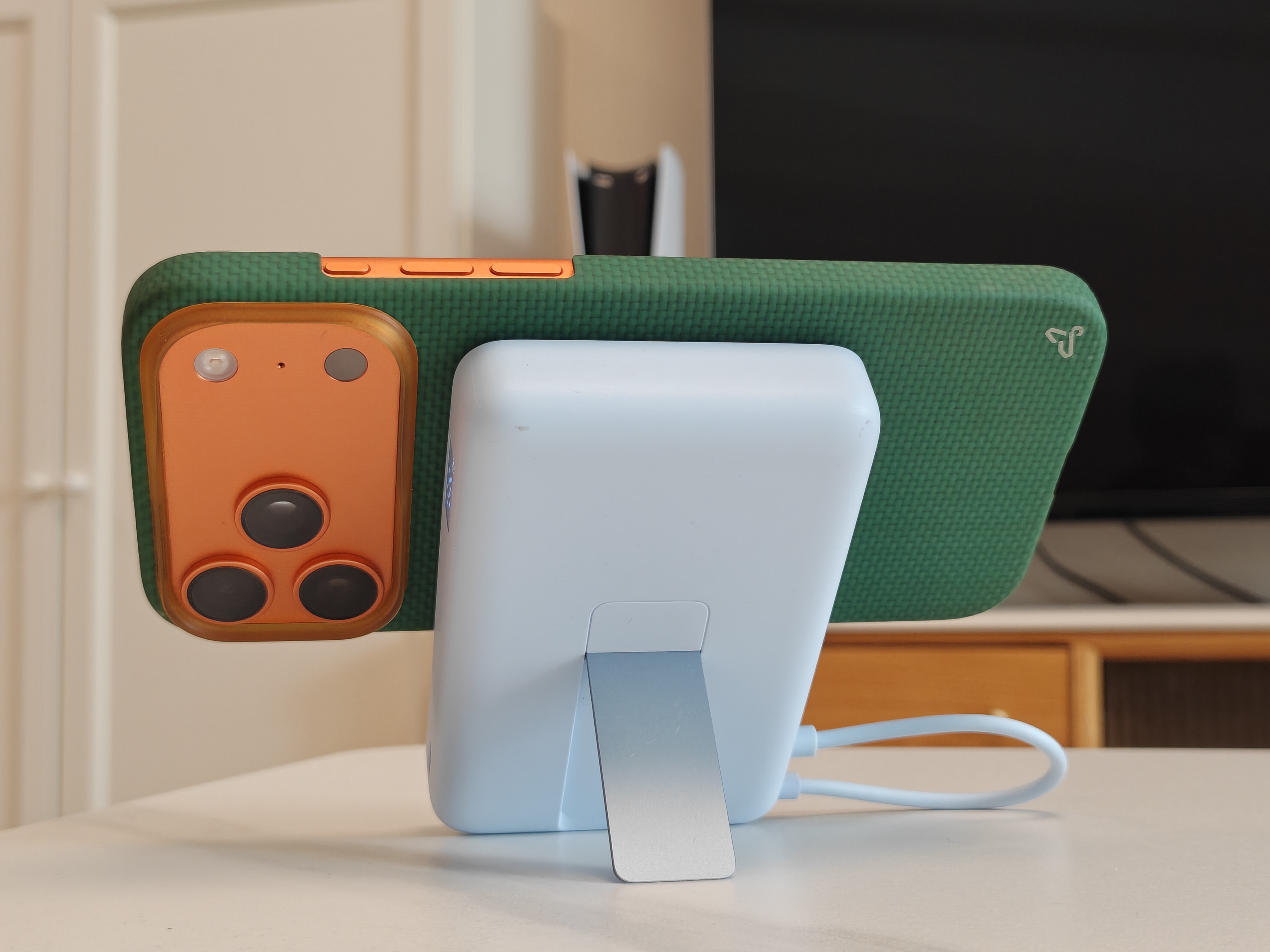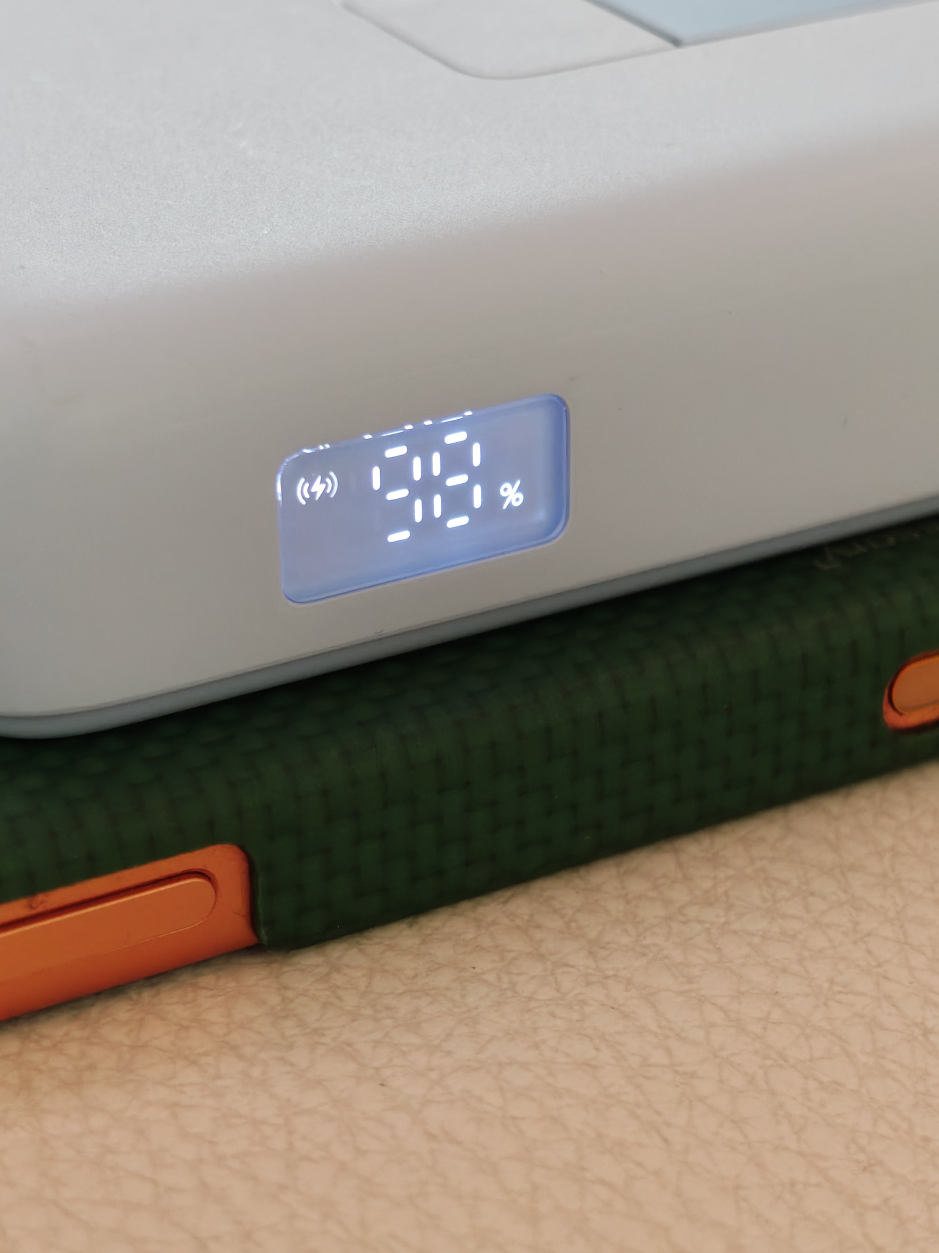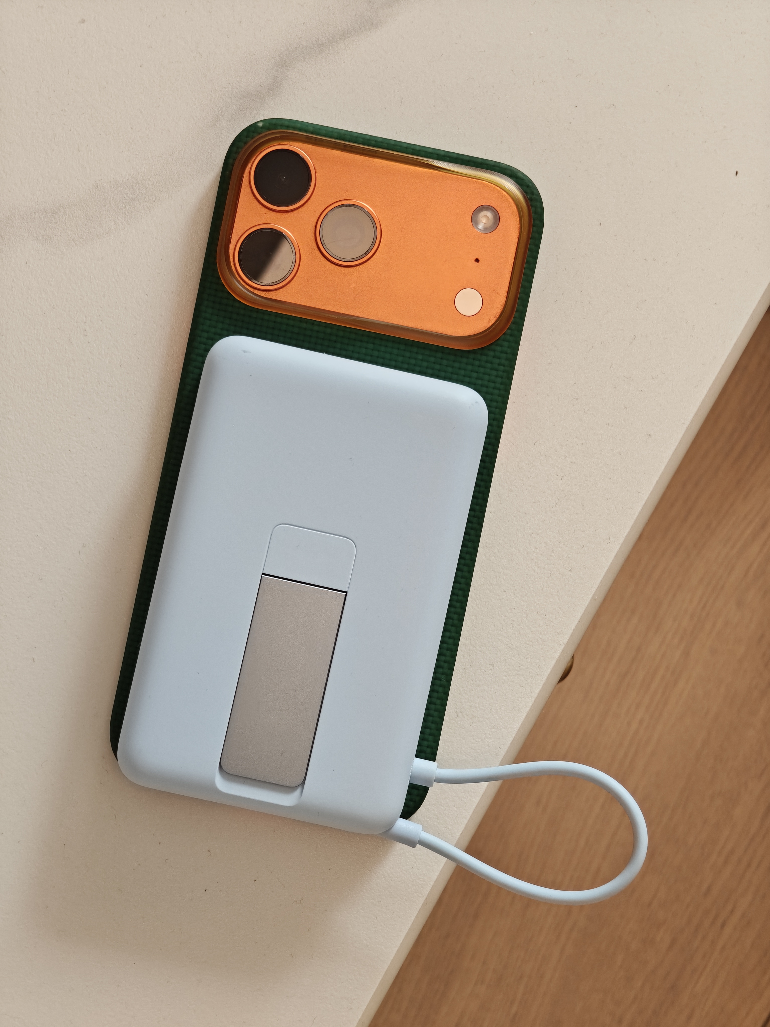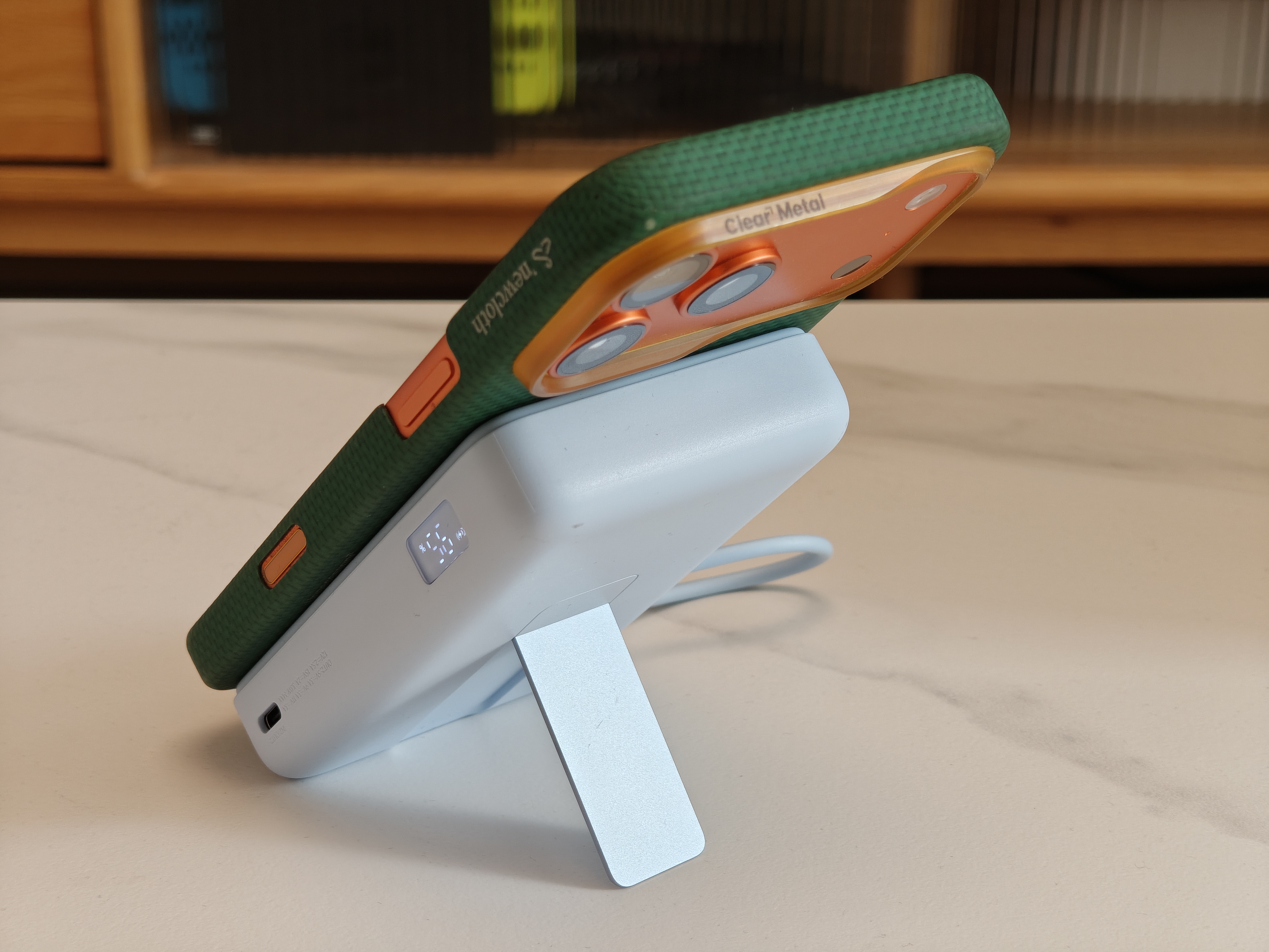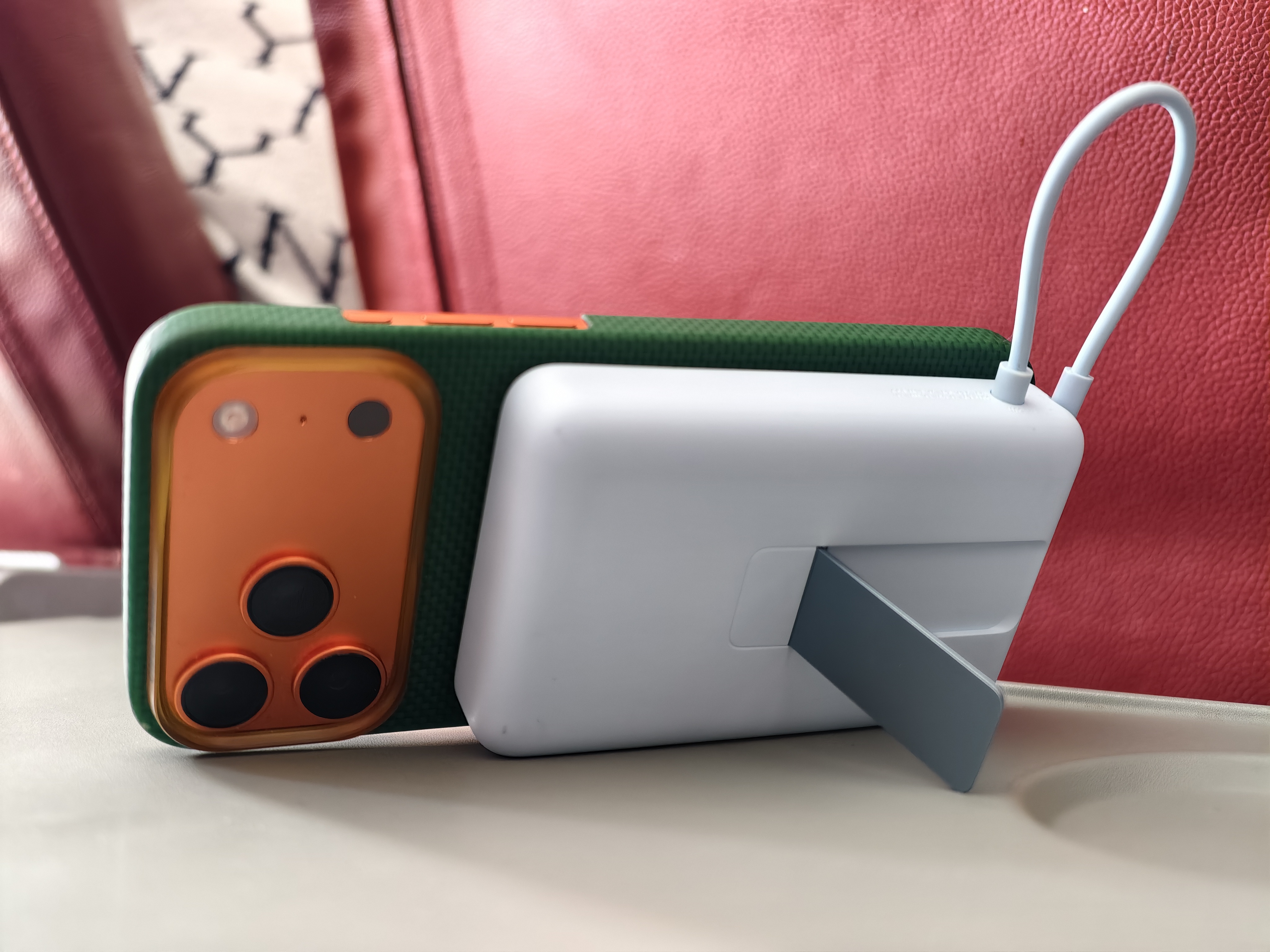 最近出差也都带着,一万毫安时容量,自带充电线,配合磁吸手机壳就可以吸附充电,后面也有可以调节角度的手机支架,横竖都行,最快 33W,非常适合我这种出差狗。