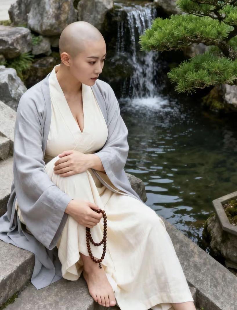 林砚剃光头的第三年,终于在山脚下的小院里,把日子过成了一汪静流。 没人会把她和三年前那个在CBD写字楼熬到凌晨的服装设计师联系起来。那时的她留着及腰长发,踩着高跟鞋,对着电脑改几十版设计稿,熬到脱发、失眠,连镜子里的自己都觉得陌生。某个加班的深夜,她拿起推子,把留了二十多年的头发剃得干干净净——不是遁入空门,只是想把捆在身上的“规训”一并剃掉。 她辞了职,躲进山里,在溪边盖了这间小院。身上这件米白棉麻长袍、浅灰外衫,都是她亲手裁制的,没有多余装饰,只留最舒服的版型;手里那串棕红油亮的珠子,不是佛珠,是她用山里的酸枣木亲手打磨的,盘了三年,包浆温润,成了她最趁手的陪伴。 每天清晨,她会赤脚坐在溪边的石阶上,听瀑布撞在石头上的声响,看松影在水面晃荡。山里的日子慢得像水,她开了个小小的手作工作室,只接合心意的订单,不赶工期,不追流量。有人慕名而来,问她是不是出家修行,她总笑着摇头:“我只是不想再活成别人眼里的样子。” 光头让她彻底摆脱了“女性该有长发”的枷锁,素衣让她不用再为身材焦虑,山里的风、溪里的水,把她身上的浮躁一点点磨平。她不再需要用妆容、发型、名牌证明自己,只需要做自己:裁布、磨木、煮茶、看山。 瀑布的水声常年不息,像给她的日子做着永恒的背景音。林砚坐在石阶上,风拂过衣摆,松针落在肩头,她握着木串,眼神清亮。她不是出家人,只是一个把自己还给自己的人,在这方山水里,活成了最自在的模样。