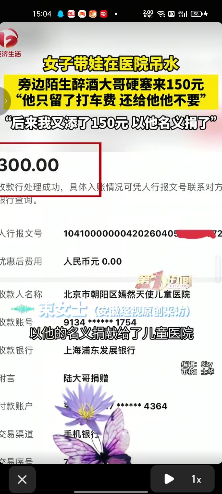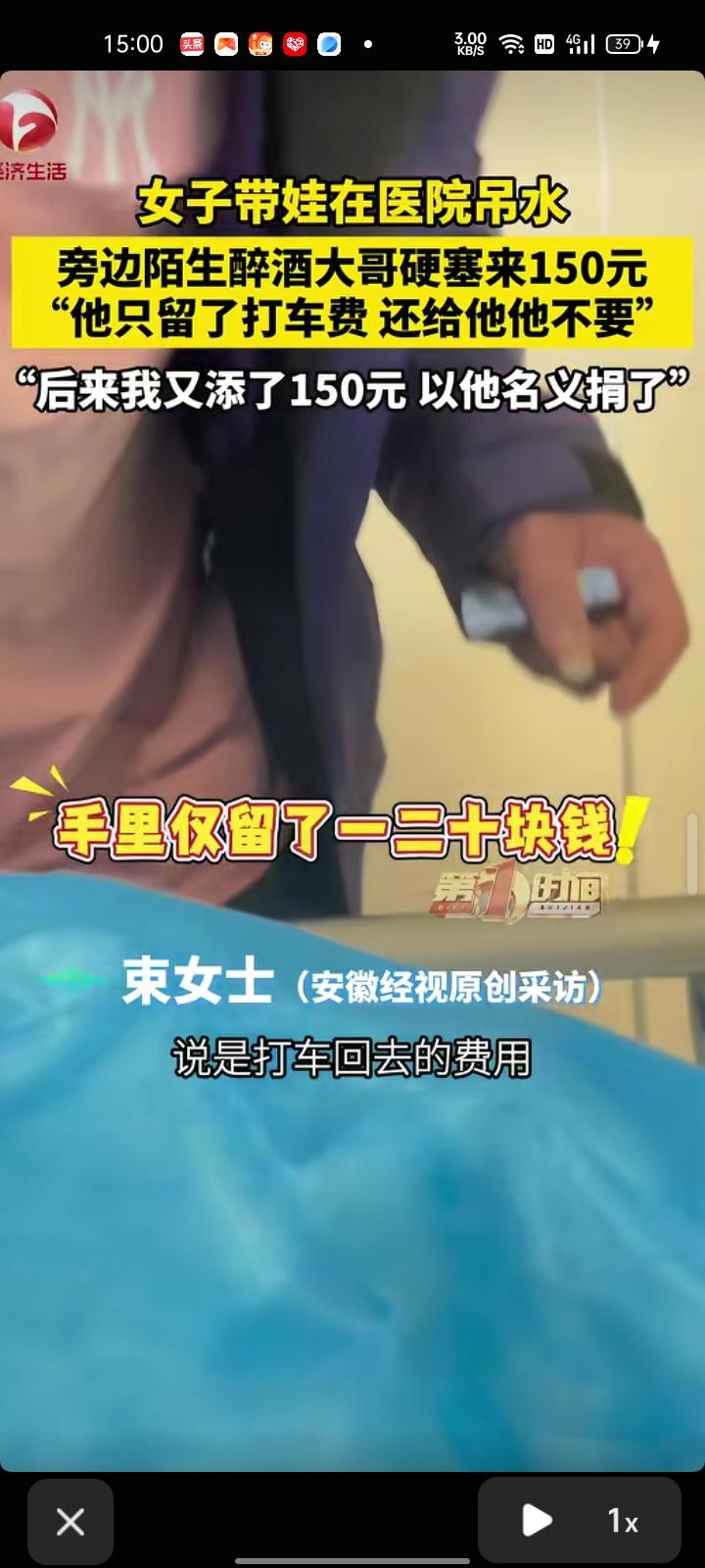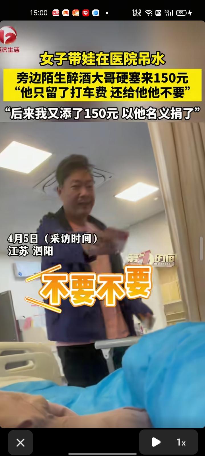 4月3日,江苏宿迁。女子带娃去医院吊水,有位陌生醉酒男子硬塞了150元。 束女士表示,这位男子喝酒喝多了被120带过来的,他醒了之后把钱掏给护士,指向我们说是给我们孩子的。给的是150块钱,他手里留了十块二十块,说是打车回去的费用,还给他他不要。后来我又添了150元以他的名义捐给儿童医院