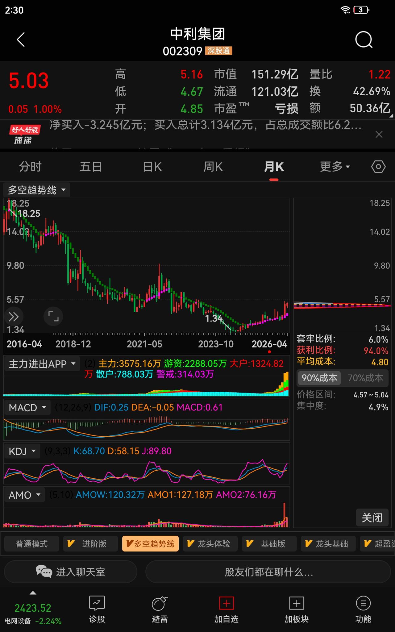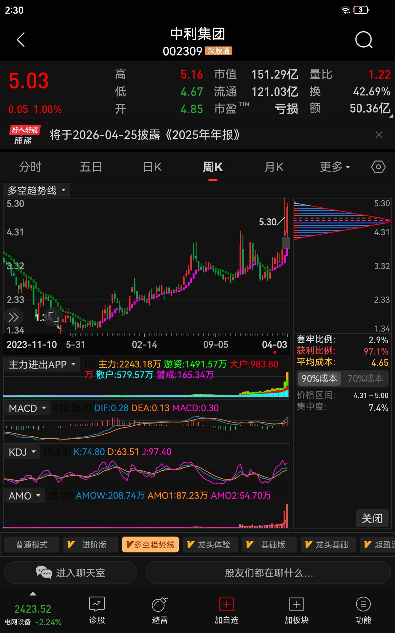 【实战精算】5元低价红线!2.05亿资金抢筹,中利集团(002309)持股还是离场等应对策略(全解) 提示:理财有风险,投资需谨慎 手里拿着中利集团,是继续守还是该动手?这大概是这段时间散户心里最纠结的命题。站在5元的价格关口,一边是2亿级资金的抢筹热闹,一边是震荡中的忐忑,如何拿捏分寸? 🔎 核心标签:5元低价、光棒自给、破产重整、游资合力 📊 硬核数据:资金与换手的真实信号 从核心数据来看,这只票的活跃度与资金承接力一目了然。4月3日收盘价5.03元,市值约120亿,在光纤板块中极具价格优势,散户参与度天然较高。 更关键的资金动向藏在龙虎榜里:4月2日深股通净买入约2.05亿元,多家游资席位与量化资金形成合力布局;近期换手率维持高位区间,高换手下的资金承接力度较强,这是它持续被市场聚焦的核心底气。 🔗 底层逻辑:业绩拐点与底气支撑 它的逻辑其实很扎实,首先是低价低门槛属性,5元左右的定价降低了参与门槛,贴合散户交易习惯。 更核心的是业绩拐点信号:子公司青海中利光纤拥有600吨/年光棒产能,且自给率达到100%。在当前光棒供需偏紧、价格上行的周期下,不仅意味着稳定的成本控制,更有满产的订单支撑,订单甚至排至2026年下半年,为业绩增长筑牢了基本面底座。 此外,完成破产重整后引入厦门国资,历史债务问题出清,也为后续经营稳定性提供了背书。 🤔 持股实操:分场景定策略 回到最实际的问题:是继续持股还是怎么操作? 结合数据与节奏,提供不同场景的应对思路,供你参考权衡。 - 空仓观望:可关注4.6-4.8元区间的承接信号,结合成交量、主力资金流向变化再做决策,不急于在分歧期盲目介入,等节奏更明朗再布局。 - 持仓在手:建议明确止盈与止损纪律。以5.2-5.3元为短期压力参考区间,触及后可分批兑现部分利润;若跌破4.6元且资金持续流出,则需警惕趋势走坏风险,及时做好止损应对。 - 短线博弈:高换手标的节奏极快,若参与超短交易,务必轻仓快进快出,严格遵守交易纪律,不恋战、不追高,避免被情绪左右。 市场波动永远存在,关键是建立基于数据与逻辑的判断框架。理清核心信号,守住操作节奏,在震荡中守住理性,比盲目跟风更重要。 中利集团 股市分析 @时光记忆WGW