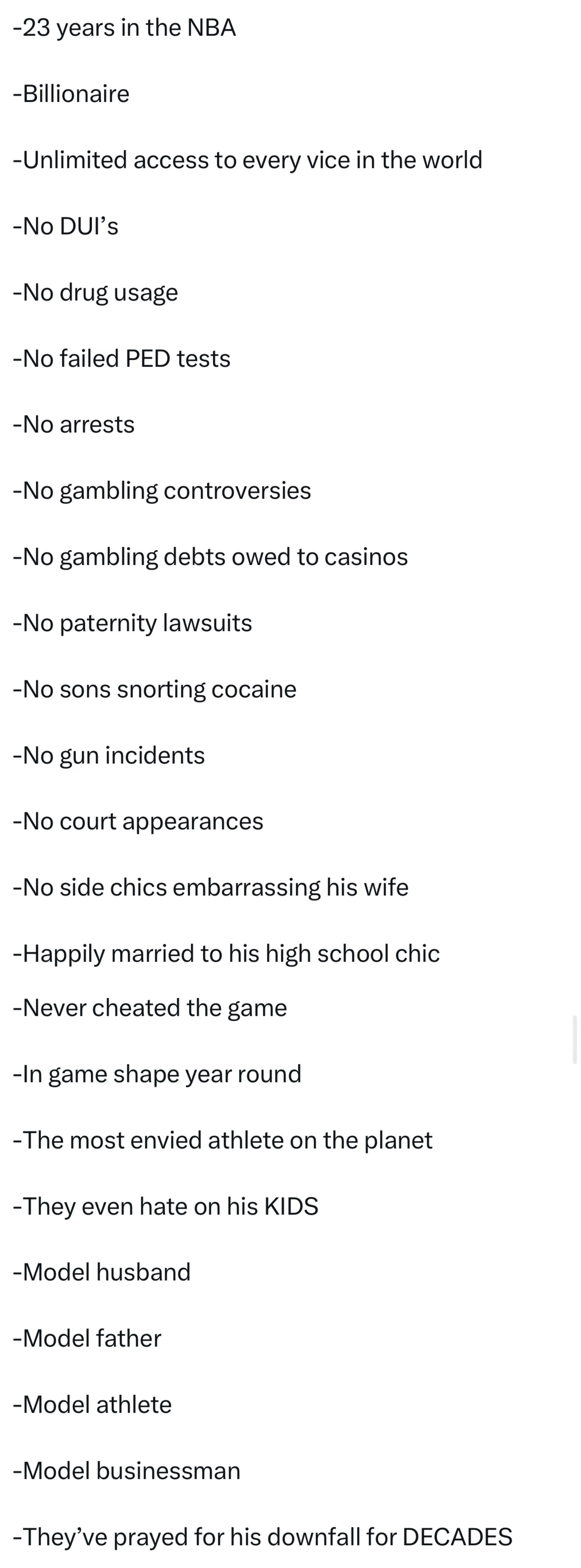 • 23年NBA职业生涯• 亿万富豪• 可无限制享乐• 无酒驾记录• 无药物滥用史• 无禁药检测失败记录• 无警方逮捕记录• 无赌博相关争议• 无欠赌场赌债情况• 无亲子诉讼纠纷• 无子女涉毒事件• 无涉枪事件• 无法院出庭记录• 无婚外情令妻子蒙羞• 与高中时期的爱人婚姻美满• 从未在比赛中作弊• 每年都能保持竞技状态• 全球最受妒忌的运动员• 甚至连他的孩子都遭到诋毁• 模范丈夫• 模范父亲• 模范运动员• 模范商人• 数十年来,无数人一直期盼着他的陨落