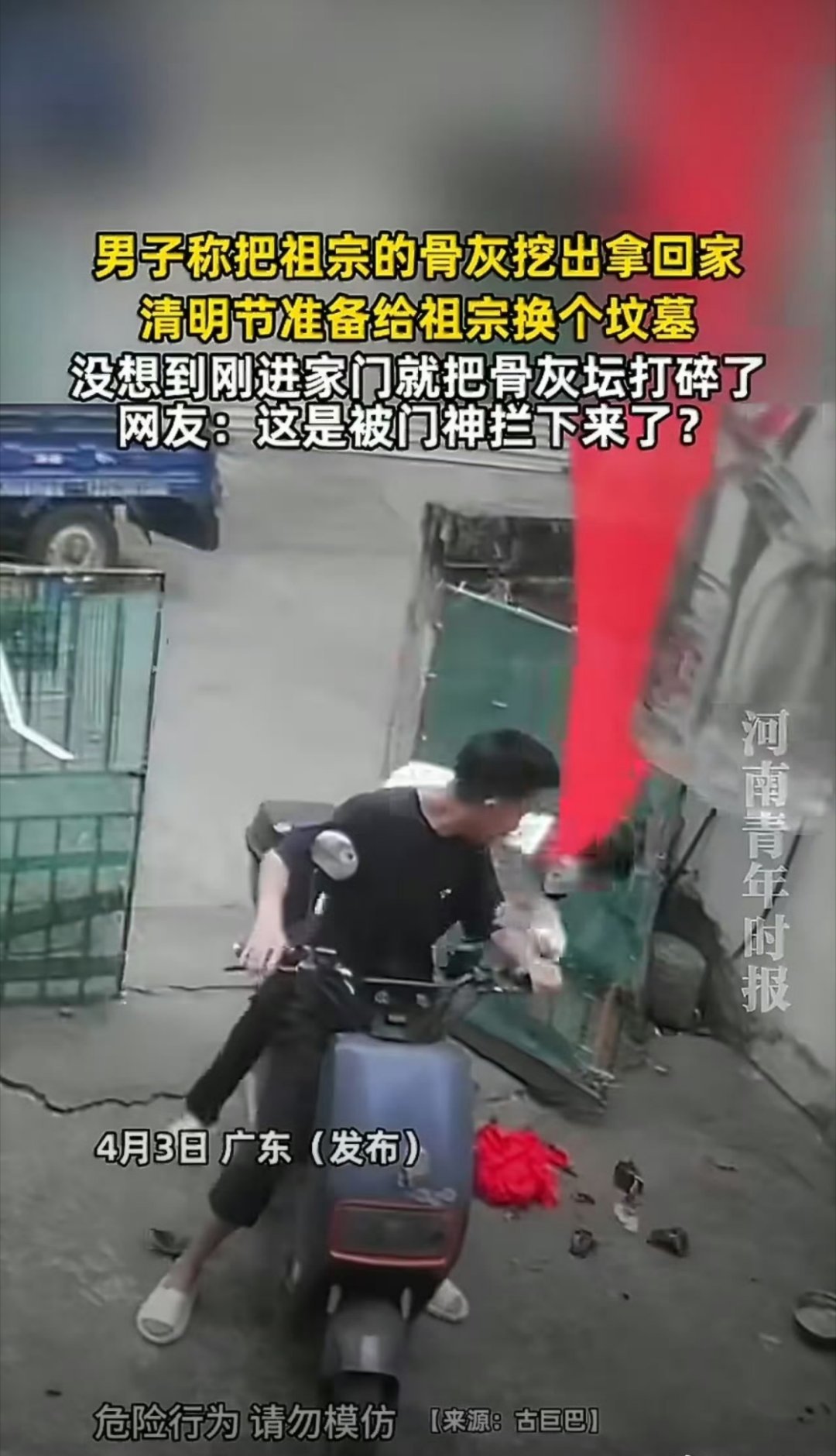 男子拿祖宗骨灰坛回家进门就打碎了这让祖宗情何以堪?祖宗寻思回家了能吃顿好的,没想到先摔了一跤