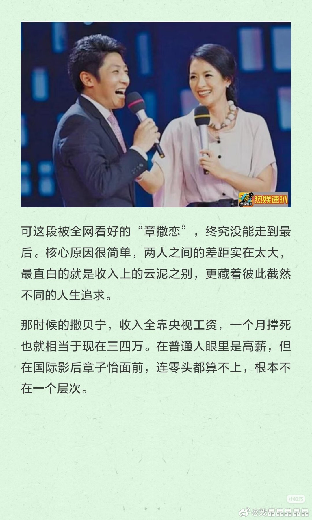 撒贝宁 章子怡章子怡和撒贝宁谈恋爱的时候是她口碑最好的时候,当时传闻分手是因为章家不同意,还有收入上的差距。