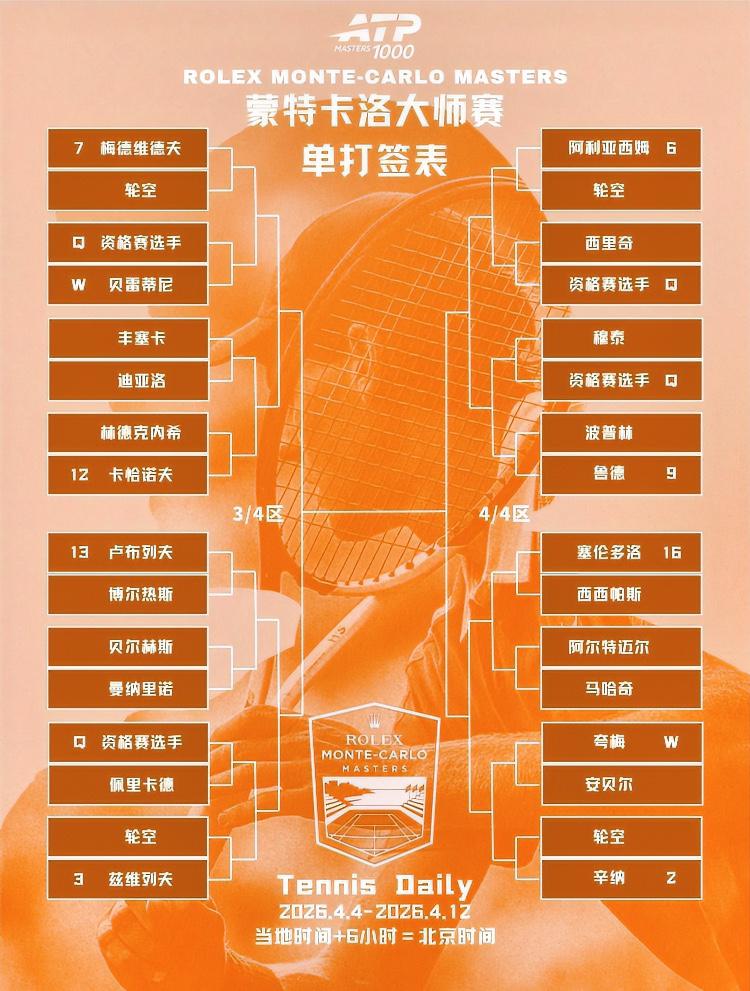 收藏收藏!!🔥 蒙特卡洛大师赛签表出炉!! 2025年本站冠军是阿尔卡拉斯!! 4月6日正赛第一轮开打!!与咱有6个小时的时差,观看直播时间挺友好的!!4月12日决出最后的冠军!!蒙特卡洛所在地是摩纳哥,瓦舍罗:终于来到我的地盘!!2026大师赛 蒙特卡洛大师赛 阿尔卡拉斯