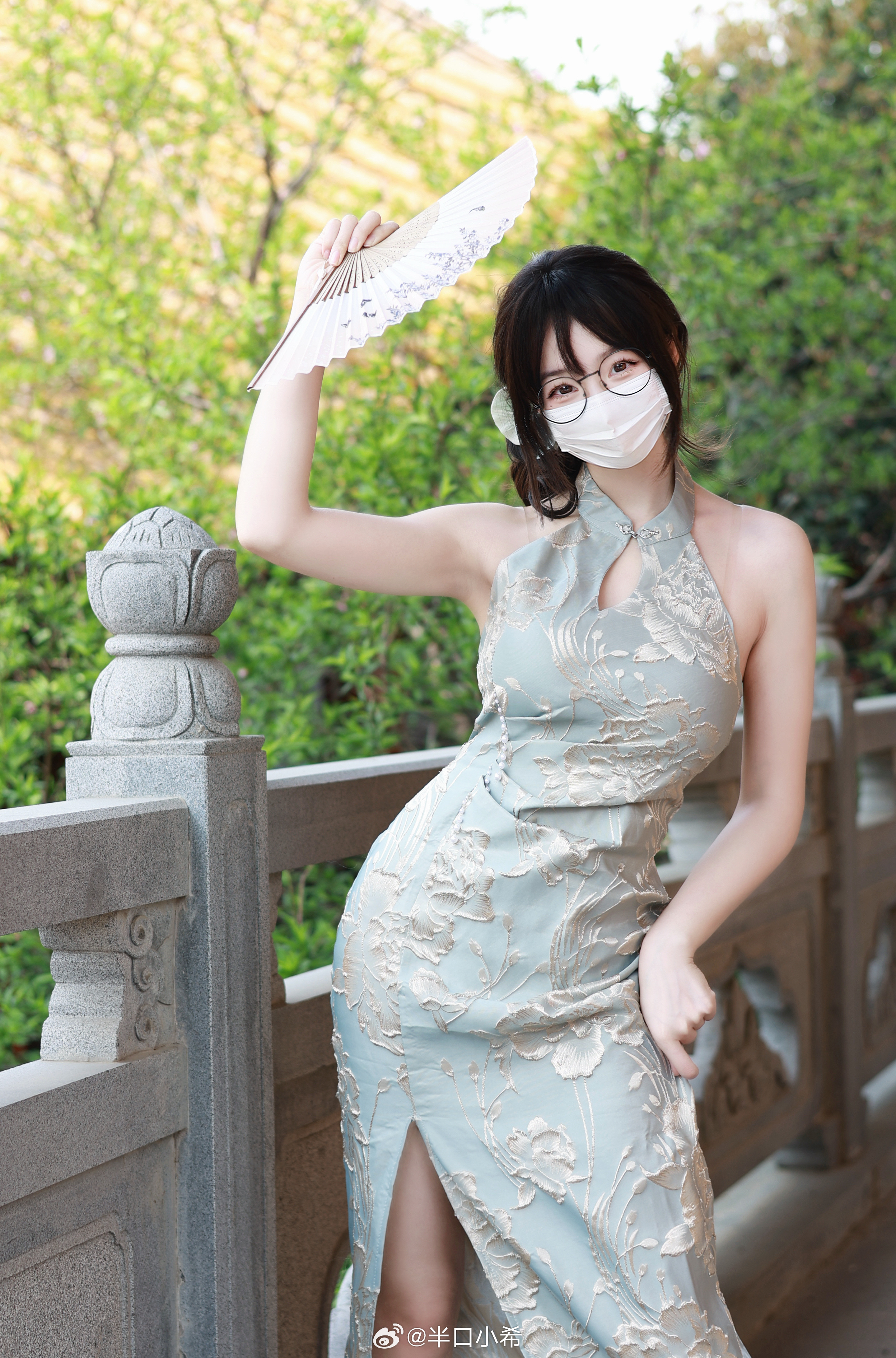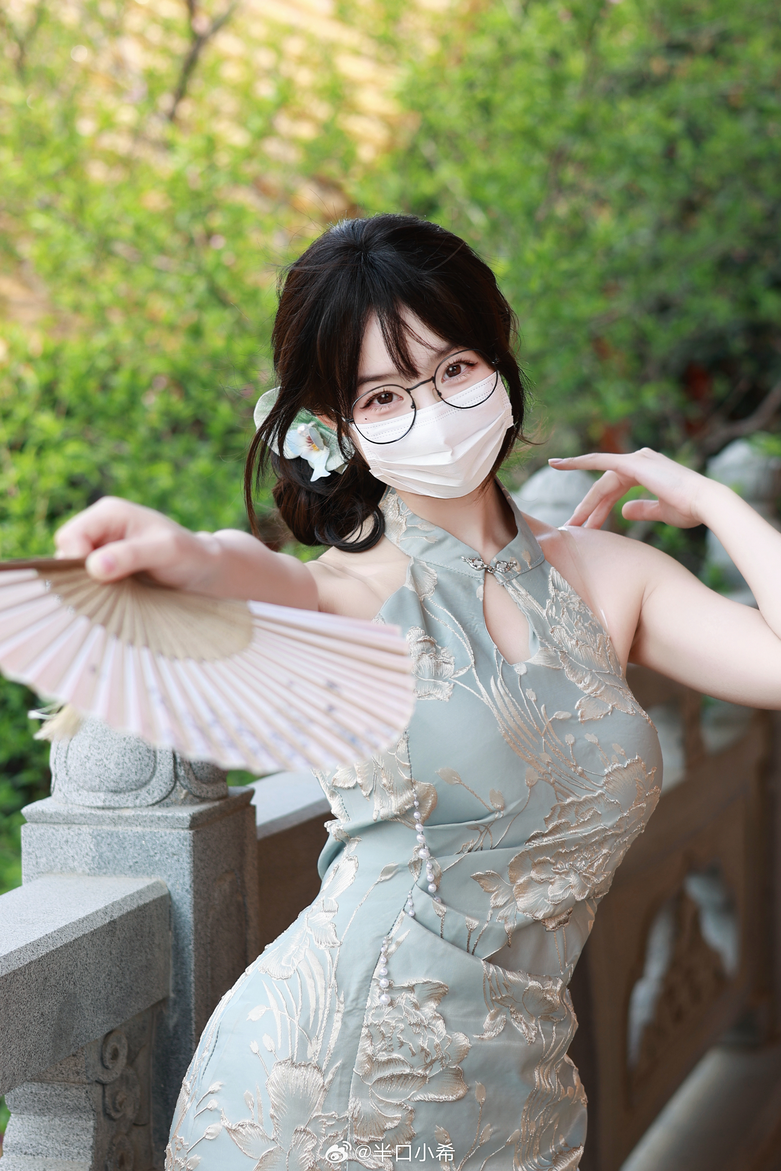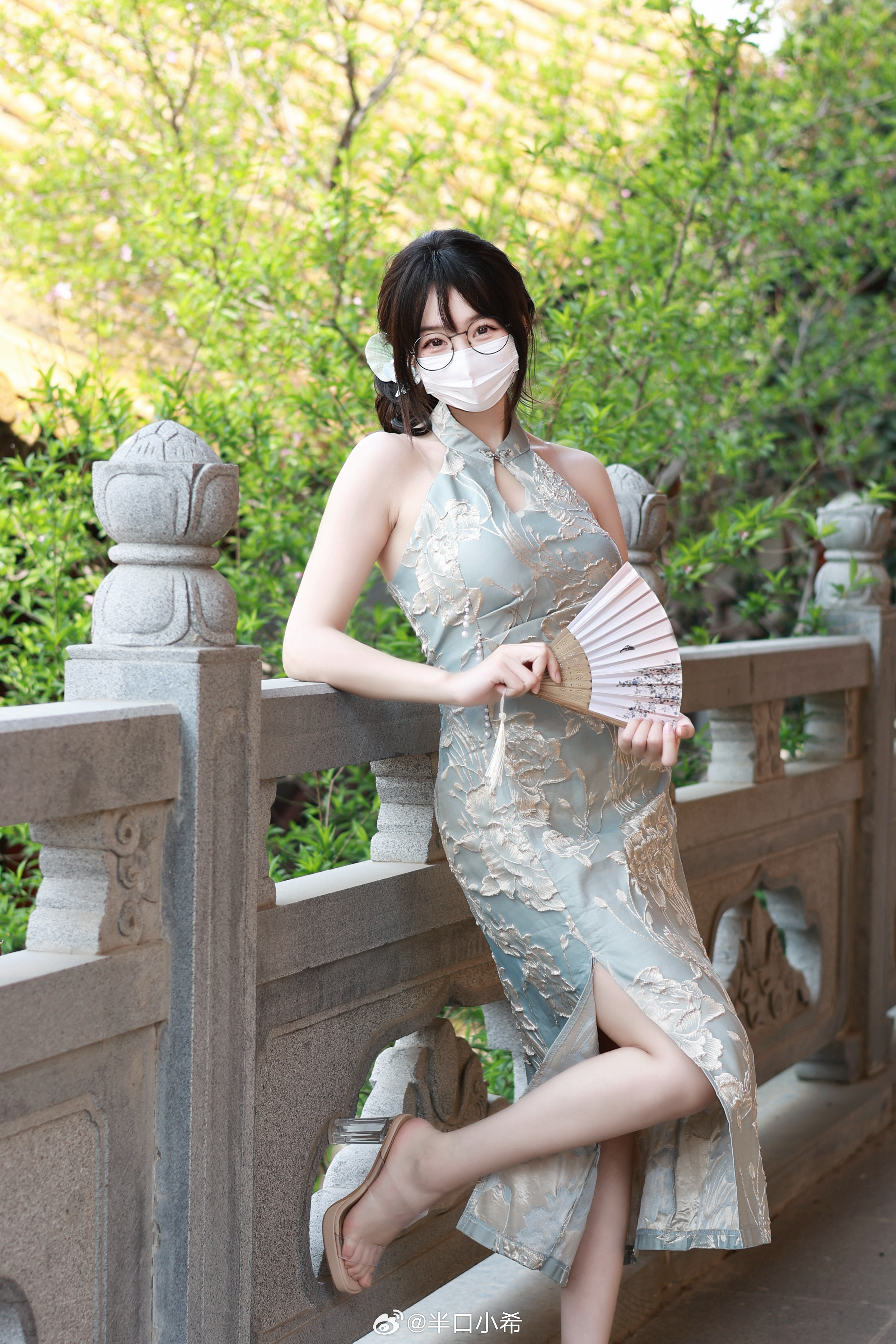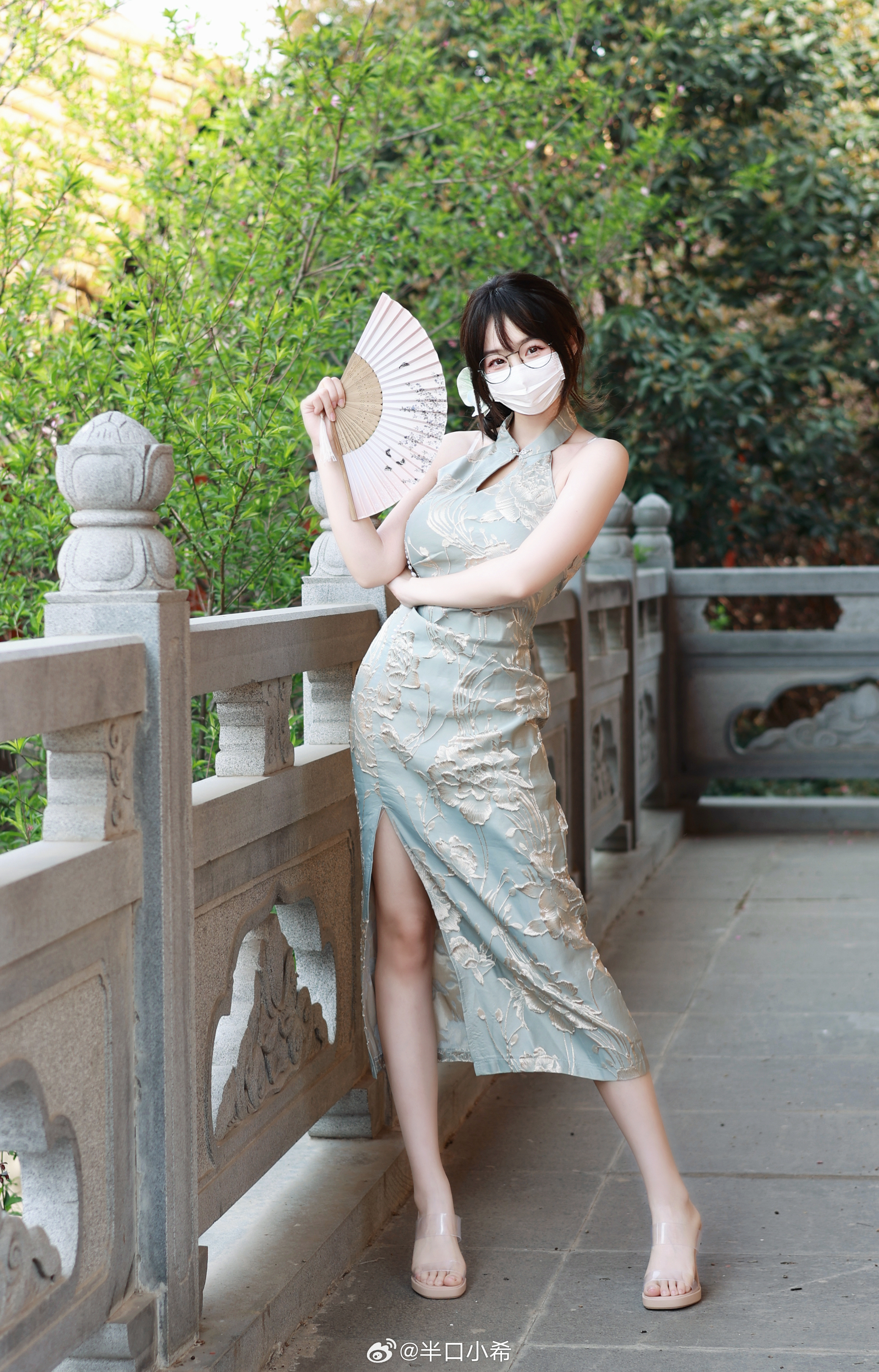 这套是温柔轻熟新中式风,核心是粉调改良旗袍:浅粉底色+细碎花纹自带温柔气质,开叉