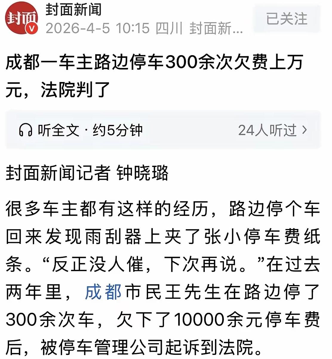 四川成都,男子在路边停了300多次车,每次离开都不缴费,累计欠下10000多停车费后,停车管理公司开始秋后算账,直接把男子告上法院,让他全额支付欠下的停车费,法院判了! 成都的王先生这回可真是栽了大跟头,抱着侥幸心理想白嫖路边停车位,最后直接吃了官司,一分钱都没赖掉,反倒丢了脸面,实在是得不偿失。 近一年时间里,王先生频繁把车停在成都路边的收费泊位,前前后后停了300多次,短则几十分钟,长的甚至能停90多个小时,按照当地收费标准,单次费用从2块到70块不等,算下来整整欠了1万多块。 明明现场扫码、微信小程序都能轻松缴费,欠费记录也能随时查,可王先生就是揣着明白装糊涂,一次都没主动交过,总觉得没人催就能蒙混过关。 结果停车管理公司直接拿起法律武器维权,把他告上了法院。法院审理后明确判定,管理公司是正规授权的收费方,王先生停车就形成了事实服务合同,驶离时缴费是法定义务,根本不需要对方特意催缴,他的行为本身就违背了诚信原则,必须全额补缴1万多欠费。 其实这事真的不复杂,占了公共资源、享受了停车服务,缴费本来就是天经地义的事,千万别抱着侥幸心理贪小便宜,诚信才是立身之本,为了这点钱闹上法庭,实在太不值当了。 大家平时停车遇到过这种想逃费的人吗?你们觉得这种逃费行为该不该严惩?