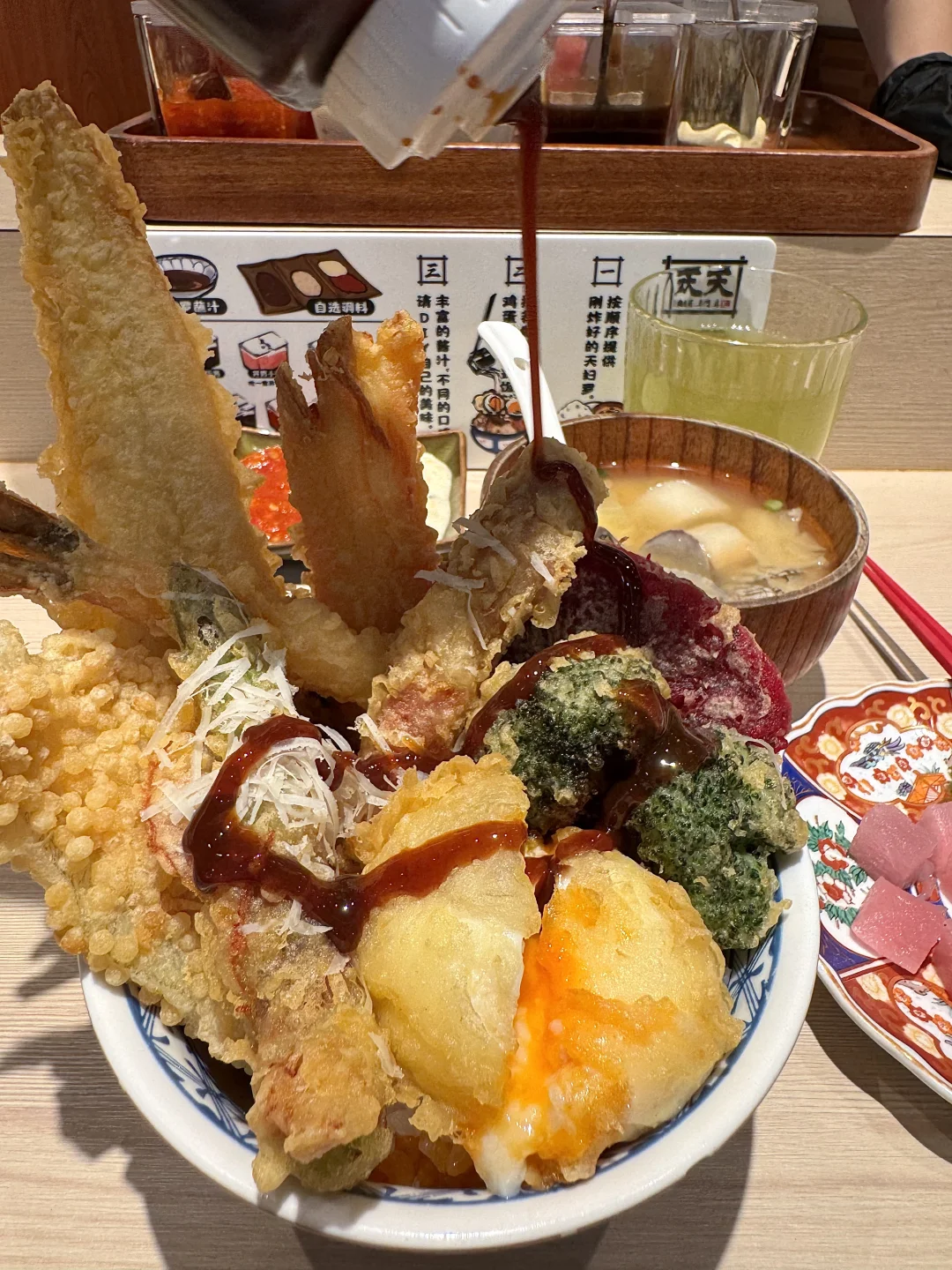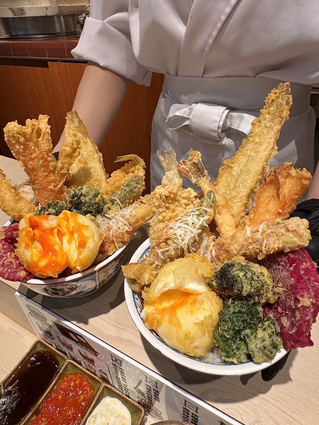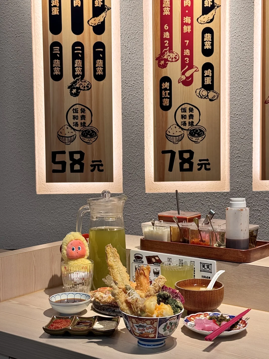 就在地铁口出来的万象城负二楼!叫天天天妇罗📍)现点现炸的天妇罗一人食😭我点的新品set,面衣薄而酥脆,酱汁自助喜甜喜咸都看自己! 大虾和星鳗真的非常嫩!里面的火龙果和芦笋也甜甜脆脆 真的有惊艳到我!配上开胃小菜好吃又不腻!想吃的建议错开饭点或者早点来!