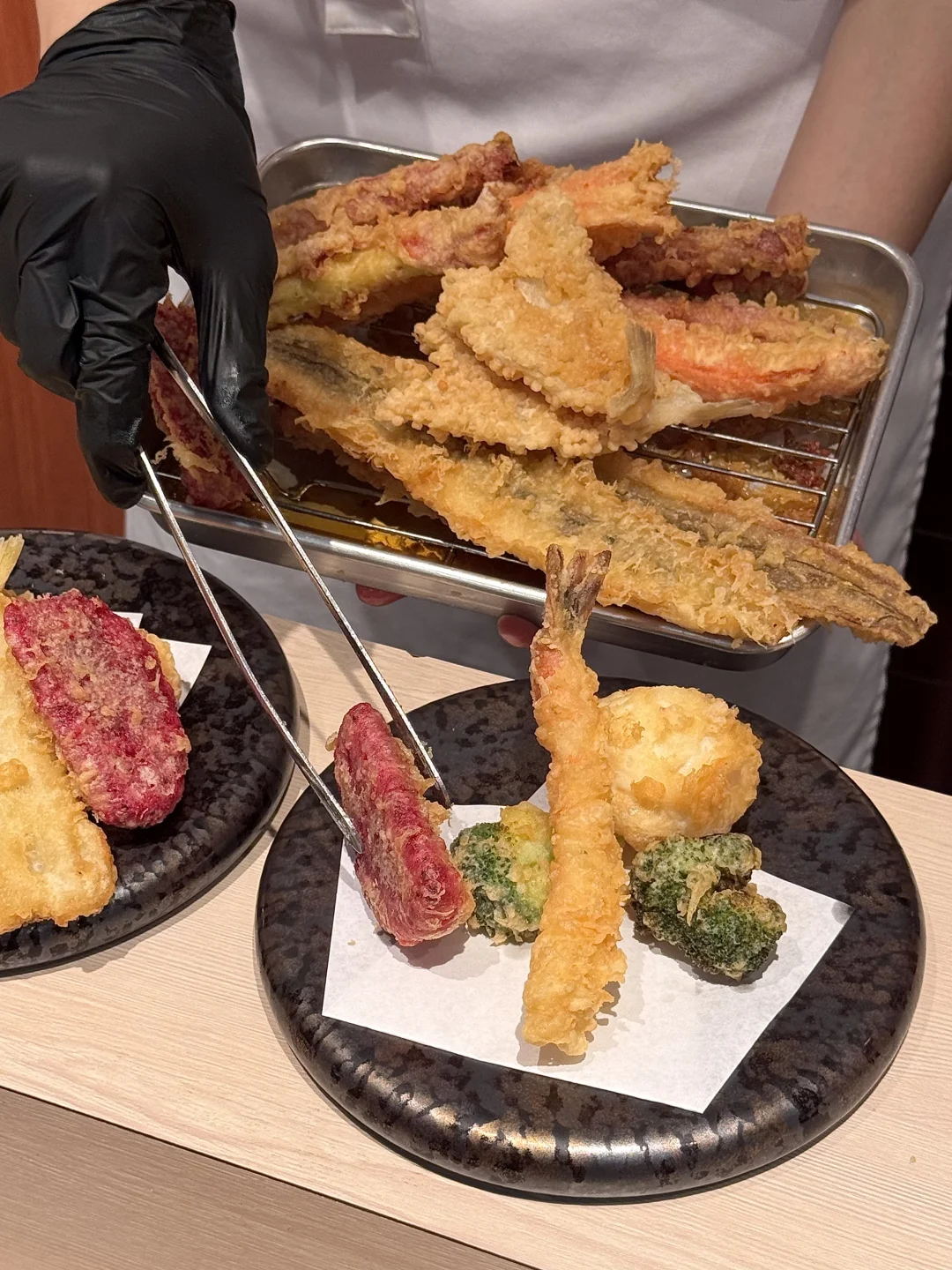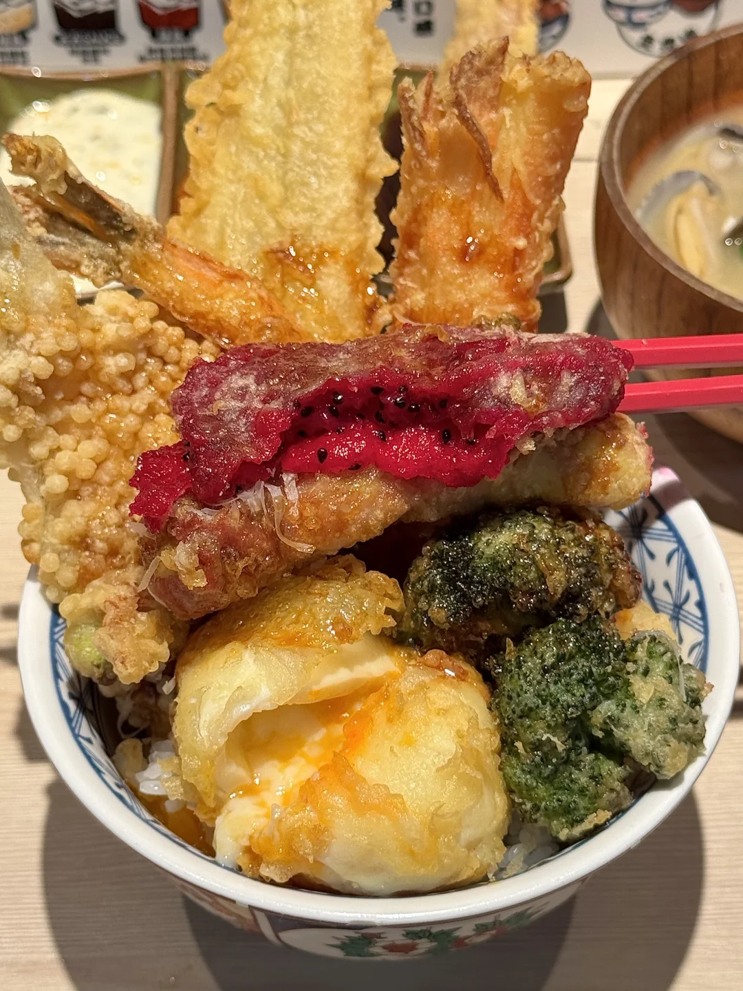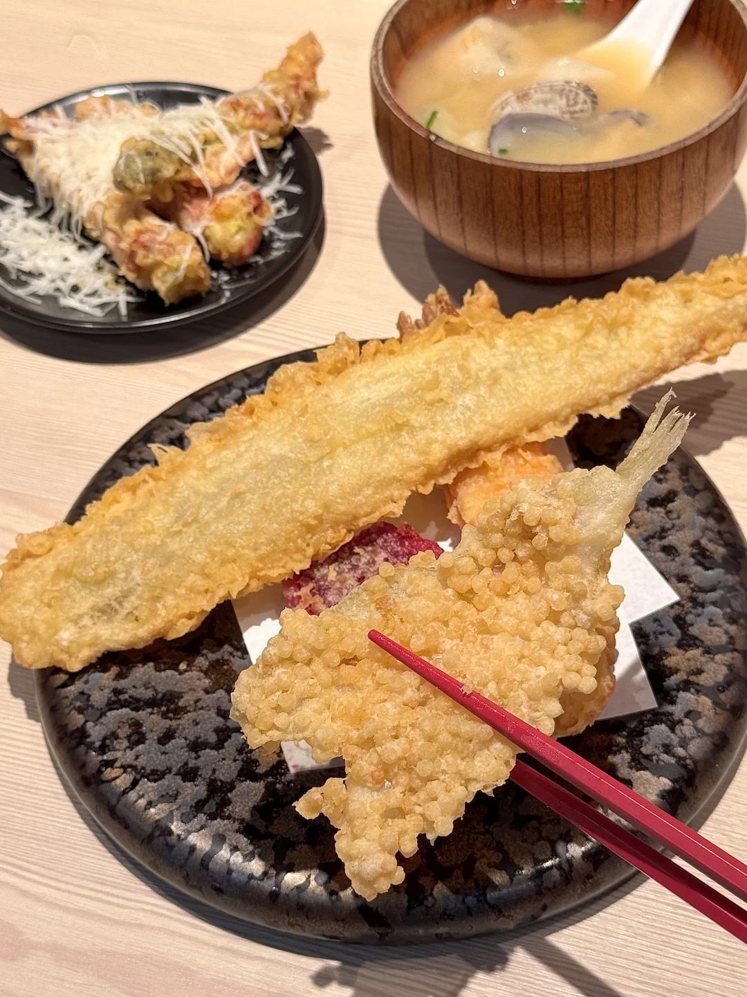 就在地铁口出来的万象城负二楼!叫天天天妇罗📍)现点现炸的天妇罗一人食😭我点的新品set,面衣薄而酥脆,酱汁自助喜甜喜咸都看自己! 大虾和星鳗真的非常嫩!里面的火龙果和芦笋也甜甜脆脆 真的有惊艳到我!配上开胃小菜好吃又不腻!想吃的建议错开饭点或者早点来!