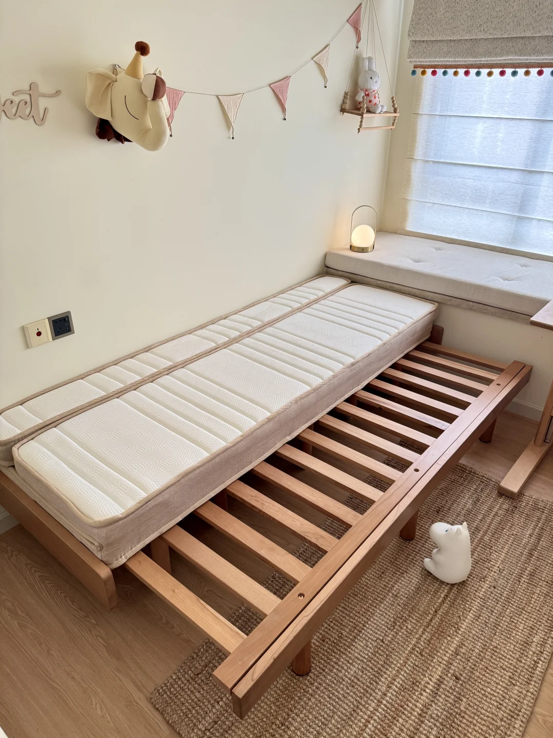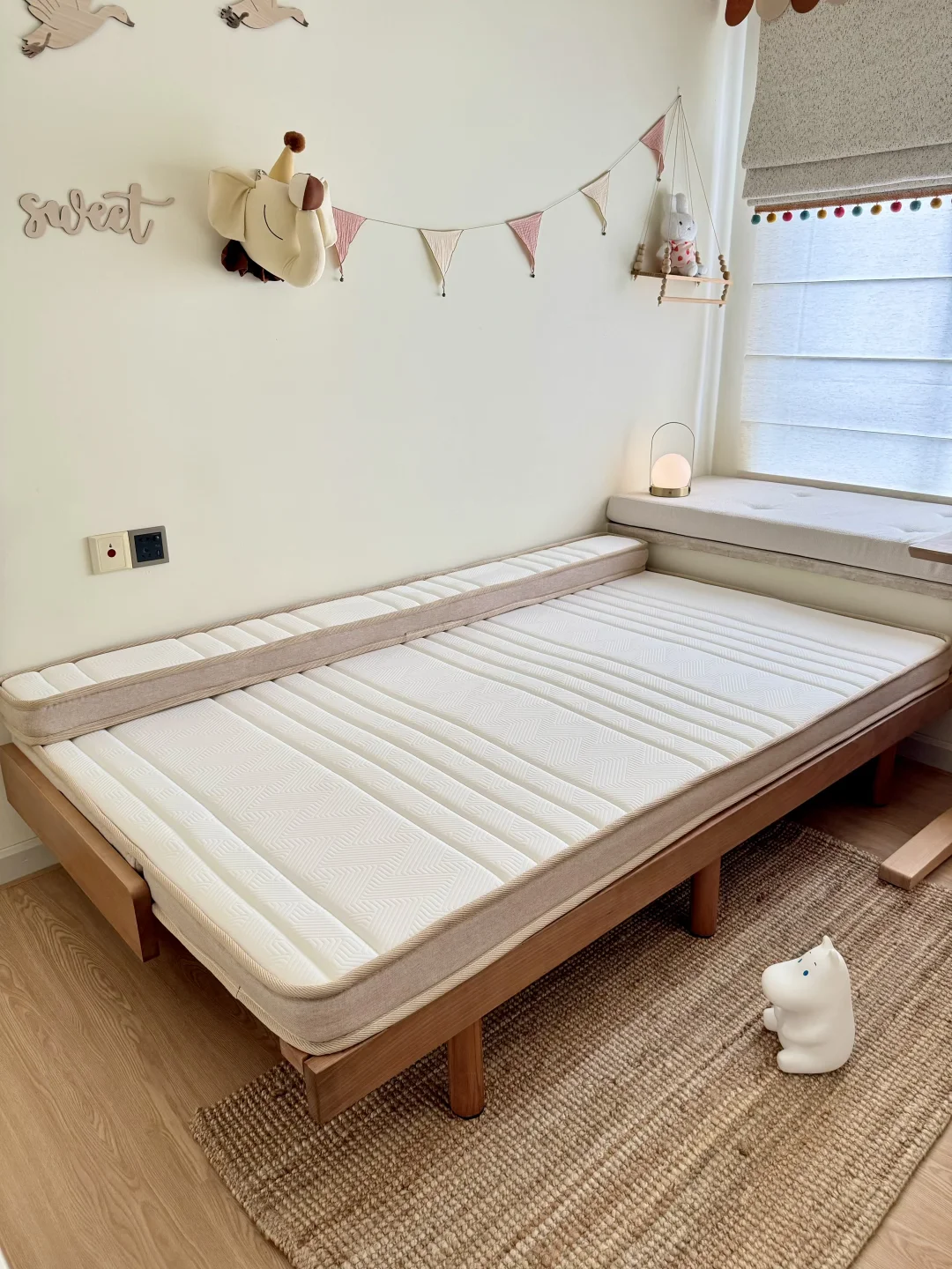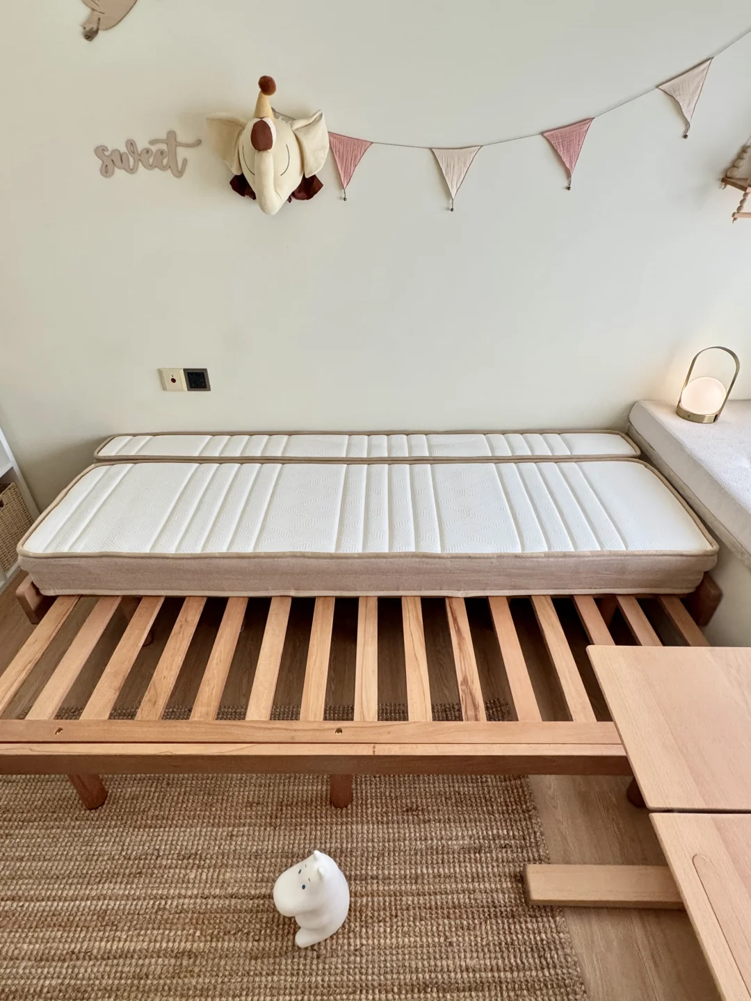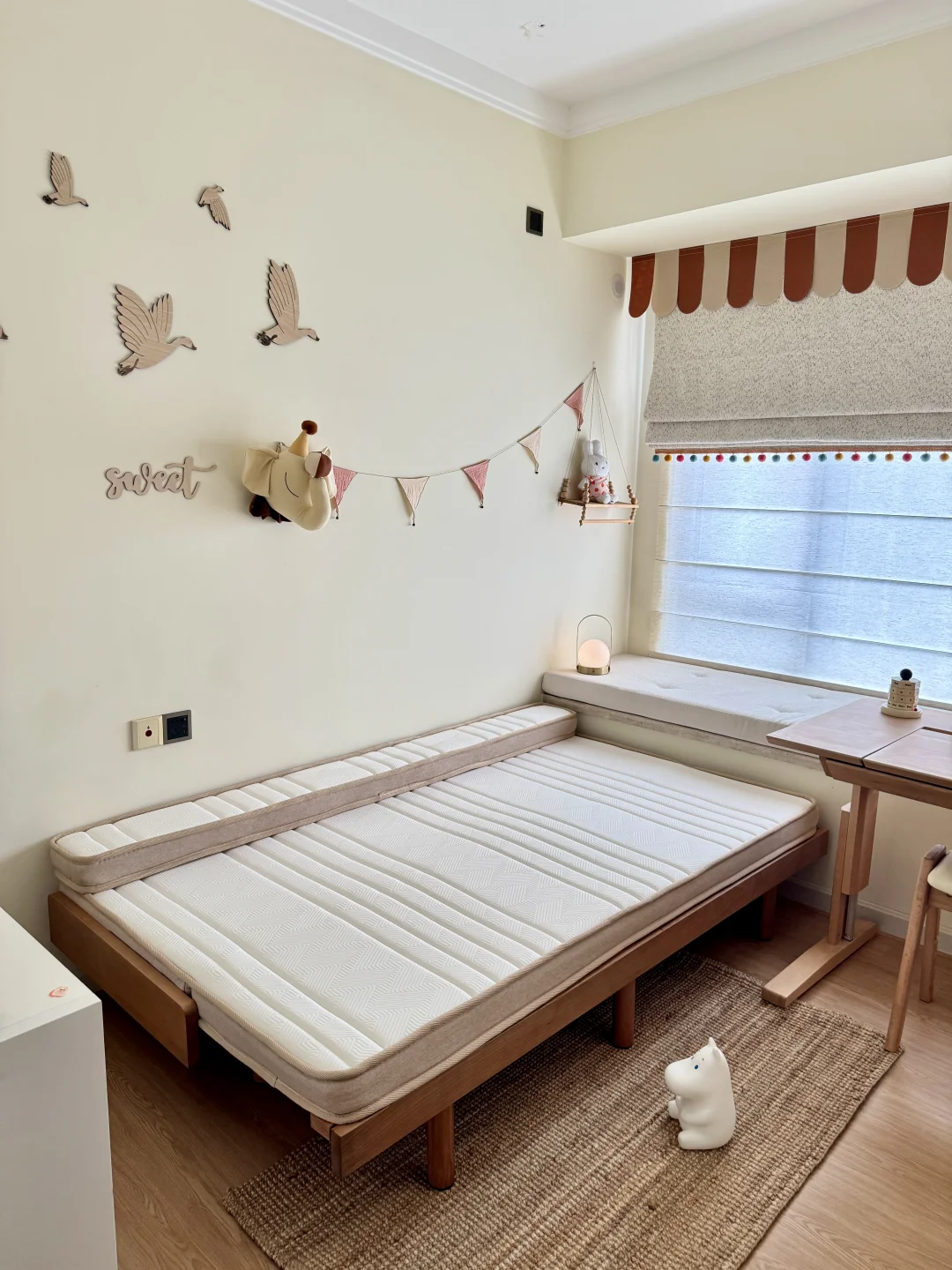 小小的儿童房没有做固定的榻榻米 空间灵活度更高啦、更加“适童化”啦 给孩子准备了小书桌、书架、储物柜 还有可以变身的推拉床和折叠床垫 收起来一个小孩睡足够了、还省空间 展开就很宽敞,两个娃睡都够咯 等孩子长大了睡着也不拥挤、 一推就能切换大床小床太实用啦🥳 不做固定的家具、给孩子更多的自由空间 要是我长小了 我就住在这个房间了🤪