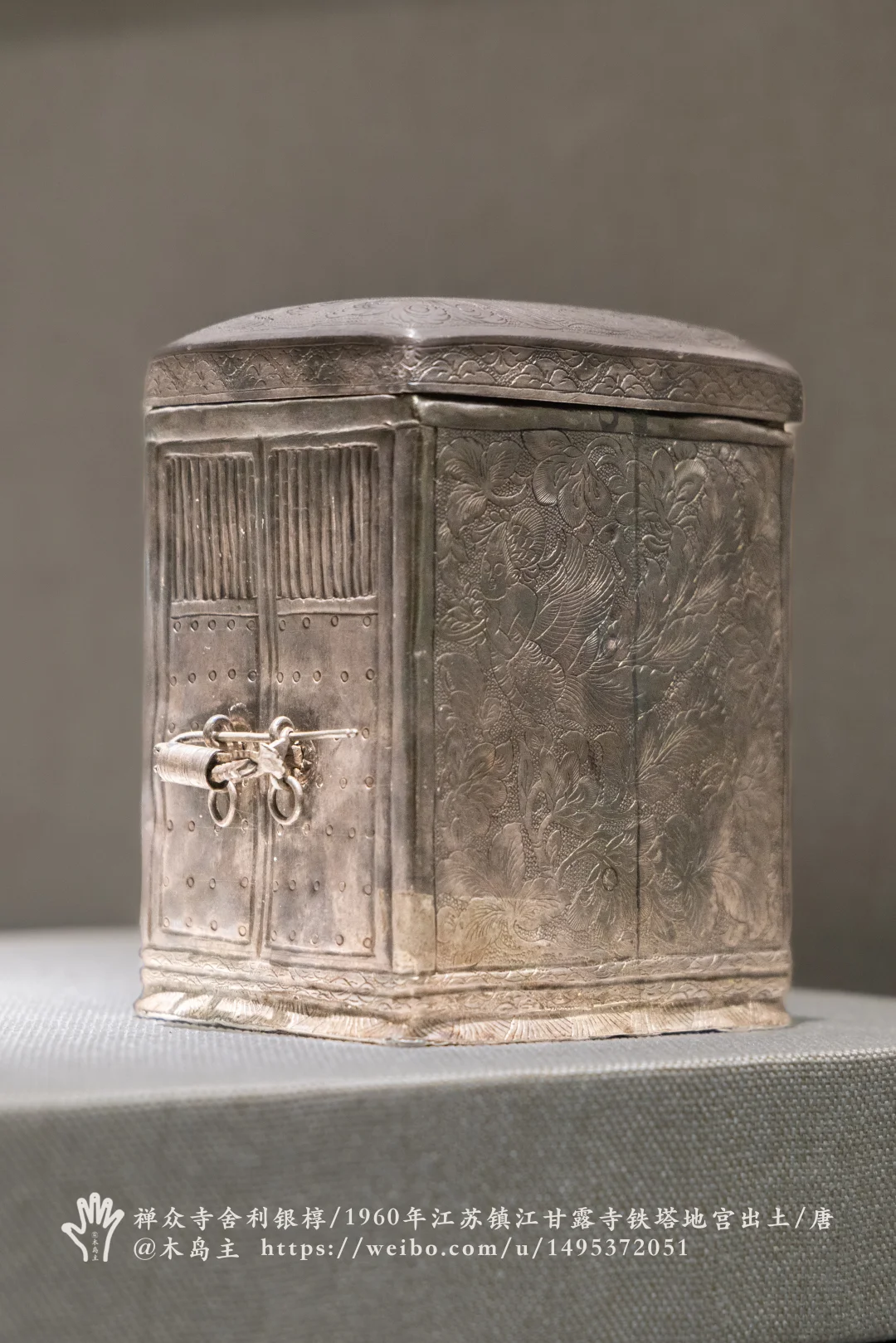 唐长庆四年(公元824年),李德裕将11粒释迦牟尼佛舍利从南京长干寺迁至北固山,并于宝历元年(公元825年)依照长干寺塔原有式样建造石塔,用金棺银椁裹以锦绣九重,供奉佛舍利于石塔地宫内。这是图1-4的金棺银椁。
