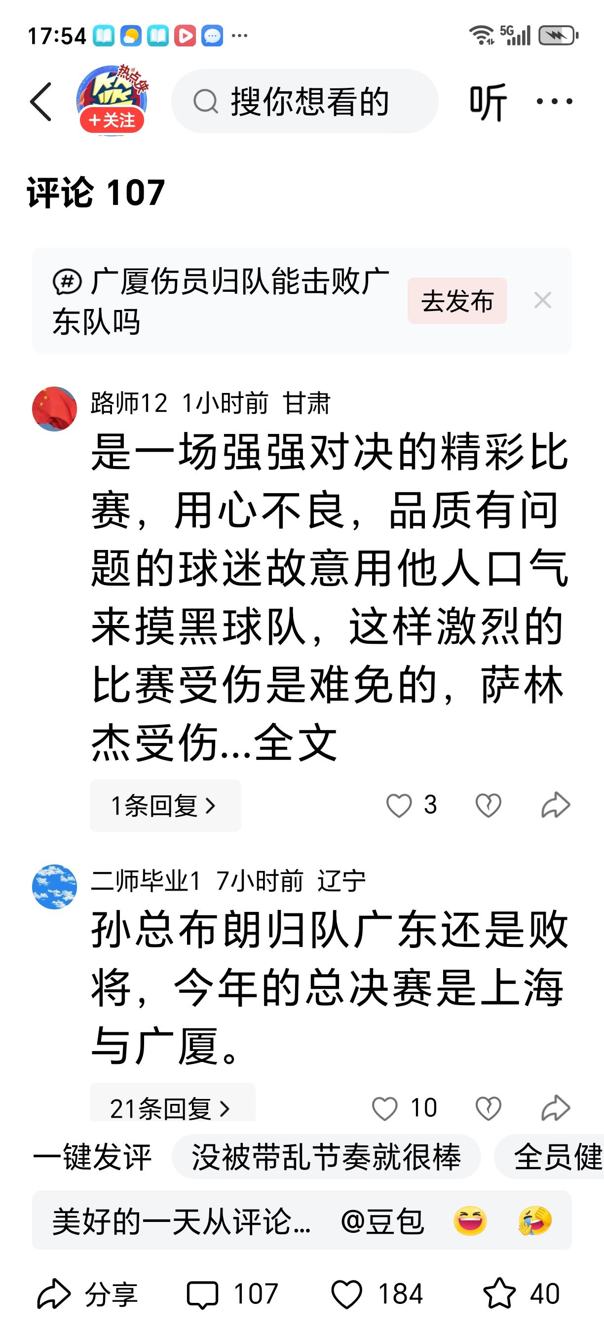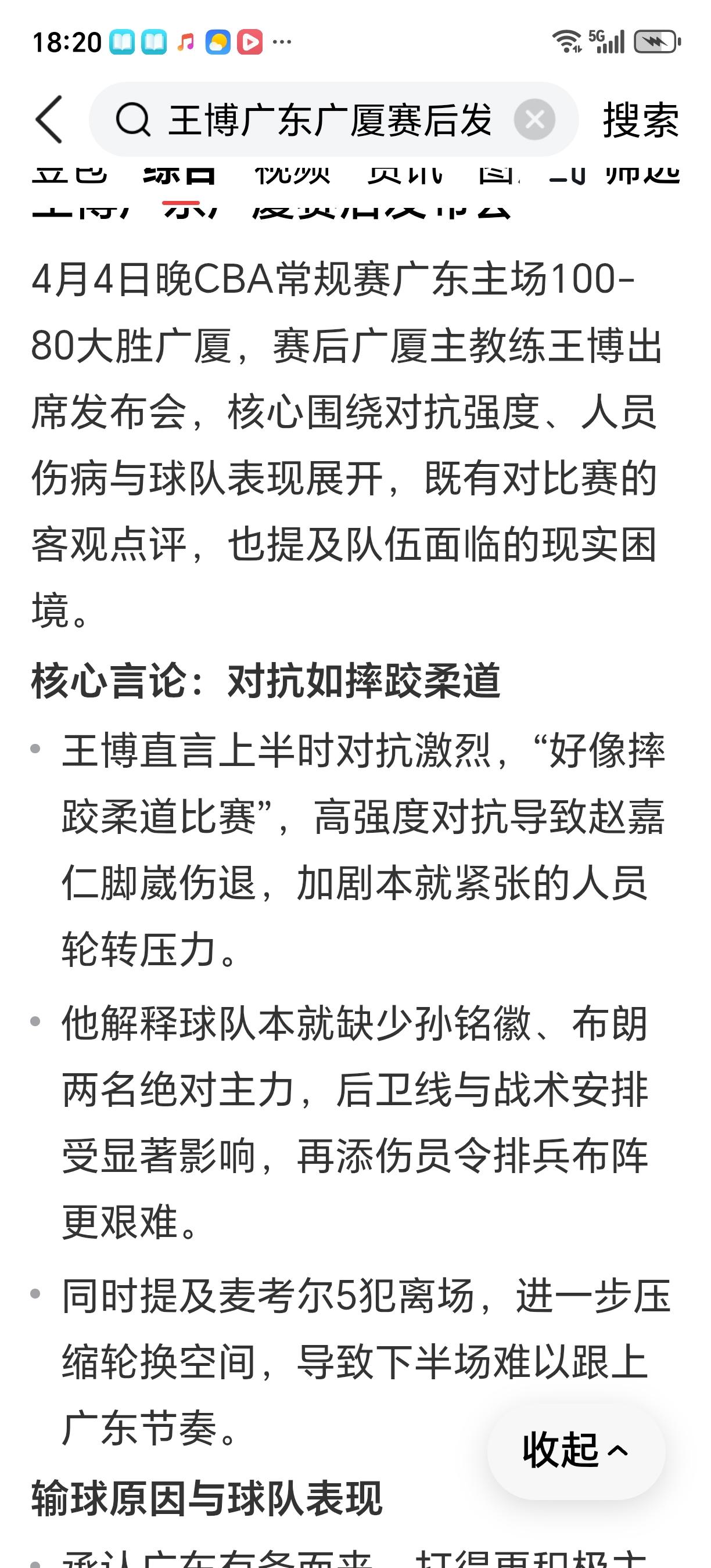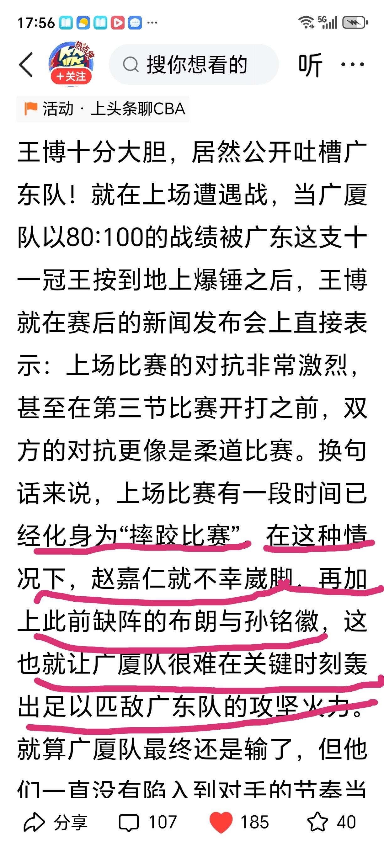 王博你也是一个冠军教头了,说话可得強调“像”字,不然就被某些人带偏了! ①孙铭徽受伤、布朗愛伤可跟广东宏远没一丁点关系,他们都没上过场 ②赵嘉仁受伤可不是广东宏远球员有意为之,而是他自己变向时踩着对手脚面而崴脚受伤,从(图片12)来看跟广东宏远球员没关系,广东宏远萨林杰不也在这场比赛中受伤打不了吗? ③从整场比赛来看广厦一直在强打,且多数单打独斗蛮干型,广东宏远球员动作也是被动顶防图③⑥可见 ④广东宏远进攻更大趋向于巧打注重配合四两拨千斤 ⑤我看到 广厦球员是什么动作都敢用于大伤复出的崔永熙,推、锁喉动作都用上了 在人员不整时输一两场常规赛没什么大不了。图②⑦ 季后赛人员齐整时再干呗!有些时候不用过于强调某些原因大家也明白的。