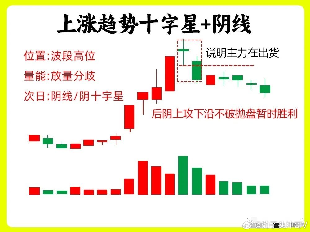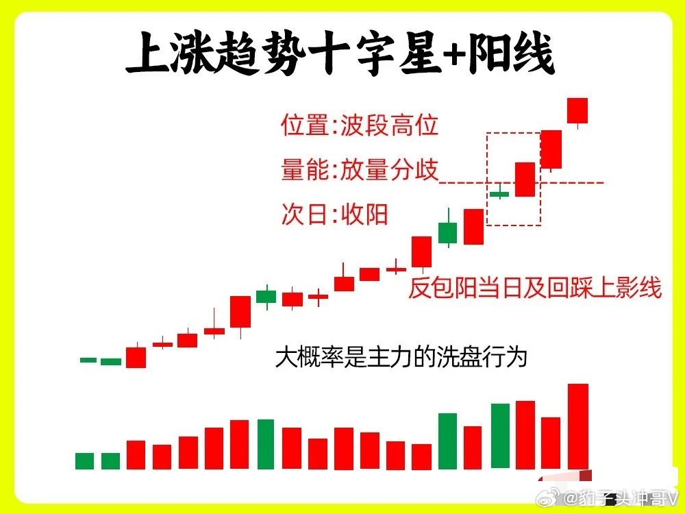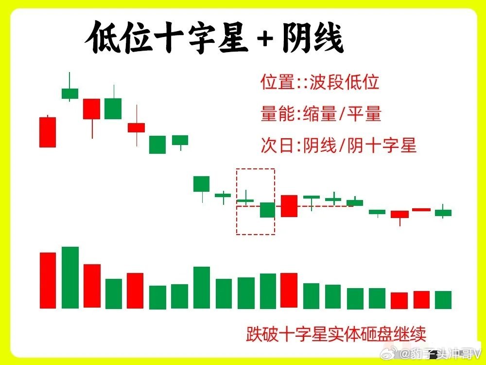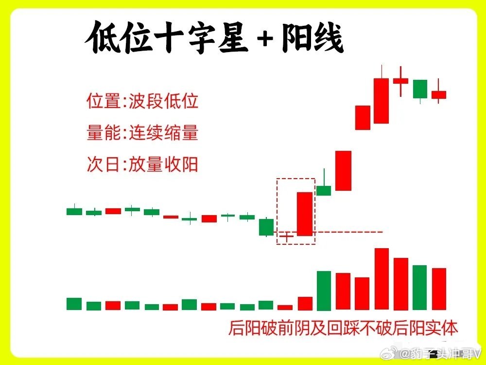 市场流传这一句话,炒股不看十字星,再炒十年也枉然。十字星代表着市场处于一个平衡,但是他的出现的位置和组合形态,代表意义有所不一样的。一、低位十字星 + 阳线算是加强版的早晨十字星,股价在低位形成一个十字星以后,次日股价出中大阳线,突破十字星的最高价,这有一个细节,成交量必须是放量,说明市场从十字星的多空平衡,变成的多方力量比较强的一个变化。随后股价突破以后,并没有重新回到十字星附近。会更可靠二、低位十字星 + 阴线股价在低位出现十字星,次日股价走出一根阴线,股价跌破了十字星的最低价。说明此时的承接力量很弱,股价多空平衡到空方力量强的一个过程,,此时成交量的放大或是缩小,就比较重要了。一般走出这样的组合形态,会是在下跌趋势的,或是下跌趋势的中继阶段三、上涨趋势十字星 + 阳线股价在上涨趋势里,股价上涨以后回落出现十字星,这往往是主力洗盘的末期,抛压变的很小,市场处于平衡,股价再次出现阳线,突破十字星的最高价。说明主力洗盘结束。一般股价回调的阶段,不会跌破重要的均线四、上涨趋势十字星 + 阴线股价在上涨趋势的里,出现十字星,次日出现阴线,同时成交量出现放大,股价跌破五日均线或是十日均线,说明此时市场情绪从平衡变成空方力量,尤其是股价已经在高位,直接已经经历大幅上涨以后,所以成交量放大,就要谨慎了五、涨停 + 十字揉搓股价首先是出现一根实体涨停板,随后的几天里,出现十字星或是挼搓线,这个我相信大家都知道。涨停板是主力强势启动,随后的揉搓线是主力试盘和洗盘。上影线是向上的试盘,测试上方的抛压,下影线是测试下方承接力量。而且这个有一个细节就是,涨停以后十字星,一定是要缩量盘整的。如果成交量放大,那就要小心了