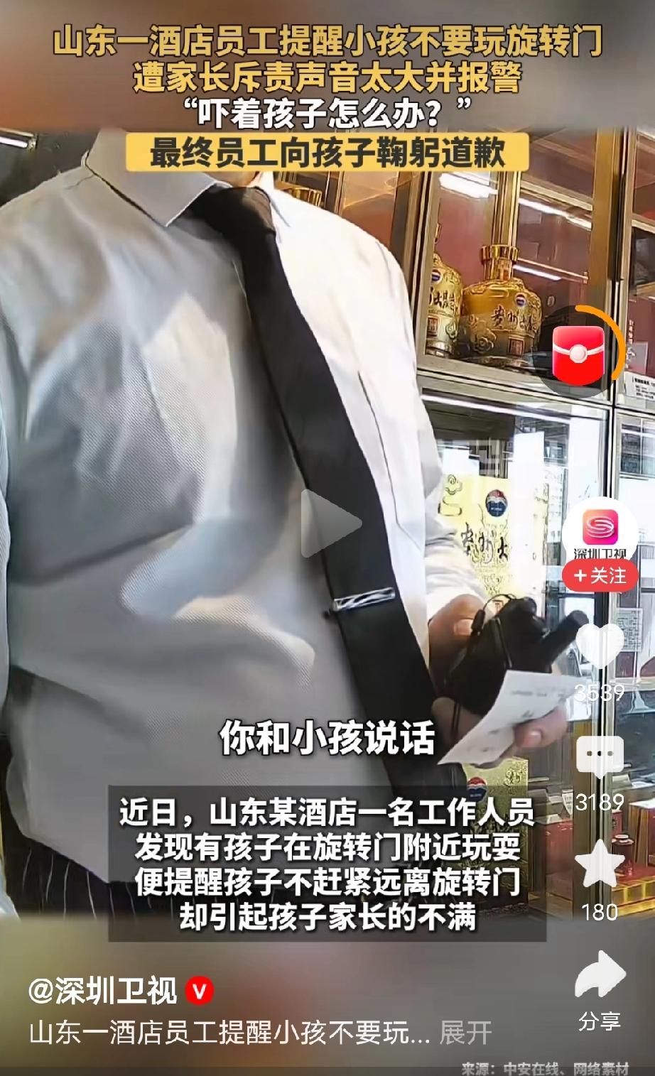 山东,男服务员突然看到几个孩子在玩旋转门,他赶紧上前制止,不料,孩子父亲冲过来直接大骂,说服务员声音大,吓着孩子了,报警处理,民警来到后,服务员跟几个孩子弯腰鞠躬道歉,网友:没有熊孩子,只有熊父母。 一名男服务员正站在服务台,认真接待顾客,不经意间,他突然听到酒店门口传来嬉戏打闹声,循着声音看过去,4个孩子在旋转门处玩得正嗨。 几个孩子,一个推着旋转门,另外几个拼命地跟着旋转门不停地跑,玩得很起劲,其中有一个孩子因为跑得太快还摔跤了,幸亏他起身及时,要不被旋转门压到,肯定得吃痛或者受伤。 服务员看到这一幕赶紧冲几个孩子喊道:“小朋友,不能这么玩,小朋友快出来。” 服务员本是好意提醒,他是怕孩子摔倒受伤了,而且但凡是一个有责任心的大人经过都会提醒孩子注意安全。 没想到,孩子父亲却不这么认为,他不但没有意识到随时可能会出现的危险,放任孩子不管,服务员提醒后还遭他吼骂。 服务员的话声未落,孩子父亲直接骂道:“你和小孩说话,你怎么不小声点,吓到孩子怎么办?” 服务员解释说,这么玩很危险,主要是担心孩子受伤。 可孩子父亲并不接受服务员的解释,声声都在质问服务员,和小孩子说话为什么不小声一点,为什么声音这么大,吓着孩子怎么办,你看看你这是什么毛病? 服务员跟那位父亲道歉说,是我们不对,主要是看到孩子在玩那个门,情况紧急随口就说出来了,并没有恶意。 可孩子父亲不依不饶,即便服务员跟他道歉了,他还是选择了报警。 不久后,民警来到了,孩子父亲说服务员提醒的声音太大了,给孩子的心灵造成了创伤,民警了解情况后,对双方都做了批评教育。 当着民警的面,服务员给孩子深深地鞠躬道歉。 这个视频发出来后,网友纷纷表示,服务员的声音是正常的,并没有显得很大声,反而是孩子的父亲那凶巴巴的声音有可能会吓着孩子。 笔者听了也认为,服务员那只是善意提醒,虽然服务员的声音有点大声,但是并不凶,再说了,如果他只是小小声提醒,孩子也听不到啊。 有人说只有熊父母,没有熊孩子。这位父亲任由孩子在公共场合打闹玩耍,且不说是否影响他人通行,单是这般放任不管,就不怕孩子出事吗?他平时的教育,实在让人堪忧。 孩子本身不懂事,在旋转门追逐打闹本就十分危险,服务员及时制止完全是出于好心,更是对孩子安全负责。 可这位父亲不仅不领情,反而倒打一耙,揪着声音大小不放,甚至闹到报警,逼着服务员鞠躬道歉,实在让人难以理解。 真正吓到孩子的,从来不是善意的提醒,而是家长不分青红皂白的暴躁态度。家长不教孩子守规矩、懂安全,反而纵容溺爱,将来孩子走到社会上,迟早要吃更大的亏。 不少网友看到这一幕也忍不住猜测,这位父亲如此反常地护短、刻意无视危险,是不是存了别的心思,甚至想等孩子真出了事,反过来讹酒店一笔钱。 不少网友看到这一幕也忍不住猜测,这位父亲如此反常地护短、刻意无视危险,是不是存了别的心思,甚至想等孩子真出了事,反过来讹酒店一笔钱。那么,从法律角度如何看待呢? 依据《民法典》第1188条规定,无民事行为能力人、限制民事行为能力人造成他人损害的,由监护人承担侵权责任,监护人尽到监护职责的,可以减轻其侵权责任。 本案中父亲明知旋转门危险却放任孩子追逐玩耍,完全没有尽到监护义务,一旦孩子受伤,主要责任应由这位父亲承担。 《民法典》第1198条规定,宾馆等经营场所的经营者未尽到安全保障义务造成他人损害的,应当承担侵权责任。 本案中,服务员已及时制止危险行为,酒店尽到了提醒与劝阻义务,不存在过错,无需承担赔偿责任。 如果家长故意纵容孩子涉险再恶意索赔,不仅不会得到法律支持,情节严重还可能涉嫌敲诈勒索,承担相应法律责任。