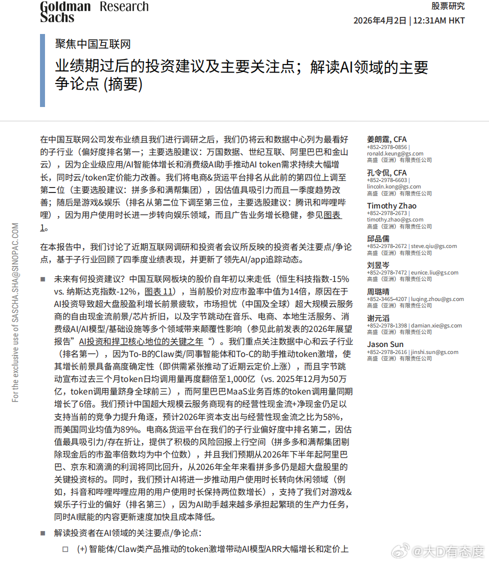 高盛发布一份中国互联网公司的深度报告,这些阿里字节腾讯似乎正处于一个微妙的转折点。恒生科技指数在过去一年表现疲软,这种让人嘘嘘的跌幅中,原有生意模式、Token竞赛与生存空间的重构正在加速。大D聊聊天
