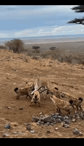 一群鬣老二围捕羚羊,羚羊逮住一只鬣老二往死里薅,其他鬣老二瞬间散去。