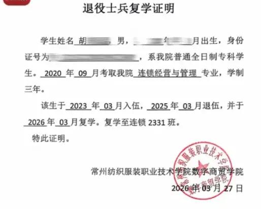 当兵两年回来,发现自己的专业“蒸发”了!这不是段子,是江苏常州一位退伍大学生的真实遭遇。 胡同学2020年考入常州纺织服装职业技术学院,大三时毅然参军。两年后光荣退伍,准备回校拿毕业证,却被告知:你学的连锁经营管理专业,2022年就停招了。 学校最初方案很“常规”。转去市场营销专业,补修课程。这意味着毕业要延迟,还得从头适应新专业。胡同学当场懵了!我为国服役,专业没了却要我买单? 这事经《政风热线》曝光后,学校态度180度大转弯。3月27日,校方为他办理复学,承诺按原专业培养方案完成学业,安排老师一对一辅导,最快今年6月就能拿到毕业证。 表面看是个圆满结局,但细思极恐!如果没有媒体介入,这位退伍兵会不会被迫转专业、延迟毕业? 更深层的问题是,这不是个例。近年来全国高校撤销专业超1.2万个,管理类,文科类占43%。专业调整本是常态,但那些正在服役或保留学籍的学生,他们的权益谁来保障? 《退役军人保障法》第36条明确“不得因专业调整增加退役学生学业负担”,可具体怎么落实?很多学校压根没预案。 胡同学是幸运的,他等来了“特事特办”。但教育不该总靠“特事特办”,更需要制度化的保障。那些默默服役的学子,不该为学校的专业调整买单。 高校要有担当,更要有温度。专业可以撤销,但对学生的承诺不能“撤销”。