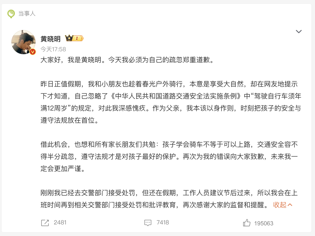 黄晓明已去交警部门接受处罚 黄晓明就带9岁儿子骑行道歉,表示已去交警部门接受处罚。 黄晓明就带娃骑行道歉