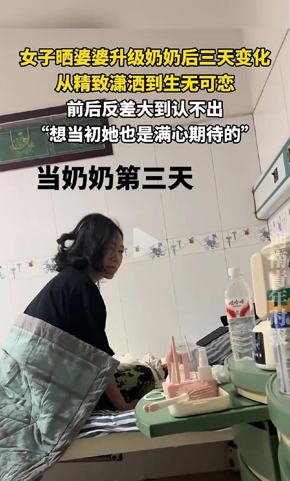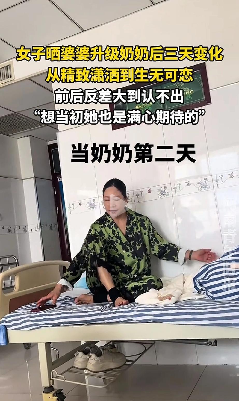 笑不活了!一名女子在网上晒出自家的婆婆——升级当奶奶前,婆婆打扮精致、精神抖擞,走哪都是气质阿姨;没成想才带娃三天,整个人就完全变了样:头发乱了、眼神空了、笑容没了,一脸“生无可恋”。网友:这眼神,明年还得添口人! 说白了,这就是“带娃前 vs 带娃后”的真实写照。没带孙子的奶奶,是岁月静好的女神;带了三天的奶奶,是被生活“捶打”过的普通老太太。 第一天,婆婆刚升级当奶奶,高兴得合不拢嘴。穿着整齐,头发梳得一丝不苟,脸上带着笑,抱孙子那叫一个精神。 心里想的可能是:哎呀,小宝贝真可爱,奶奶好好疼你。 第二天,婆婆头发有点乱,衣服也不那么讲究了,眼神里透着一丝疲惫。孩子哭、换尿布、喂奶、哄睡……这一套流程下来,比上班还累。 关键是,晚上睡不好觉啊!小宝宝两三个小时醒一次,奶奶哪还有时间打理自己? 到了第三天,婆婆,头发随便扎着,脸上没妆了,眼神空洞,坐在那儿就像被抽空了一样。 网友形容得特别到位:“从精致潇洒到生无可恋”。这哪是带孙子,这是被孙子“带走了”精气神啊! 说白了,带娃这事儿,谁带谁知道。看着软乎乎的小宝宝,抱一会儿是享受,抱一天就是体力活。 喂奶、哄睡、换尿布、洗衣服、还要陪着玩……三天下来,别说六十岁的婆婆,就是三十岁的年轻人也得喊累。 也有网友说:“她好像在骂自己,奶奶个腿的哟” 这条把我看笑了。 可不是嘛,奶奶嘴上不说,那个表情分明在说:“我当年带儿子都没这么累,现在又来一个!” 但你说她不疼孙子吗?当然疼。就是累到极点,只能用眼神“骂”两句自己。 还有网友说:“现在生孩子的人少了,带孩子都能多睡一张床,我生孩子的时候人多的差点睡走廊。” 以前生孩子扎堆,现在人少了,床位宽了,但带娃的累一点没少啊!该熬的夜、该起的床,一个都逃不掉。 最损的是这条:“就这眼神,来年高低再给她添口人” 哈哈,网友这是存心气奶奶呢!奶奶好不容易熬过三天,你还要再来一个?不过说真的,这条评论也反映出不少家庭的现实:一个娃已经让老人累趴,再来一个,真不知道该怎么办。 很多家庭现在都这样:年轻人要上班挣钱,带娃的任务就落到了老人头上。 可老人年纪大了,体力跟不上了,带娃又是个24小时在线的活儿。时间一长,老人身体吃不消,心情也好不到哪去。 咱们得换位思考一下: 如果你六十岁了,天天睡不好觉,腰酸背疼还得追着孩子跑,你还能精致得起来吗?那个“生无可恋”的表情,不是矫情,是实实在在的累。 别把带娃当成老人的“义务”。年轻人下班了、放假了,多搭把手,让老人歇一歇。该请保姆就请,该送托班就送,别把所有担子都压在老人肩上。 她可以不来的,但她来了;她可以喊累甩手的,但她咬牙坚持了。那个疲惫的眼神里,有无奈,更有心甘情愿的付出。 一家人,互相体谅,日子才能过得下去。 毕竟,奶奶的“生无可恋”,最后换来的,是一个家庭的新生和希望。这份辛苦,值得被看见,更值得被心疼。