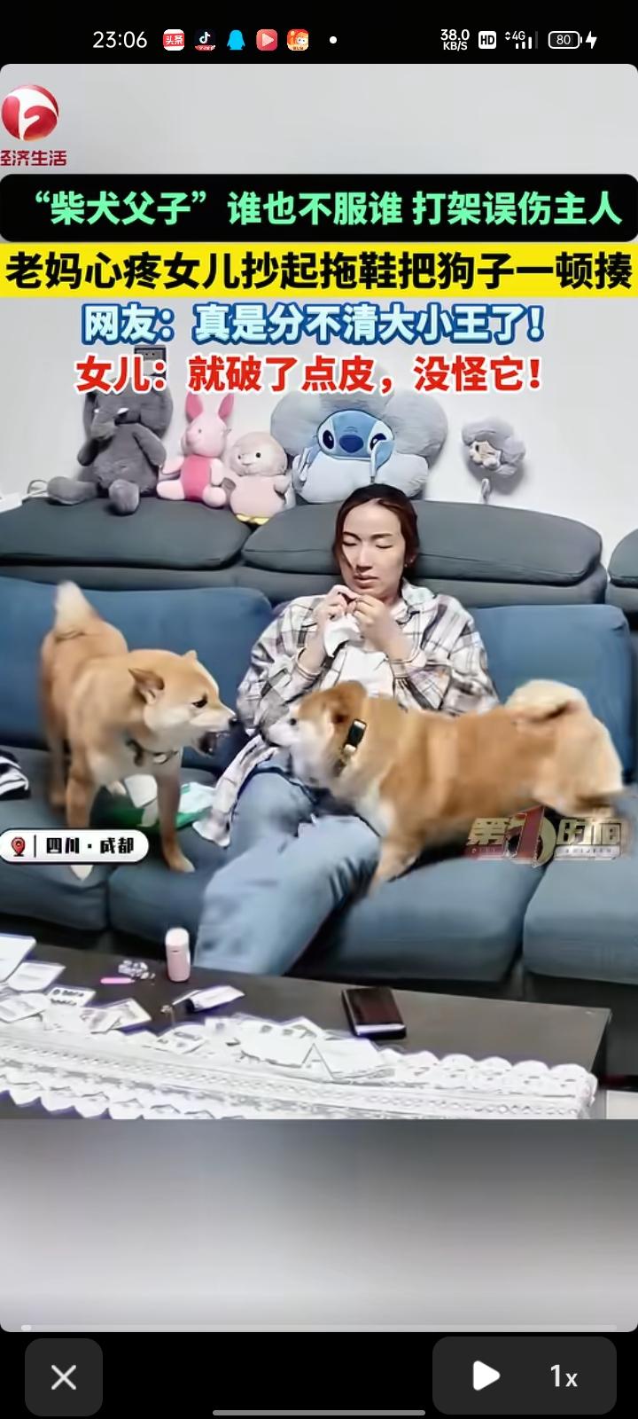 3月27日,四川成都。监控画面显示,女子坐在沙发上,两只柴犬在沙发上打架,不慎咬到女子的裤子,母亲看到后抄起拖鞋对柴犬一顿打 当事人钟女士称,误伤咬到她的狗狗五岁了,另外一只三岁,它俩是父子关系。虽然有和谐的时候,但谁也不服谁,基本上每天都吵架。当时狗狗不是故意的,可能是应激或情绪肾上腺素爆棚。没什么事,只是破了点皮