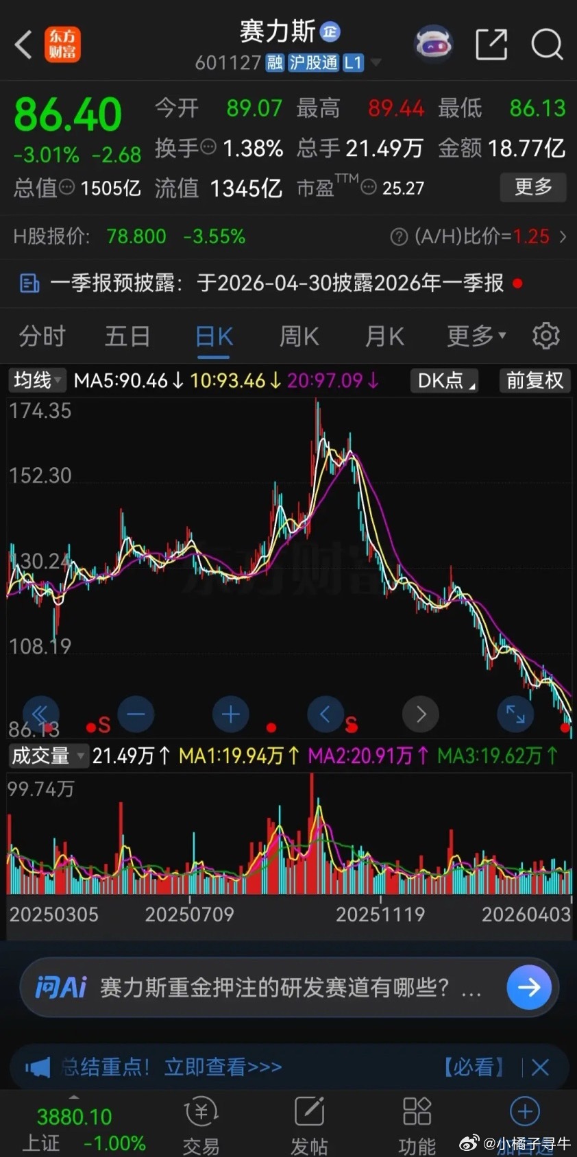 赛力斯,以前叫小康股份,后来被华为看上,2022年时改名为赛力斯。而从2020年至2023年,公司业绩持续大亏,这四年累计亏损超过98亿元。神奇的是从2020年亏损的那一年起,公司股价就开始一路大涨,当时是从7块钱左右涨到了2021年的82元,上涨了十多倍。