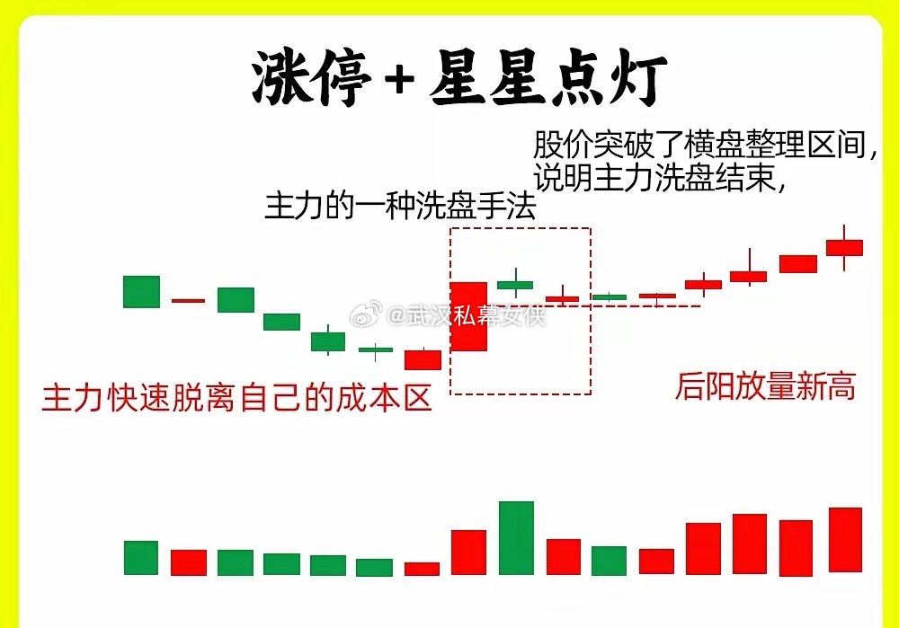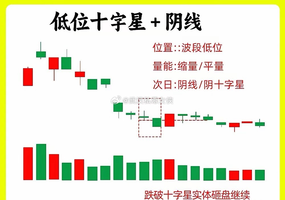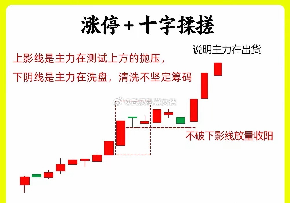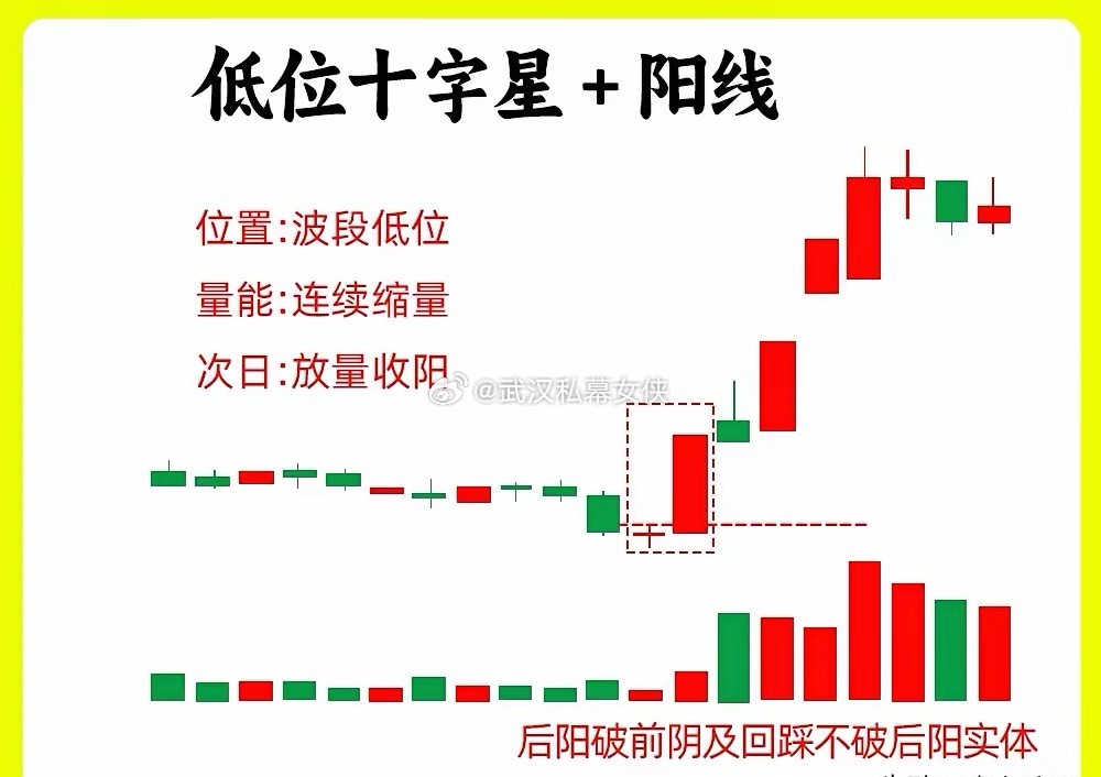 注意了!市场流传这一句话,炒股不看十字星,再炒十年也枉然。十字星代表着市场处于一个平衡,但是他的出现的位置和组合形态,代表意义有所不一样的。所以今天女侠一次性分享六种十字星组合形态,可以说,一般人都没怎么注意过。还是老规矩,点赞收藏或评论六六六支持一下,女侠每天分享炒股干货,以免以后想温习找不到了一、低位十字星 + 阳线算是加强版的早晨十字星,股价在低位形成一个十字星以后,次日股价出中大阳线,突破十字星的最高价,这有一个细节,成交量必须是放量,说明市场从十字星的多空平衡,变成的多方力量比较强的一个变化。随后股价突破以后,并没有重新回到十字星附近。会更可靠二、低位十字星 + 阴线股价在低位出现十字星,次日股价走出一根阴线,股价跌破了十字星的最低价。说明此时的承接力量很弱,股价多空平衡到空方力量强的一个过程,,此时成交量的放大或是缩小,就比较重要了。一般走出这样的组合形态,会是在下跌趋势的,或是下跌趋势的中继阶段三、上涨趋势十字星 + 阳线股价在上涨趋势里,股价上涨以后回落出现十字星,这往往是主力洗盘的末期,抛压变的很小,市场处于平衡,股价再次出现阳线,突破十字星的最高价。说明主力洗盘结束。一般股价回调的阶段,不会跌破重要的均线四、上涨趋势十字星 + 阴线股价在上涨趋势的里,出现十字星,次日出现阴线,同时成交量出现放大,股价跌破五日均线或是十日均线,说明此时市场情绪从平衡变成空方力量,尤其是股价已经在高位,直接已经经历大幅上涨以后,所以成交量放大,就要谨慎了五、涨停 + 十字揉搓股价首先是出现一根实体涨停板,随后的几天里,出现十字星或是挼搓线,这个我相信大家都知道。涨停板是主力强势启动,随后的揉搓线是主力试盘和洗盘。上影线是向上的试盘,测试上方的抛压,下影线是测试下方承接力量。而且这个有一个细节就是,涨停以后十字星,一定是要缩量盘整的。如果成交量放大,那就要小心了好了!以上就是十字星的几种组合形态。下方我准备了案例图,建议牢记在心里。希望对大家有启发,也是最为基础的内容,一定吃透。