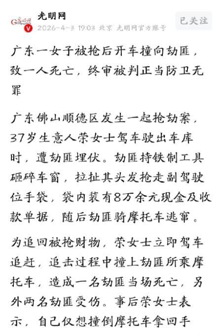 判得漂亮!广东佛山,37岁女子开车刚出地库,突然蹿出来三个男子,一个举着铁具砸烂了她的车窗后,死死的拽着她的头发,另一人抢走她放在副驾的手提袋,里面有8万块钱现金和一些收款单据,然后骑着摩托扬长而去。 清晨的玻璃一声脆响,车窗碎成渣,头发被死死拽住,副驾上的包被拎走,劫匪骑着摩托一溜烟跑了,女子一脚油门追上去,路口相撞,1死2伤,这样的追,算不算过头? 她37岁,个体经营者,2024年10月的那天,凌晨5点从银行取出82600元,包里还塞着合同和欠条,7点货车司机要到仓库,她必须把钱备好,这段路她每天都走,熟得闭眼都行。 三个男人提前踩点,躲在小区车库出口到主路的拐角,手里抡着铁具,往副驾和驾驶位玻璃就是猛砸,碎片飞溅扎人,手伸进窗里揪着她的头发往下摁,几十秒内包到手,跳上无牌摩托就跑。 换成你,先报警还是先检查伤口?她没时间权衡,包里不只是钱,是生意的命根子,丢了就断供,违约金跟着来,店也可能垮,她只能追。 追到一个十字路口,摩托闯红灯冲了过去,她车的右侧剐到了对方,摩托翻滚,三人被甩出去,其中一人当场没了气息,另外两人受伤倒地,这一幕让人后背发凉。 她立刻停车,掏手机连打120和110,站在原地等警察,没跑,也不敢跑,她知道自己没做错,跑了才心虚。 警方调取沿途监控,确认这伙人事先盯梢,是冲着她来的,行车记录仪显示她追击时保持距离,碰撞发生在对方闯红灯之后,她反复说,自己只有一个念头,把包拿回来,没想伤人。 案子一出来,网上炸了锅,大家都在问,抢劫犯已经逃走了,还能追吗?追的过程中出了人命,这口锅要不要她背? 起初,检察机关以过失致人死亡提起公诉,意思是你追太猛导致死亡,要担责,舆论一下紧了起来,不少人担心又要被判成“防卫过当”。 庭审上,律师据理力争,抢劫还在持续,钱在贼手上,侵害就没结束,追击是为了夺回合法财产天经地义,碰撞根源在于对方闯红灯,不能把后果全压在受害者身上。 关键的变化出现在二审,佛山中院作出了让人拍案的判词,推翻了一审对其不利的看法,认定她的行为属于正当防卫,不负刑责,死者家属的索赔被驳回。 判词抓住两点,一是侵害未止,追击就是在制止不法,财物在贼手里,侵害就在线,二是不苛求普通人在惊恐中拿捏“力度”,不要求她像冷静的特种兵,精准打掉车轮,这不现实。 更重要的是,法院明确碰撞由劫匪闯红灯引发,她没有蓄意以车为武器冲撞,这句话重重落下,法不能向不法让步,不能让好人背黑锅。 刑事判决同样给力,两名活着的劫匪因抢劫罪被判十年以上有期徒刑,并处罚金,他们还要承担她车辆的修理费,死者家属试图索赔,一分钱没拿到。 网络上一片叫好,留言铺天盖地,有的说这回站在了正义这边,有的说心里这口气顺了,法律不是用来吓唬被害人的。 她也松了口气,那段日子她每天心跳加速,怕生意垮,也怕坐牢,判决一出来才睡了个踏实觉,她说当时就想把钱拿回来,没想杀人,这句话让人破防。 这案子为什么牵动人?因为太贴近普通人的恐惧和犹豫,遇到暴力,能不能硬一下?敢不敢追一下?会不会一追就摊上事? 问题在于,不能把案发后的平静推理强加到当场的惊慌里,要求一个被砸窗、被拽头发的人精算风险,这不人道,更不公平。 当然,这不是鼓励人人“飙车”,不是让人把路人置于危险之中,判决划出了边界,面对持续侵害,可以追、可以拦、可以夺回,前提是目标明确,尽力避免波及无辜。 说白了,这份判词给了普通人底气,也给了办案的尺子,不再把受害者放到被告席上接受二次伤害,不把法变成坏人的保护伞。 信源: 中国新闻网(中新网) 2009-03-26《女车主驾车撞死劫匪 法院称系正当防卫》