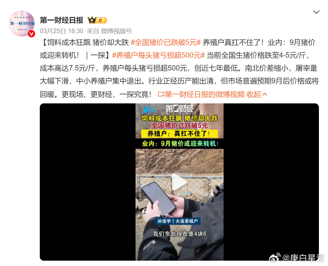 首先,咱们得弄明白一个词:“猪粮比”,养猪行业的一个关键指标。简单说,就是生猪出场价格和玉米批发价格的比值,行业公认的盈亏平衡线是6:1,也就是说,猪价至少得是粮价的6倍,你养猪才不亏本。现在的3.88:1,是个什么光景?咱们算笔账,猪饲料主要原料玉米,价格在1.2元/斤,再加上豆粕、预混料,全价料在1.8元/斤左右,饲料占总成本65%–70%,算下来自繁自养完全成本11.5–12.5元 /公斤,外购仔猪完全成本还要再加1–2元/公斤。按目前9.6元/公斤的生猪均价,单头110kg标猪亏损普遍在300左右,外购仔猪能亏到500块。卖一头亏一头,还只能接着卖,为什么?因为猪养在圈里,它每天都要长肉,长肉就得吃饲料,你晚卖一天,饲料成本就多烧一天。