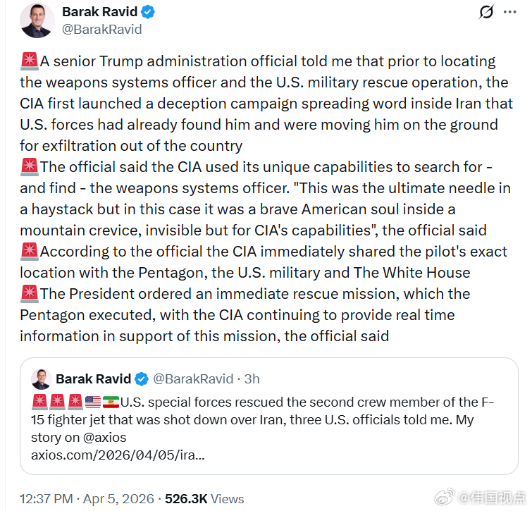 🚨该官员还表示,总统随即下令展开紧急救援任务,由五角大楼执行,而CIA在整个行动过程中持续提供实时晴报支持。