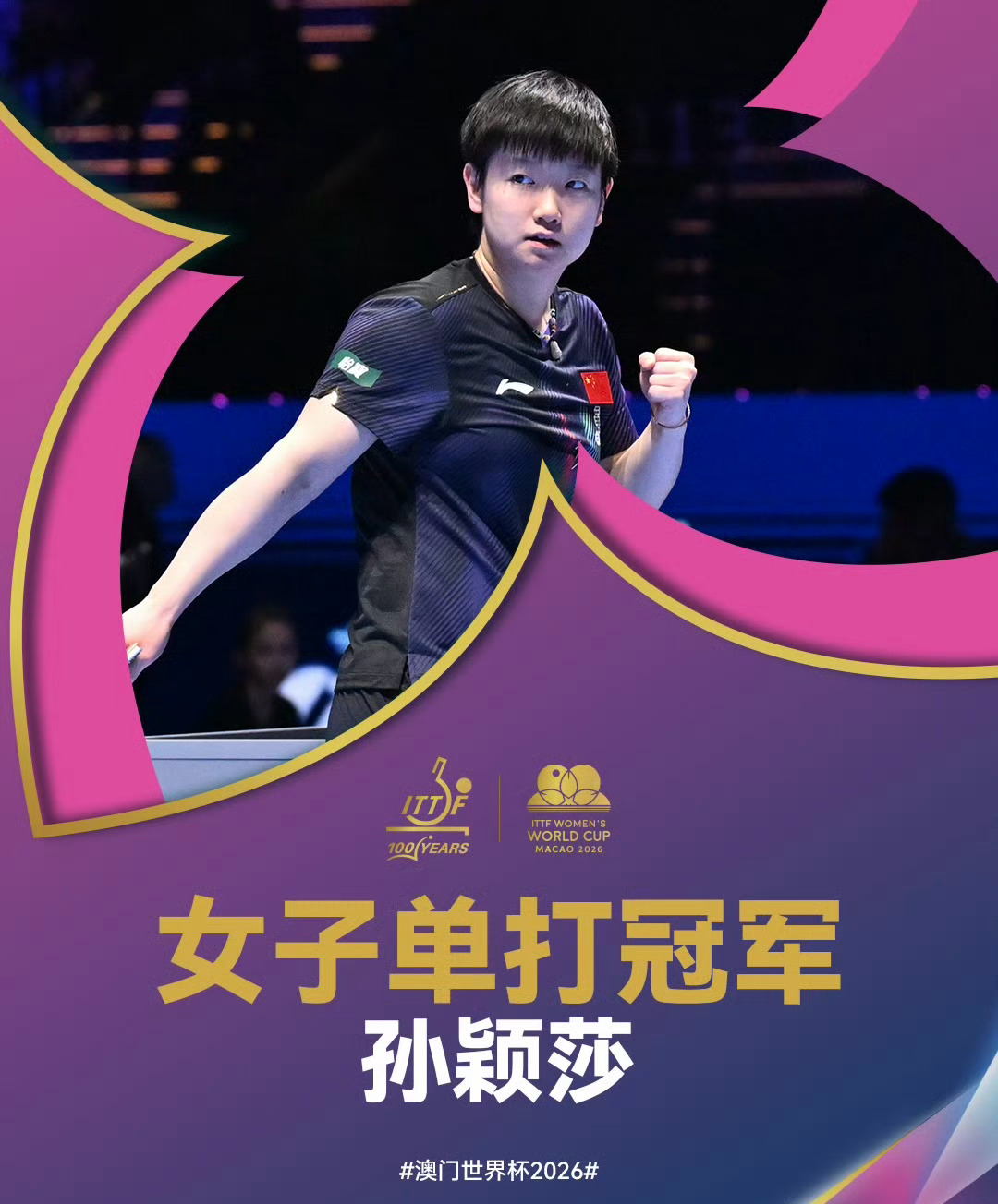 恭喜孙颖莎拿下2026澳门乒乓球世界杯女子单打冠军 🏆 女子单打世界杯历史首位