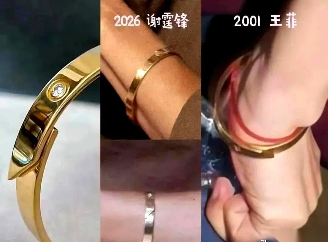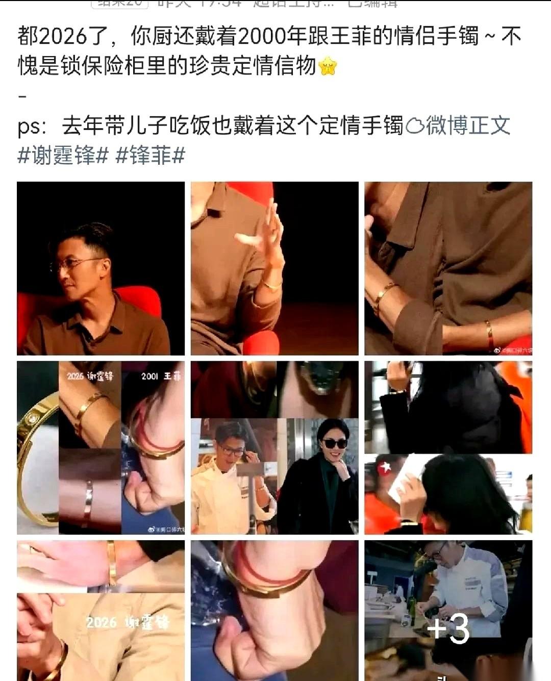 谢霆锋王菲这事儿,全藏在一只手镯里。 4月4号,谢霆锋去港大,一身西装,戴副金丝眼镜,手腕上一道金光。有人直接把照片放大——那不是二十多年前,他和王菲的定情手镯吗? 2000年,俩人热恋,亲手用螺丝刀给对方锁上这只镯子,意思是,这辈子就你了。 后来,一拍两散。他一声不吭,把这镯子扔进保险柜,合上门,一锁就是十几年。 那十几年里,他结婚,生子,再离婚,保险柜的门,就没开过。里面黑漆漆的,只有那只镯子,和他锁起来的一段过去。 直到2014年,俩人复合的消息刚传出来,他做的第一件事,就是拧开那个尘封的保险柜,拿出那只依然锃亮的手镯,重新卡回到自己手腕上,再没摘下来过。 演唱会上,底下粉丝举着“锋菲”的灯牌,他站在台上,灯光一晃,嘴角的笑藏都藏不住。有一次灯牌举反了,他还偷偷在台上打手势提醒,底下的人瞬间就炸了。 他什么都没说,但手镯替他说了。 有些人嘴上天天挂着我爱你,有些人,是把一个人的印记,锁进保险柜十几年,拿出来,掸掸灰,继续戴一辈子。