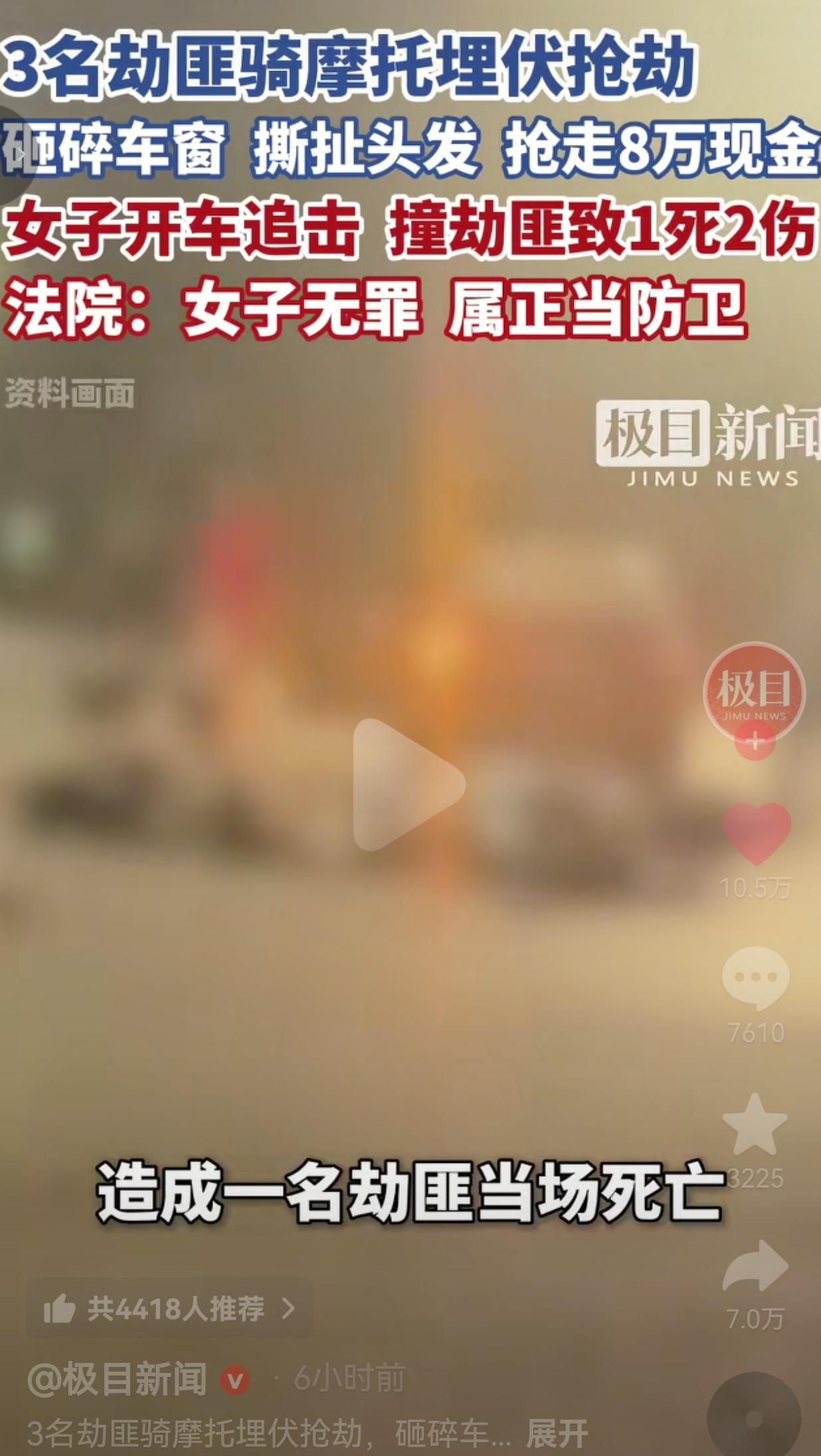 太解气了!3个劫匪骑摩托埋伏抢钱,砸车窗、扯头发、抢8万现金,女子开车追击撞劫匪致1死2伤,法院直接判无罪!而另外两名劫匪均被判刑!网友:这才是老百姓要的正义! 事情是这样的:广东佛山顺德区,一位37岁的荣女士刚开车驶出车库,就被3个早就埋伏好的劫匪给盯上了。 这三个亡命徒直接骑摩托围上来,手里拿着铁制工具,哐当一下就把副驾驶的车窗给砸得稀碎!荣女士当时整个人都懵了,还没反应过来,劫匪就伸手拽她的头发,硬生生把副驾上装着8万多现金的手袋给抢走了! 要知道,这8万不是小数目,可能是荣女士一家的积蓄、生意周转的钱,甚至是救命钱!换谁能眼睁睁看着自己的钱被抢?荣女士当时就怒了,根本没顾上害怕,挂挡踩油门就追了上去! 劫匪抢了钱就骑摩托疯狂逃窜,荣女士在后面紧追不舍,直接开车撞上了劫匪的摩托车!这一下,当场撞死一个劫匪,另外两个也受了重伤。 事后,这个案子送到了顺德法院,所有人都捏着一把汗:女子开车撞劫匪,会不会算防卫过当?会不会要坐牢?结果法院一审直接认定:荣女士的行为属于正当防卫,无罪,无需承担刑事责任! 更解气的是,那两个受伤的劫匪,直接被法院分别判处有期徒刑12年和11年!而且这个判决二审也维持了原判,彻底钉死了! 消息一出来,全网直接炸了! 网友评论区直接沸腾,全是叫好声! 有的网友说:判得好!这要是判有罪,以后谁还敢反抗?劫匪抢钱的时候怎么不想想后果?si了也是活该! 也有的网友说:支持荣女士!换我我也追!8万啊,那是血汗钱!劫匪就是活该,死一个少一个祸害! 还有的网友说:太解气了!以后坏人就该知道,不是谁都能随便欺负的!自己做的恶,自己买单! 也有的网友说:劫匪抢劫的时候是暴力犯罪,追击过程中犯罪还没结束,撞他就是正当防卫!没毛病! 说实话,我看完这个案子,眼泪都快出来了! 这些年我们看了多少防卫过当的案子?多少人在被欺负、被抢劫的时候,不敢反抗、不敢还手,就怕还手了自己要坐牢!多少好人因为反抗坏人,最后落得个防卫过当的罪名,寒了多少老百姓的心! 但这次,法院终于站在了老百姓这边!法院说得明明白白:劫匪抢劫后,尚未脱离被害人视野,抢劫行为仍处于正在进行中!荣女士的防卫行为完全符合刑法规定! 荣女士做错了什么?她只是在自己的财产被暴力抢劫的时候,奋起反抗,追回自己的钱!劫匪是暴力犯罪,在抢劫的过程中,哪怕是逃跑,犯罪行为都没有终止!荣女士开车追击,就是为了阻止劫匪逃跑、追回自己的财产,这就是妥妥的正当防卫! 有人说,至于撞死吗?我就想问一句:劫匪砸车窗、扯头发、抢8万现金的时候,怎么没想过“至于吗”? 他们拿着工具抢劫的时候,有没有想过荣女士的生命安全?如果荣女士不追,这8万就没了,劫匪还会去抢下一个人! 死一个劫匪,救了多少可能被抢的普通人!这就是以暴制暴吗?不,这是正义的反击!是老百姓对暴力犯罪最有力的回击! 我们总说,法律是保护好人的,不是保护坏人的!这次顺德法院的判决,就是最好的证明!它告诉所有坏人:别以为你抢劫、作恶,就没人敢管你!老百姓有权利保护自己的财产和安全,法律会为正当防卫撑腰! 它也告诉所有普通人:当你遭遇暴力侵害的时候,不要怕,勇敢反抗!法律站在你这边! 正义或许会迟到,但绝不会缺席!当坏人举起屠刀的那一刻,就该想到自己会有什么样的下场! 永远记住:对坏人的纵容,就是对好人的犯罪! 信息来源:极目新闻