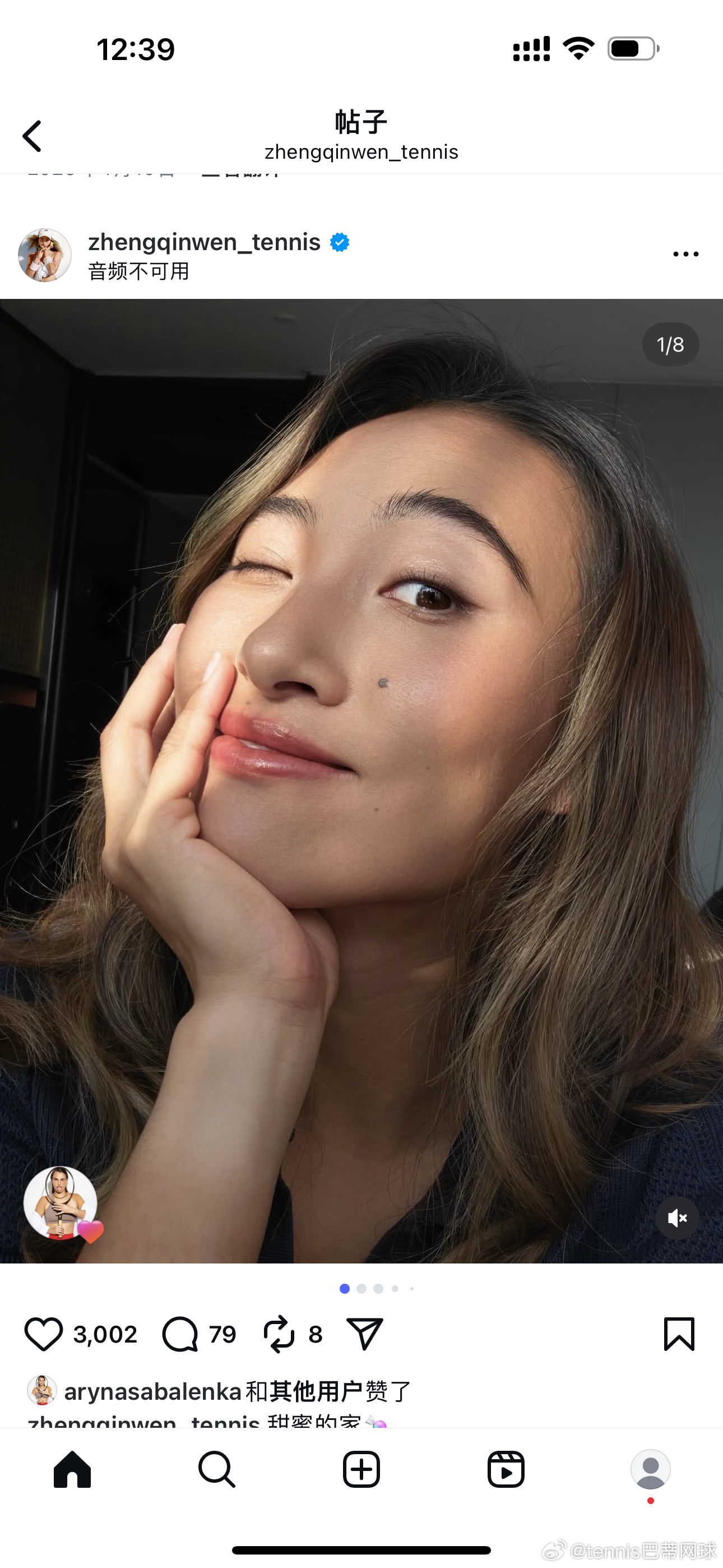 郑钦文🇨🇳ig发文,萨巴伦卡🇧🇾秒赞