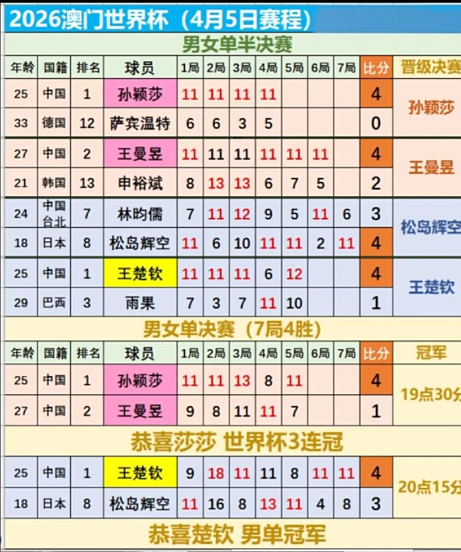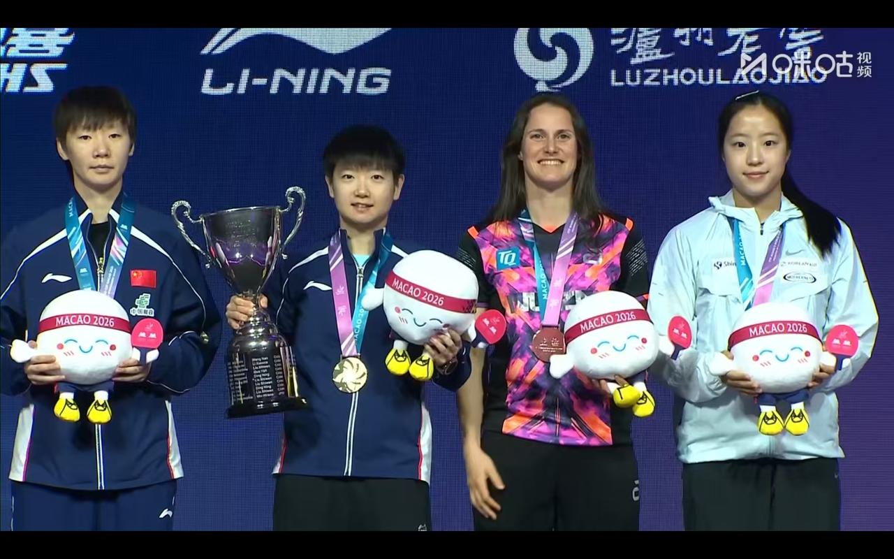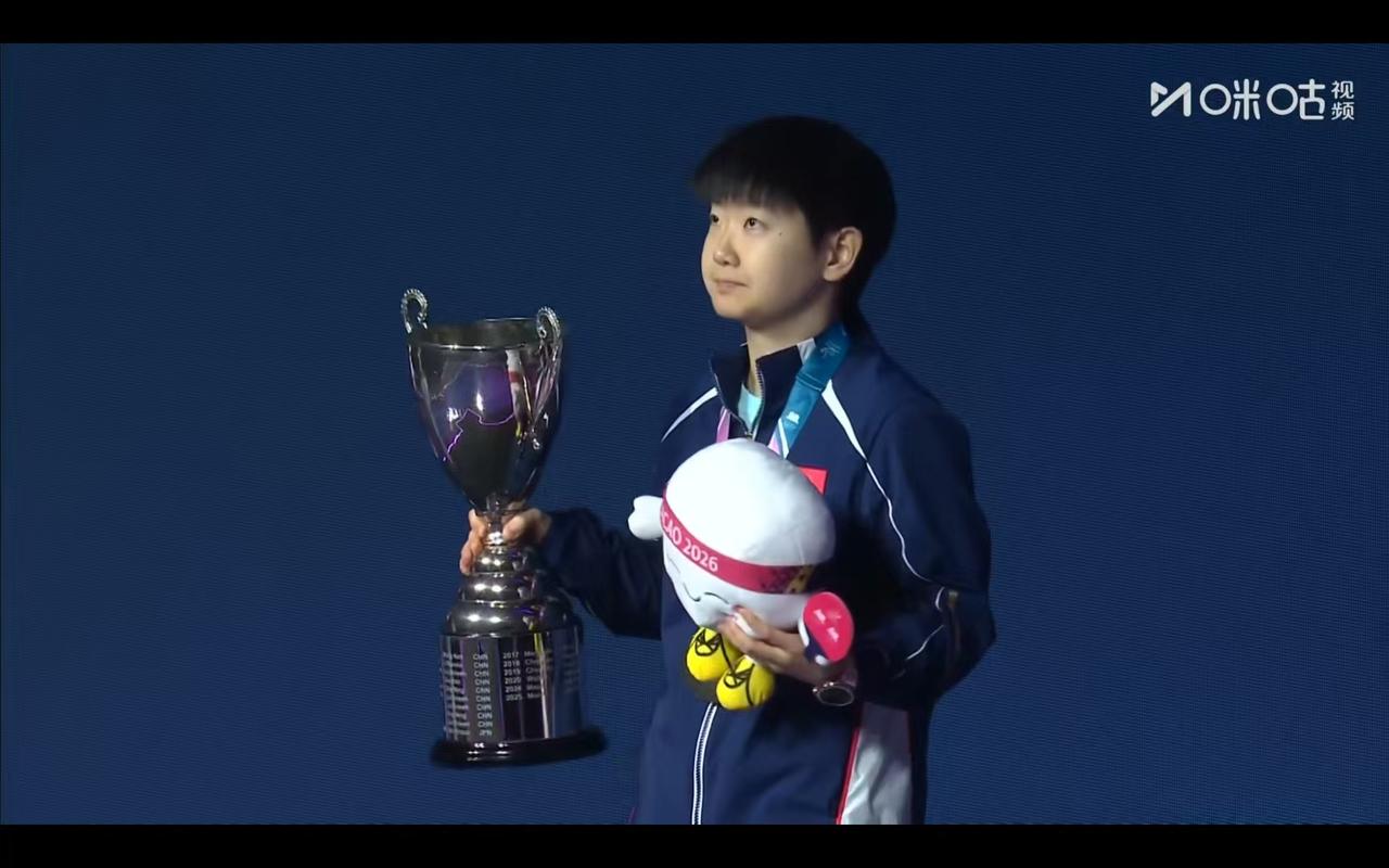 澳门世界杯孙颖莎夺冠,创造了乒乓球世界杯历史 4月5日,澳门乒乓球单打世界杯女单决赛,孙颖莎4:1王曼昱,孙颖莎夺冠,卫冕成功。 因为疫情,国际乒联乒乓球世界杯中断几年,自2024年乒乓球世界杯重新举办以来,孙颖莎蝉联了三次冠军。 2024年世界杯决赛战胜王曼昱夺冠;2025年世界杯决赛战胜蒯曼夺冠;2026年世界杯决赛再次战胜王曼昱夺冠。 在乒乓球世界杯历史上,国乒邓亚萍和王楠曾连续两次夺冠,孙颖莎是国女乒第一次世界杯三连冠,也是世界乒乓球历史上第一次女子三连冠,孙颖莎创造了乒乓球世界杯的历史。 澳门是孙颖莎的福地,连续三次在澳门夺冠。世界杯三连冠的孙颖莎可以把一个复刻的冠军奖杯带回家,永久珍藏。 主持人称赞孙颖莎:“你是冠军中的冠军,你创造了世界杯的历史!”