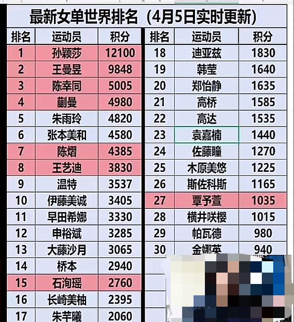 4月5日实时更新的乒乓球最新男单世界排名和最新女单世界排名! 最新男单世界排名: 第一名:王楚钦,11,725分。 第二名:莫雷加德,6750分。 第三名:雨果,6380分。 第四名:张本智和,6070分。 第五名:林诗栋,5755分。 第六名:小勒布伦,5720分。 第七名:松岛辉空,4630分。 第八名:林昀儒,4555分。 温瑞博第14名,梁靖崑第15名,向鹏第17名,周启豪、陈垣宇等也榜上有名。 王楚钦是遥遥领先,与排名世界第二的莫雷加德的积分拉开了将近5000分的差距,这差距,是天堑,短时间之内,难以超越。 最新女单世界排名: 第一名:孙颖莎,12,100分。 第二名:王蔓昱,9848分。 第三名,陈幸同,5005分。 第四名,蒯曼,4980分。 第五名,朱雨玲,4820。 第六名,张本美和,4580分。 国乒女单石洵瑶和覃予萱也榜上有名。 孙颖莎和王曼昱两人的积分遥遥领先,短时间之内难以超越。孙颖莎的积分排名世界第一已累计超过200周了,还将保持一段时间,真厉害!