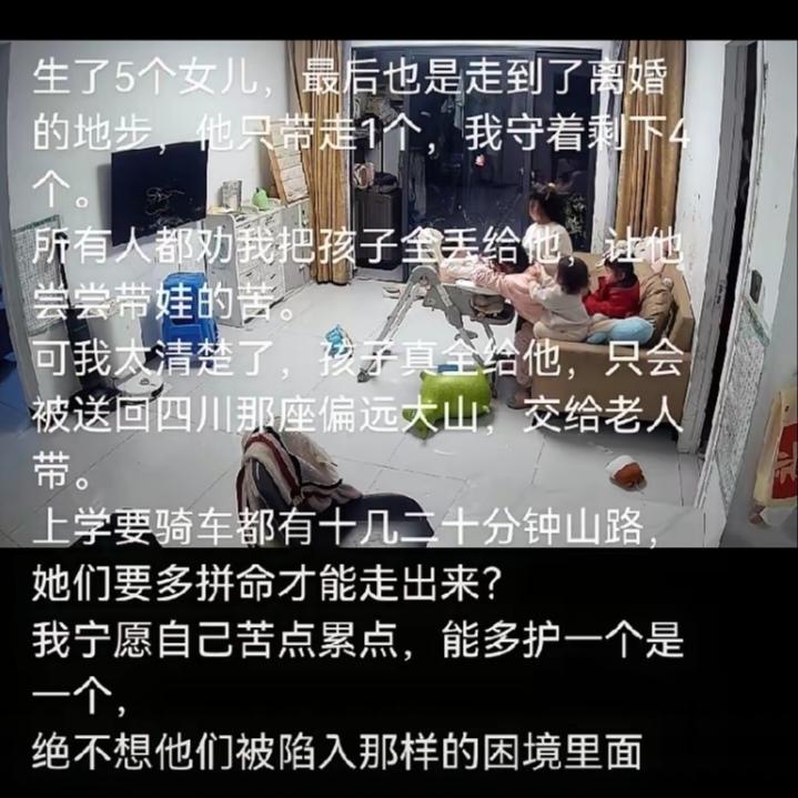 为母则刚!近日浙江,女子生了5个女儿,也没能改变和老公最终离婚的结局。离婚时她的老公只带走了12岁的大女儿。女子感慨道:"生了5个女儿,最终也是走到离婚对地步,他只带走1个,我守着剩下的4个。 所有人都劝我把孩子全都丢给他,让他尝尝带娃的苦。可我太清楚了,孩子真全给他,只会被送回四川那座偏远的大山,交给老人带。上学骑车都要十几二十分钟的山路,她们要多拼命才能走出来?我宁愿自己苦点累点,能多护一个是一个,绝不想他们被陷入那样的困境里面。" 看着这位妈妈的话,心里满是心疼又佩服。旁人劝她甩手不管,都是站在旁观者的角度出气,可当妈的哪舍得让孩子受那份罪。偏远大山里的日子有多难,她心里明镜似的,宁愿自己扛下所有辛苦,也不让女儿们困在山里没出路。 这就是实打实的为母则刚,眼下的苦和累都是暂时的,她陪着四个女儿好好长大,日子总会慢慢熬出头,好日子肯定在后面等着她们。 各位读者你们怎么看?欢迎在评论区讨论。