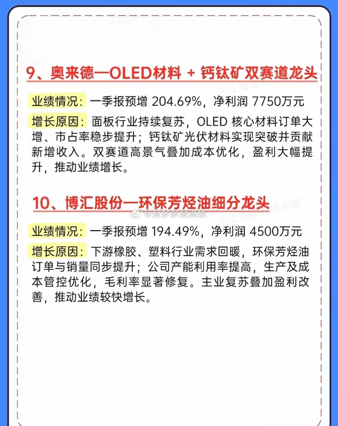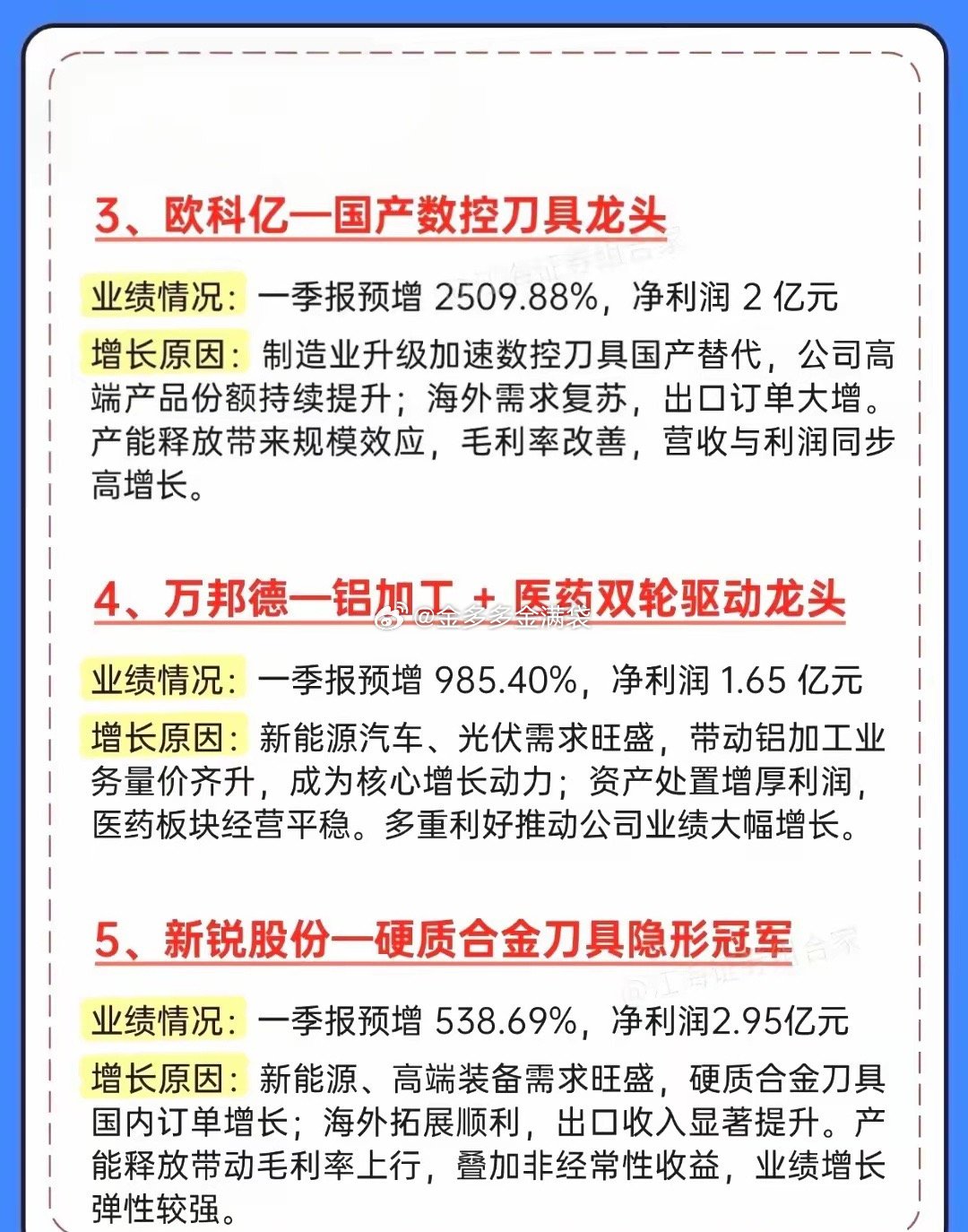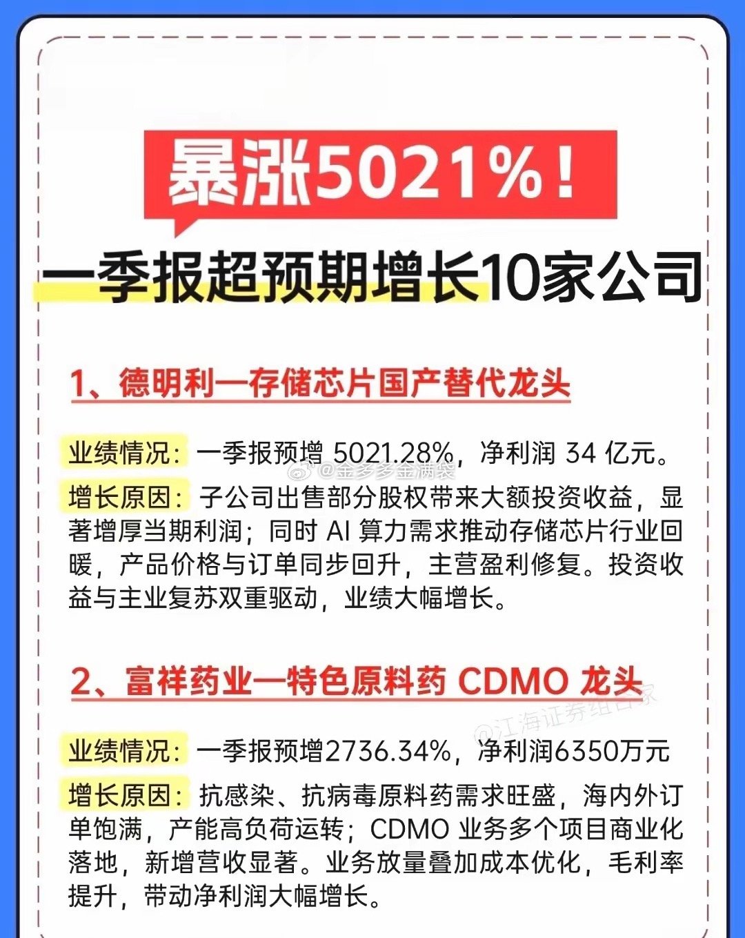 一季报大爆发!10家业绩暴增龙头全梳理,最高狂涨5021%!一季报行情正式打响!这份超预期增长名单直接封神,10家公司业绩集体炸裂,最高同比暴增超5000%,覆盖存储芯片、高端刀具、新能源、医药等多个高景气赛道,每一家都藏着业绩爆发的核心逻辑!德明利以5021.28%的增速一骑绝尘,存储芯片国产替代+AI算力需求双轮驱动,子公司股权出售更是给业绩添了一把火;富祥药业、欧科亿紧随其后,2700%+、2500%+的增速,分别在CDMO、数控刀具赛道实现国产替代与订单爆发。从万邦德的铝加工+医药双轮驱动,到新锐股份、华锐精密的刀具国产替代浪潮;从盛屯矿业的新能源金属周期上行,到福立旺的新能源车零部件放量;从奥来德的OLED+钙钛矿双赛道共振,到博汇股份的环保芳烃油复苏,每一家都踩中了行业景气度的风口。投资收益、主业复苏、国产替代、周期上行,多重利好共振下,这些一季报超预期的公司,正是当下市场最具确定性的方向。⚠️ 风险提示:以上内容仅为信息整理,不构成任何投资建议,股市有风险,入市需谨慎。