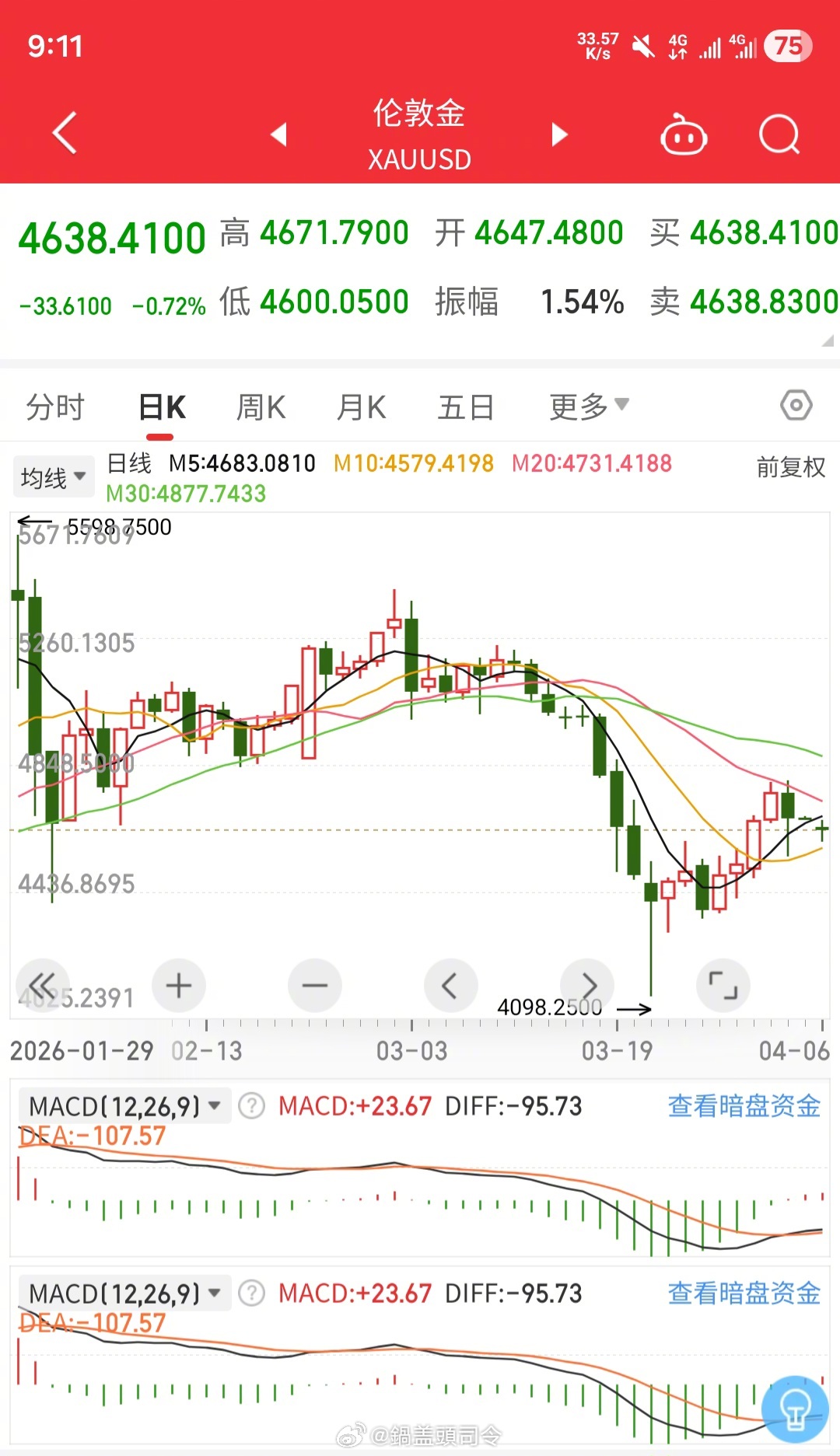 #黄金抛售潮#今天国际金价开盘还是跌。我最近把黄金都抛了,我感觉整体最近还是下跌趋势,毕竟霍尔木兹海峡局势也不明朗,美国怎么个策略还不知道,所以波动因素会比较大。所以可以等等,看看美国是打还是撤,如果撤了,那霍尔木兹正常化,可能黄金会涨,如果继续打,那必然封锁海峡,原油上涨,估计黄金还是个跌。大家最近买黄金了么?