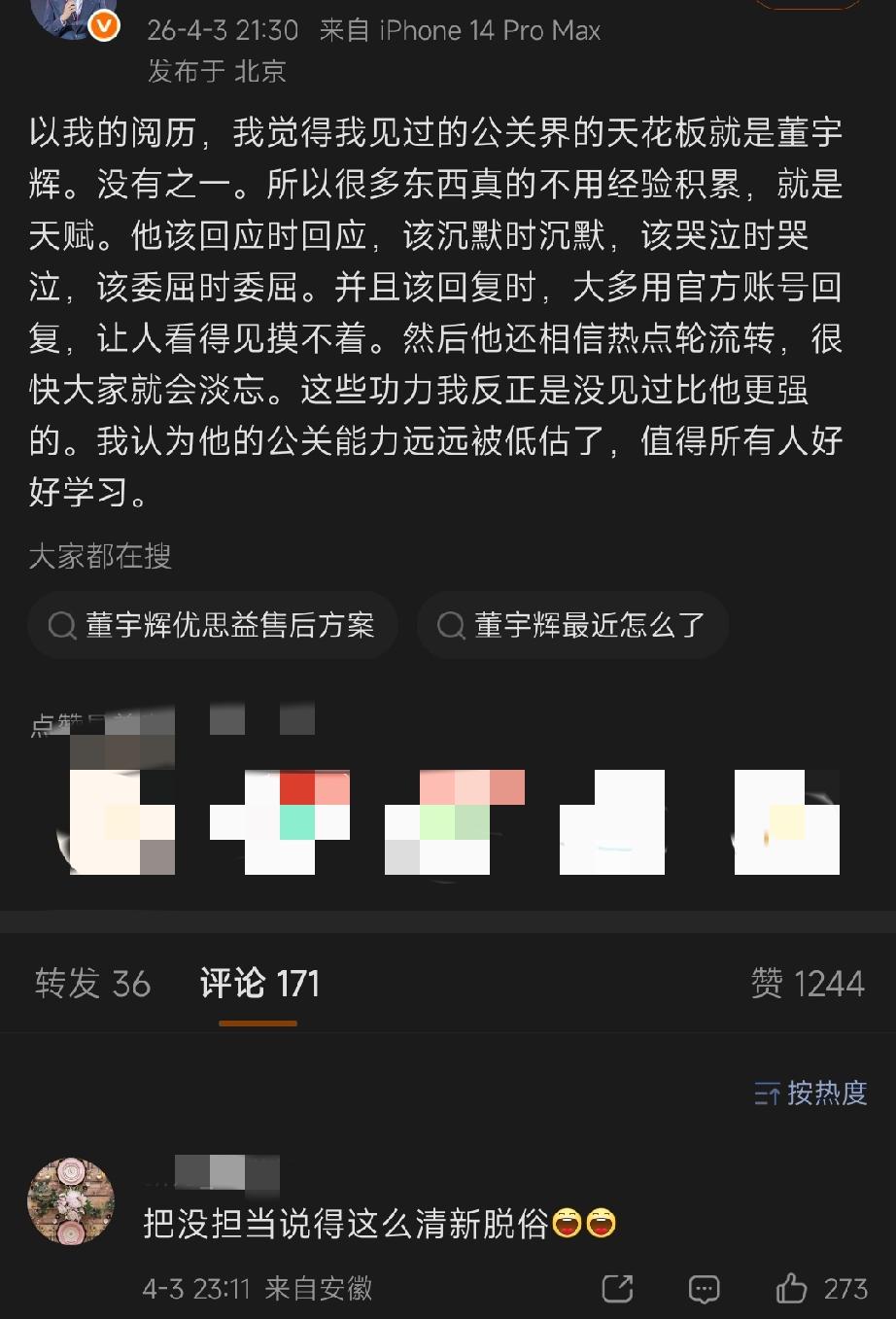 董宇辉就算不当网红,转行公关领域,也绝对是🔝级别的。 投资大佬都说了,董总的公关能力,自成一派,已经达到了天花板的水平。 公关手段变幻莫测,卖惨是最常用的,但人家也确实用的炉火纯青。 该沉默时沉默, 该回应时回应, 该哭就哭,该委屈就委屈, 这一套组合拳打下来,每次都能把他的买主们,哄得一愣一愣的。 无论翻车多少次,依旧心甘情愿的,一次又一次为他辩护,为他买单,还以此为荣。[鼓掌][鼓掌][鼓掌]
