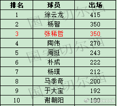 【国安职业联赛历史出场榜-张稀哲】 张稀哲在和辽宁铁人的比赛中首发出场,这是张