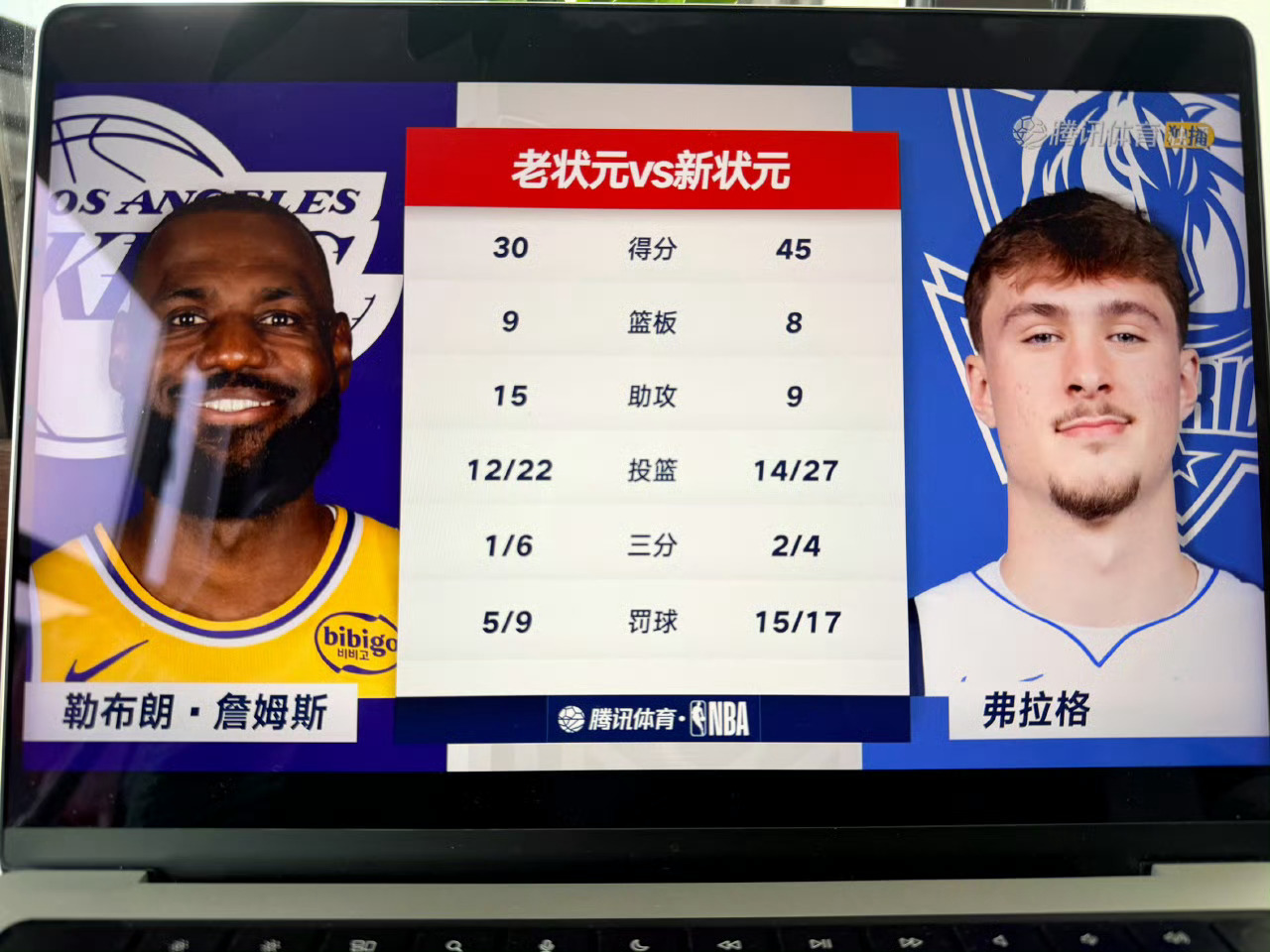 今日比赛詹姆斯和弗拉格数据对比:詹姆斯39分钟拿下30分9篮板15助攻,弗拉格3